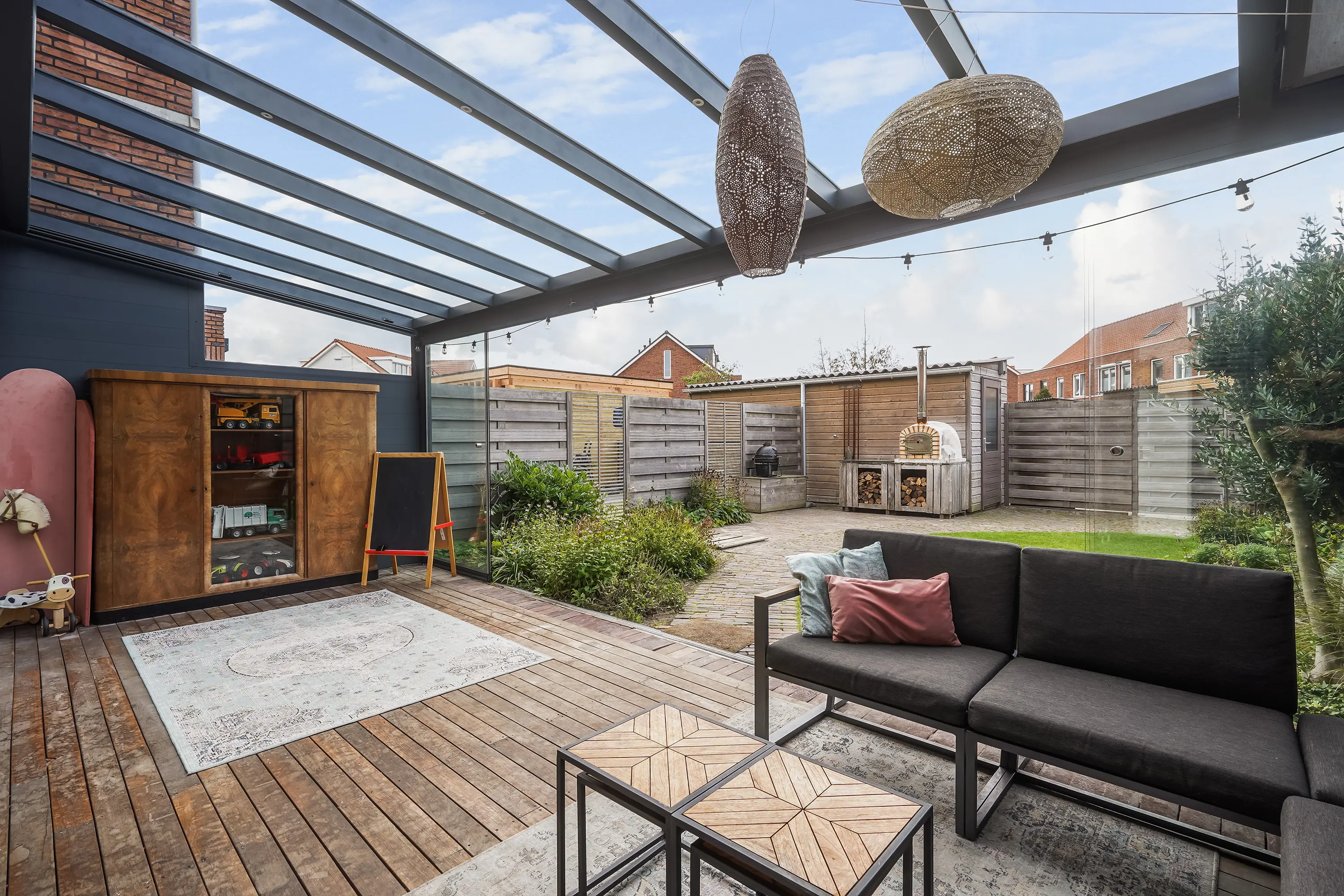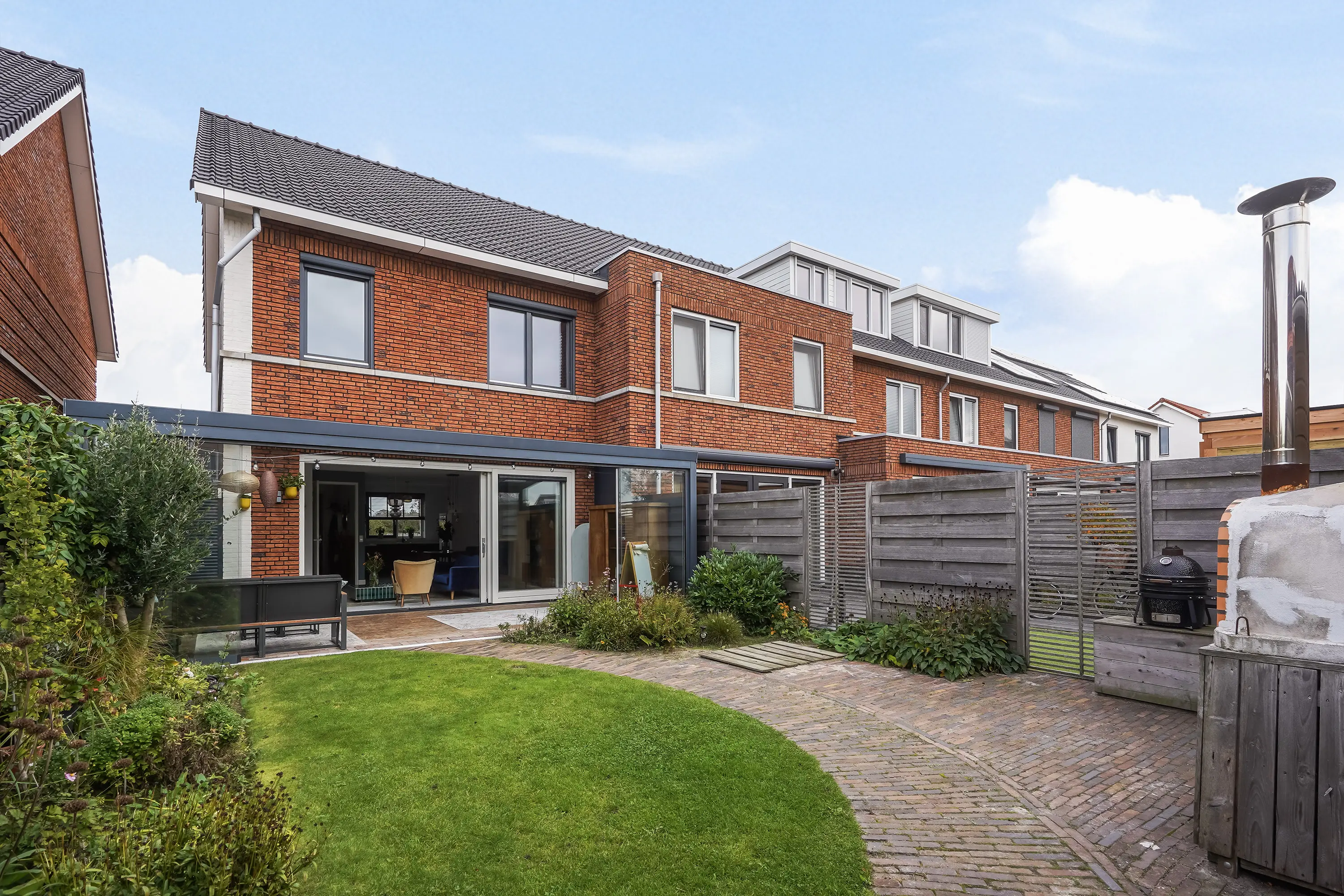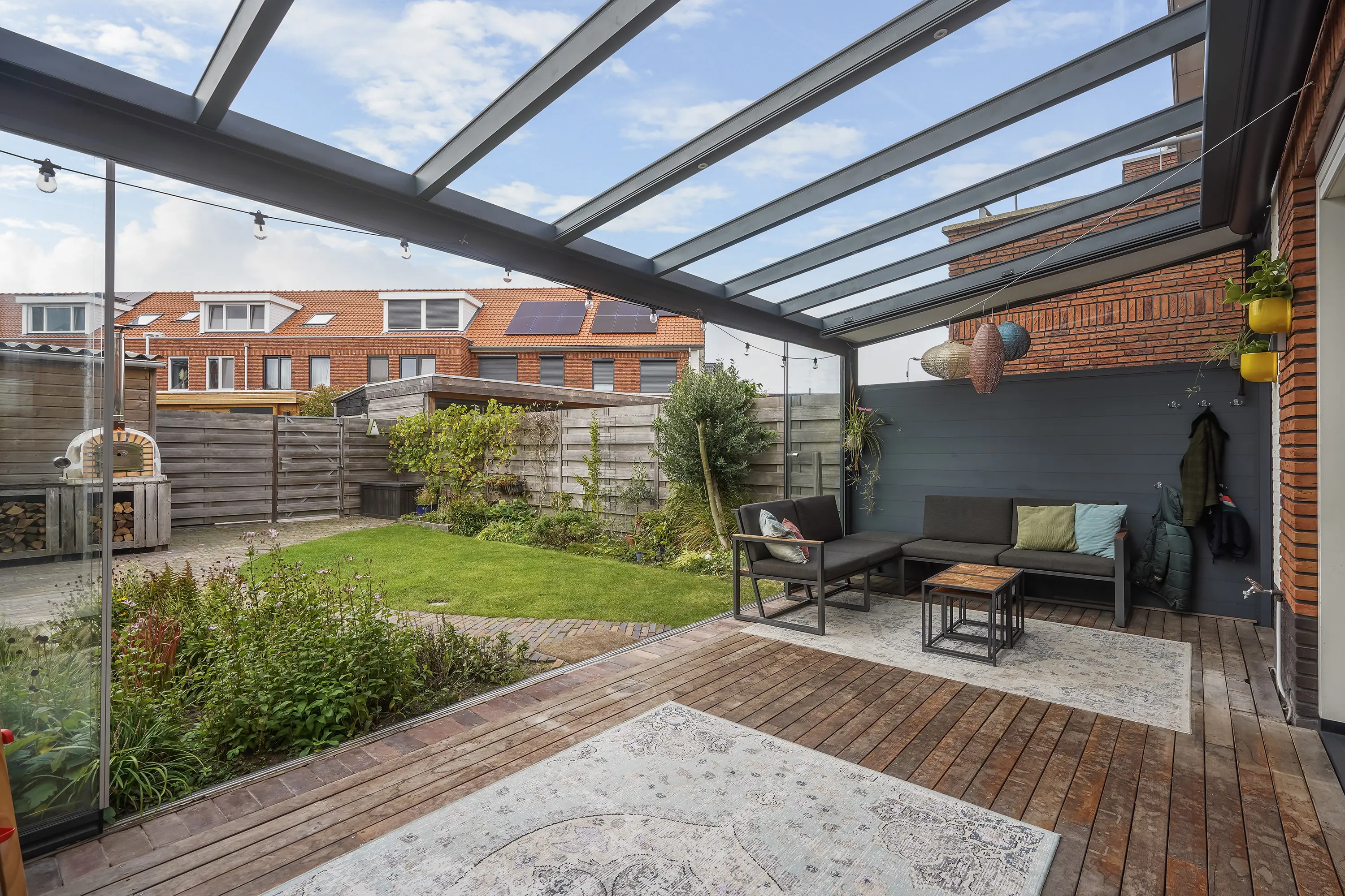 Via de schuifpui wordt buiten moeiteloos bij binnen betrokken. In 2022 is de prachtige tuinkamer gerealiseerd – een overkapping met verlichting, automatische zonwering en glazen schuifwanden, waardoor u in elk seizoen kunt genieten van het buitenleven. De tuin is gunstig gelegen op het zuidwesten, met een mix van gras, groen en sfeervolle gebakken klinkers, en heeft een lengte van maar liefst 12,44 meter (inclusief tuinkamer). Er is zowel een achterom richting het gezamenlijke parkje als een zij-uitgang naar de voortuin.