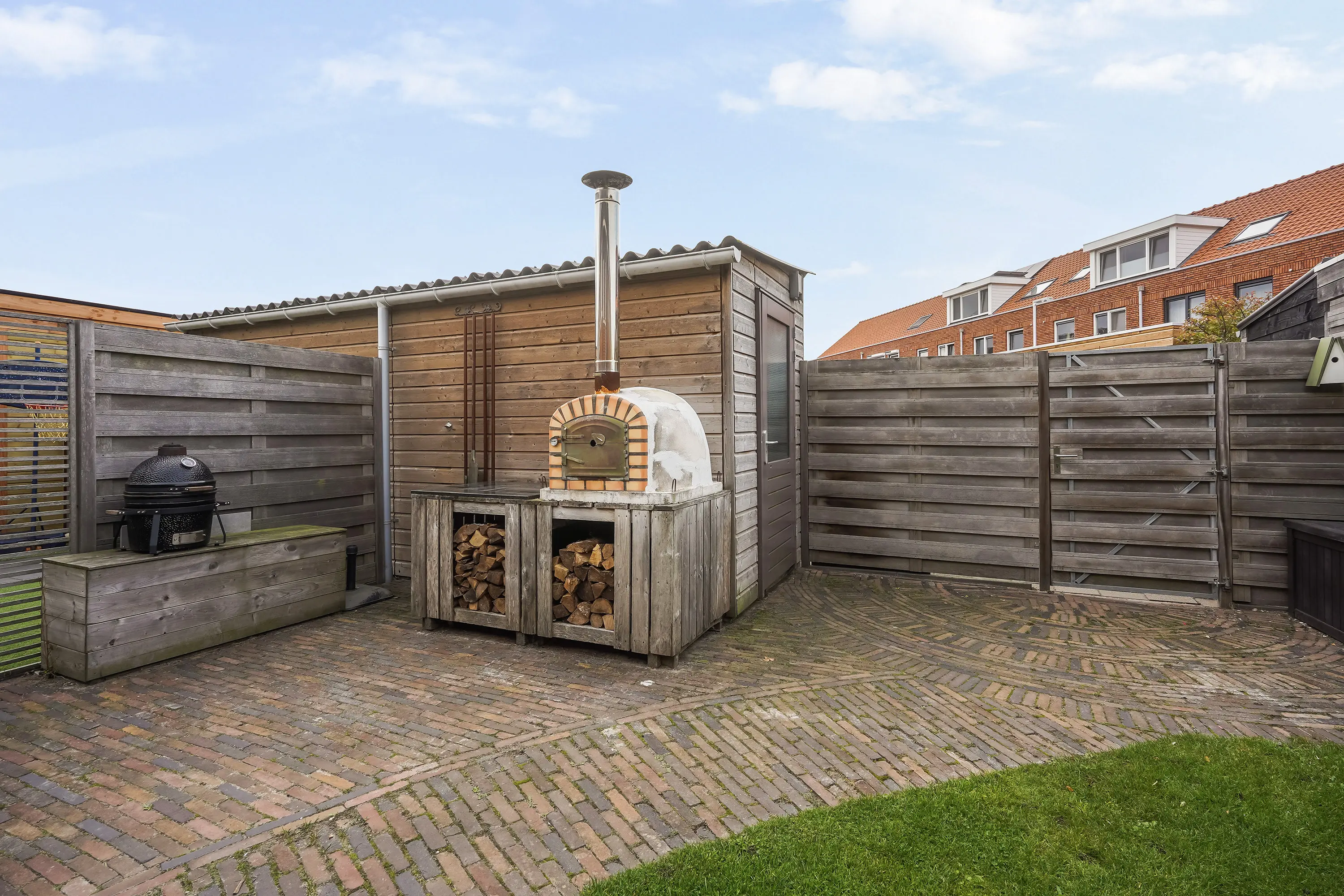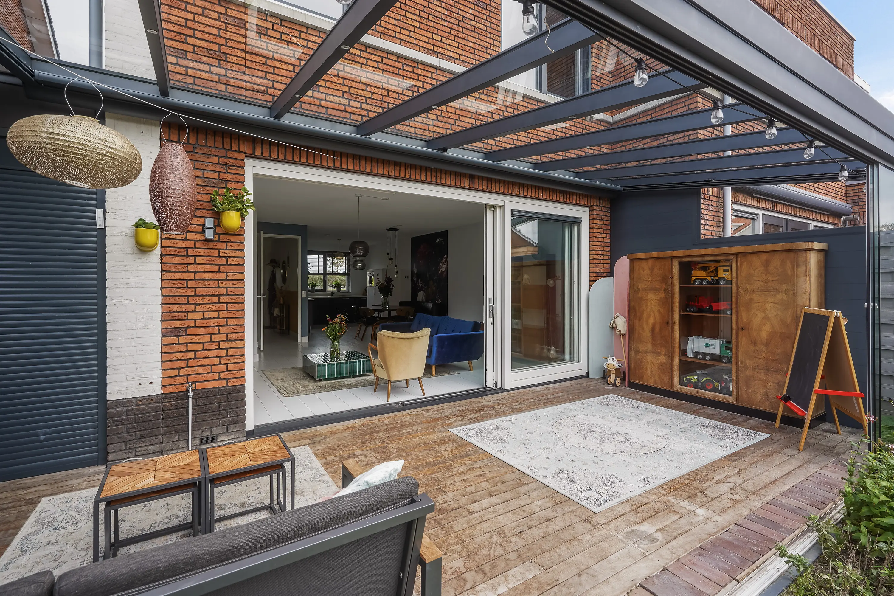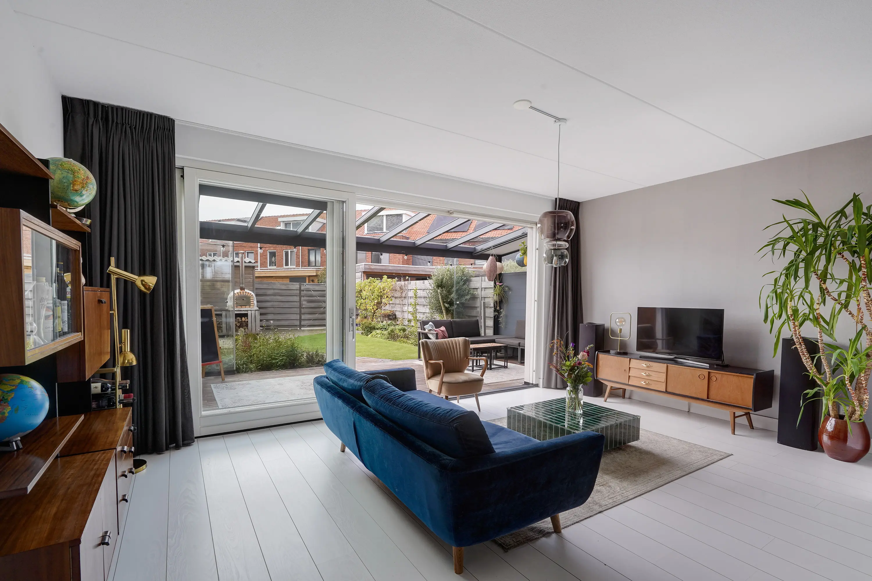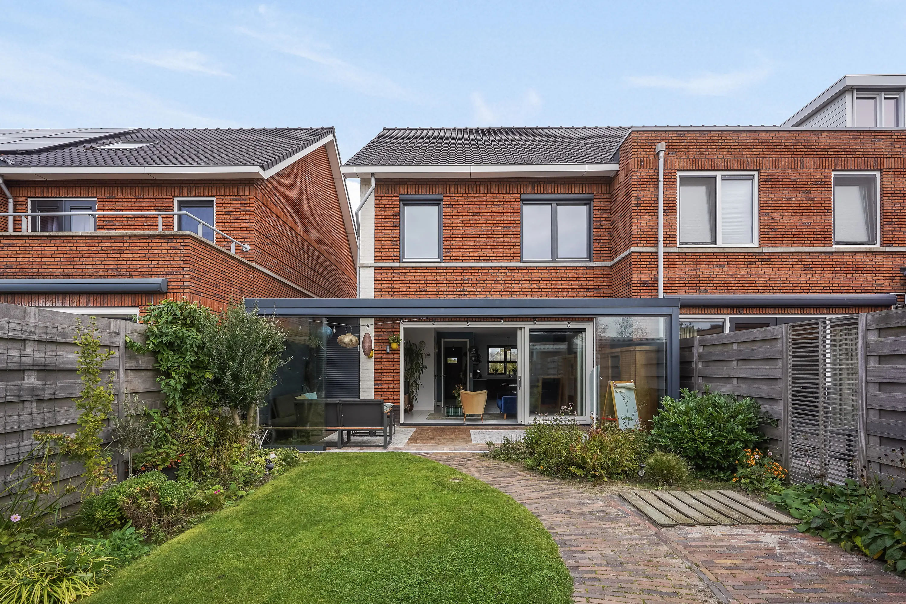 Via de schuifpui wordt buiten moeiteloos bij binnen betrokken. In 2022 is de prachtige tuinkamer gerealiseerd – een overkapping met verlichting, automatische zonwering en glazen schuifwanden, waardoor u in elk seizoen kunt genieten van het buitenleven. De tuin is gunstig gelegen op het zuidwesten, met een mix van gras, groen en sfeervolle gebakken klinkers, en heeft een lengte van maar liefst 12,44 meter (inclusief tuinkamer). Er is zowel een achterom richting het gezamenlijke parkje als een zij-uitgang naar de voortuin.