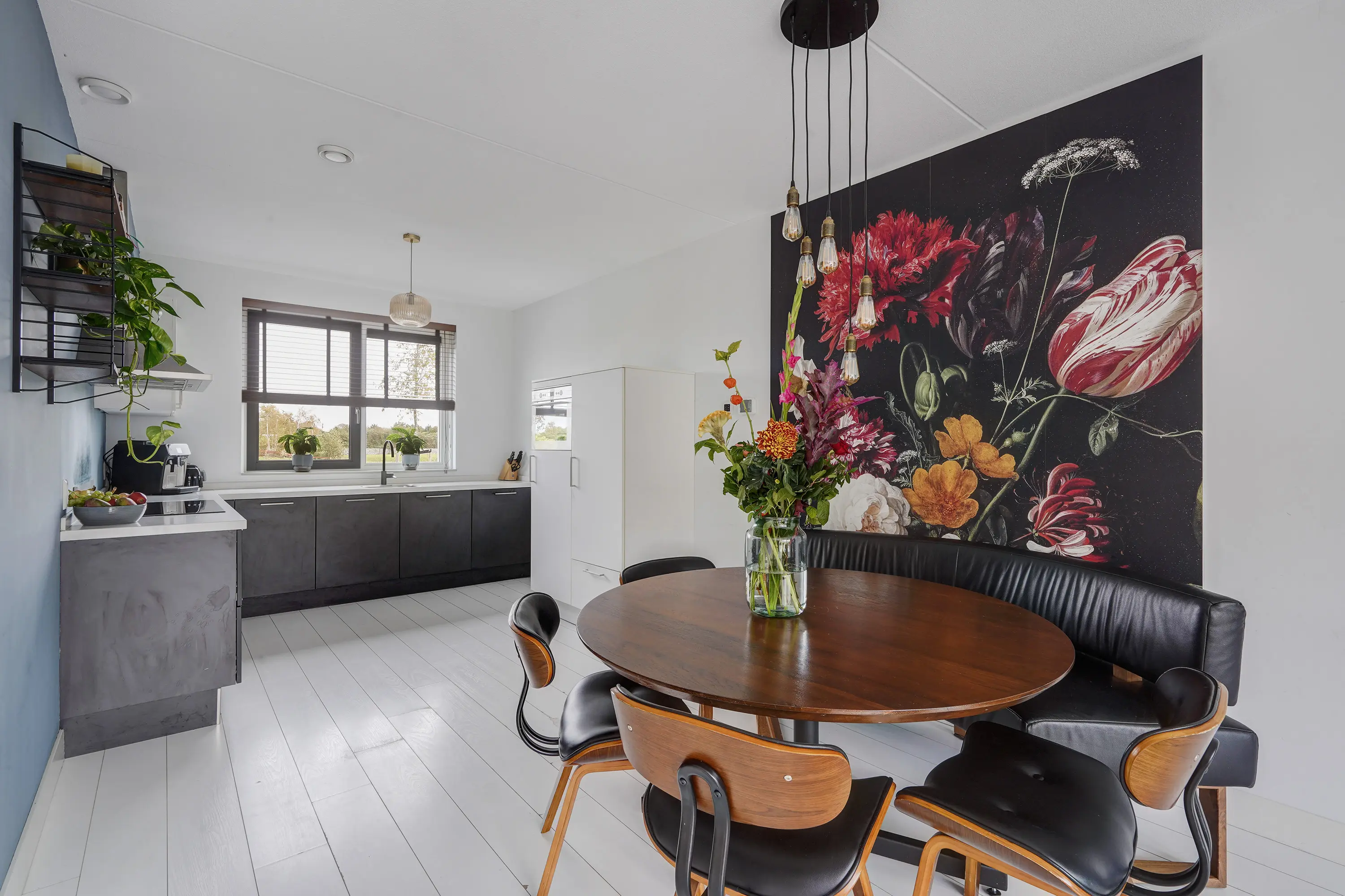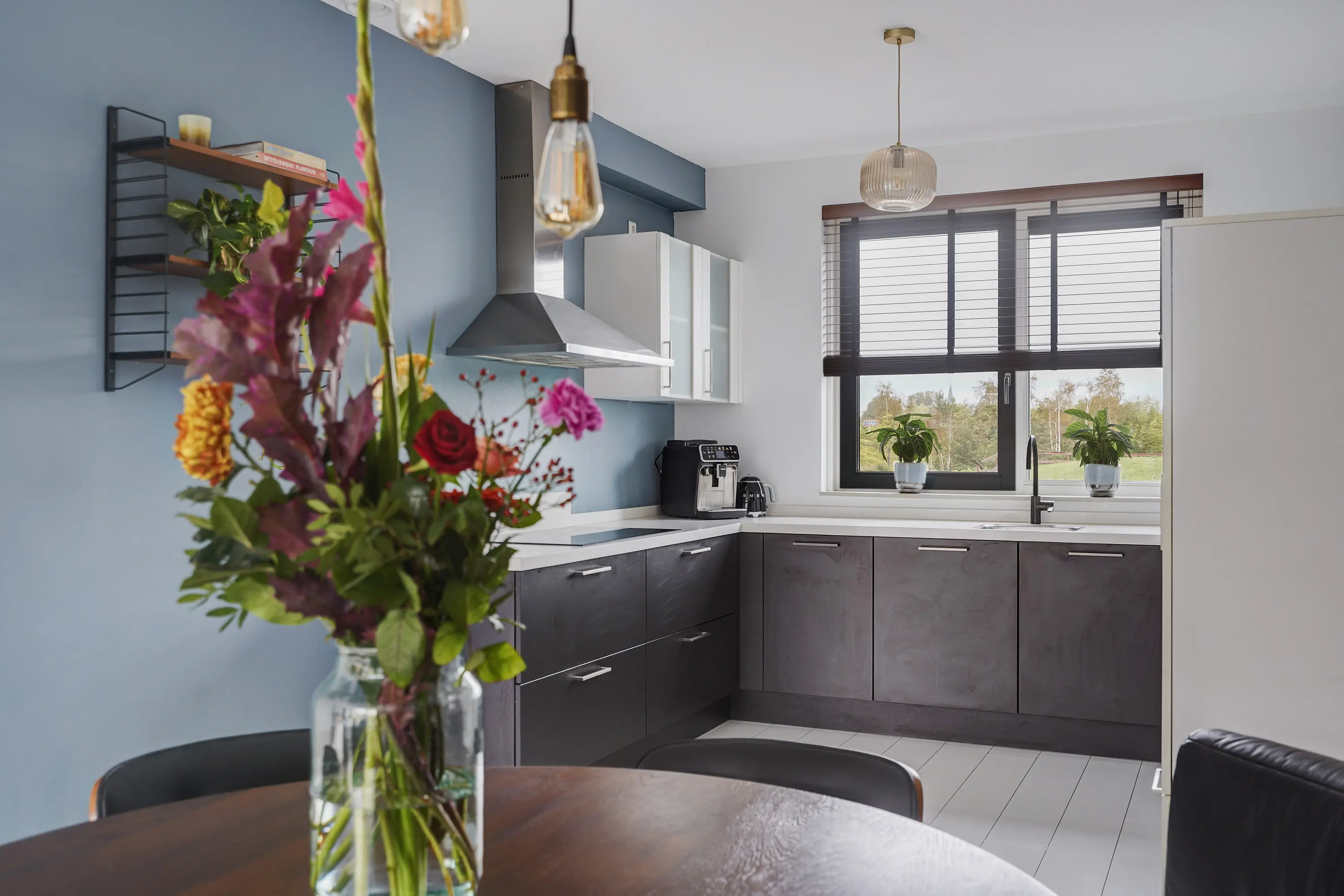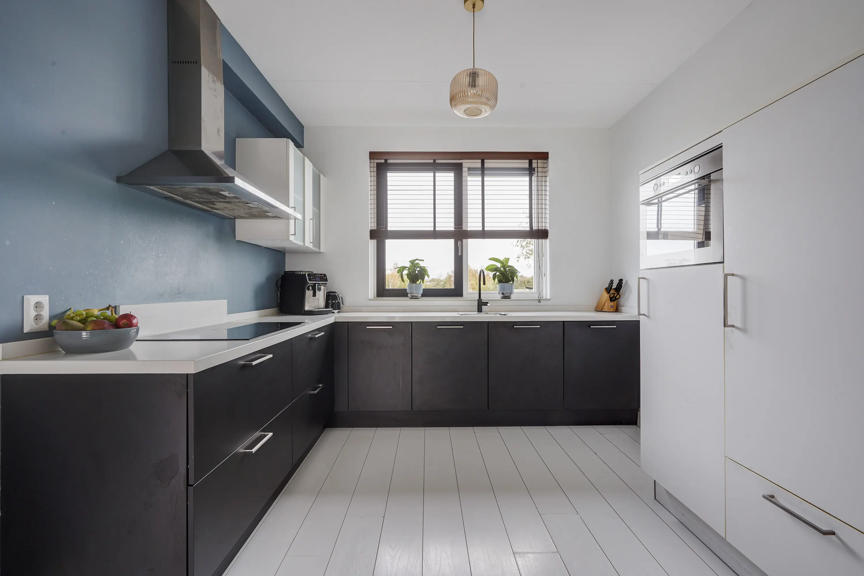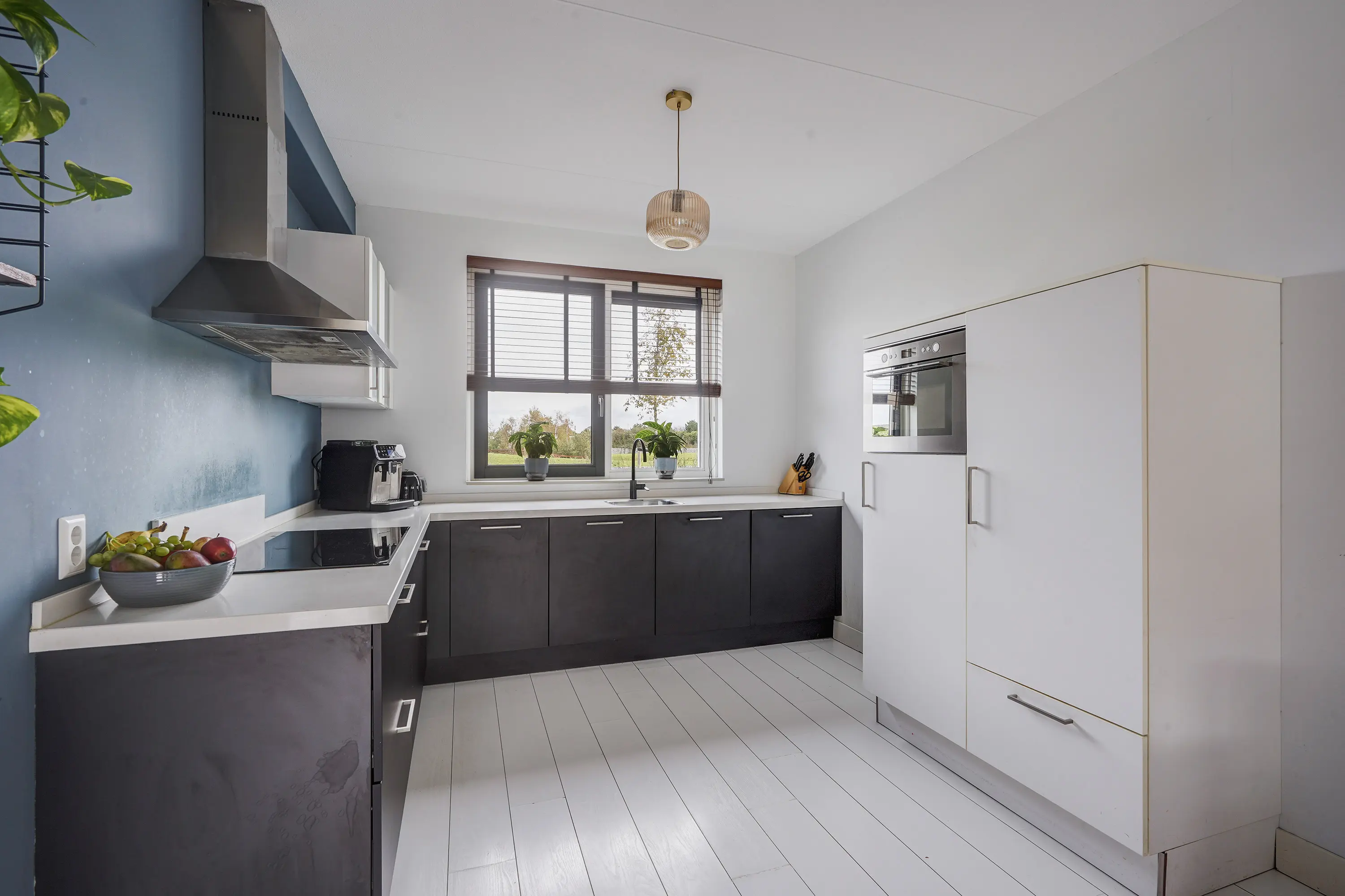 Aan de voorzijde van de woning bevindt zich de moderne keuken in antracietkleur met een wit marmerlook composiet werkblad, uitgevoerd in een L-opstelling met daarnaast een aparte hoge kastenwand. De keuken is voorzien van diverse inbouwapparatuur, waaronder een 5-pits inductiekookplaat met afzuigkap, vaatwasser, koelkast, vriezer en oven. Dankzij de slimme indeling is er volop werk- en opbergruimte.