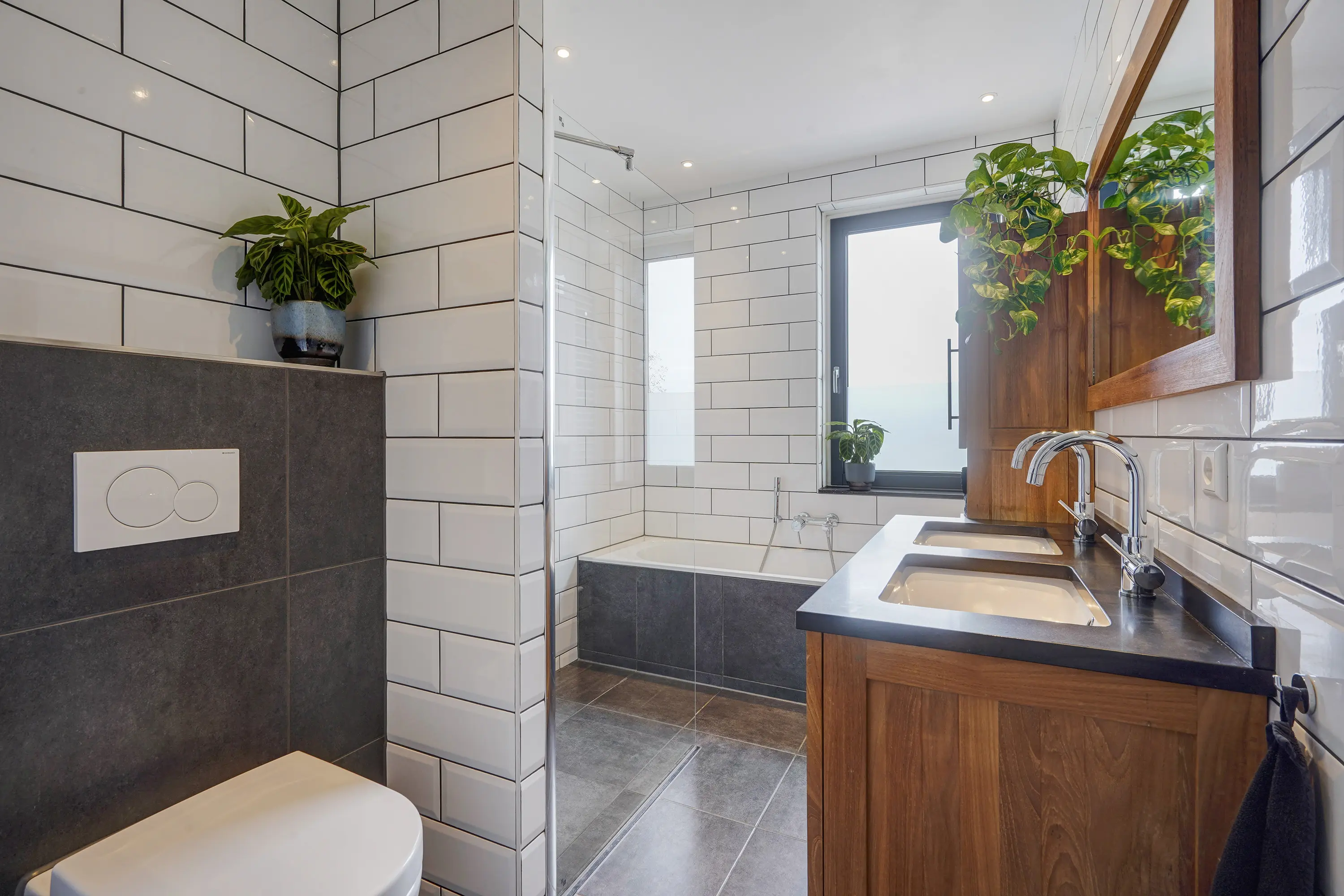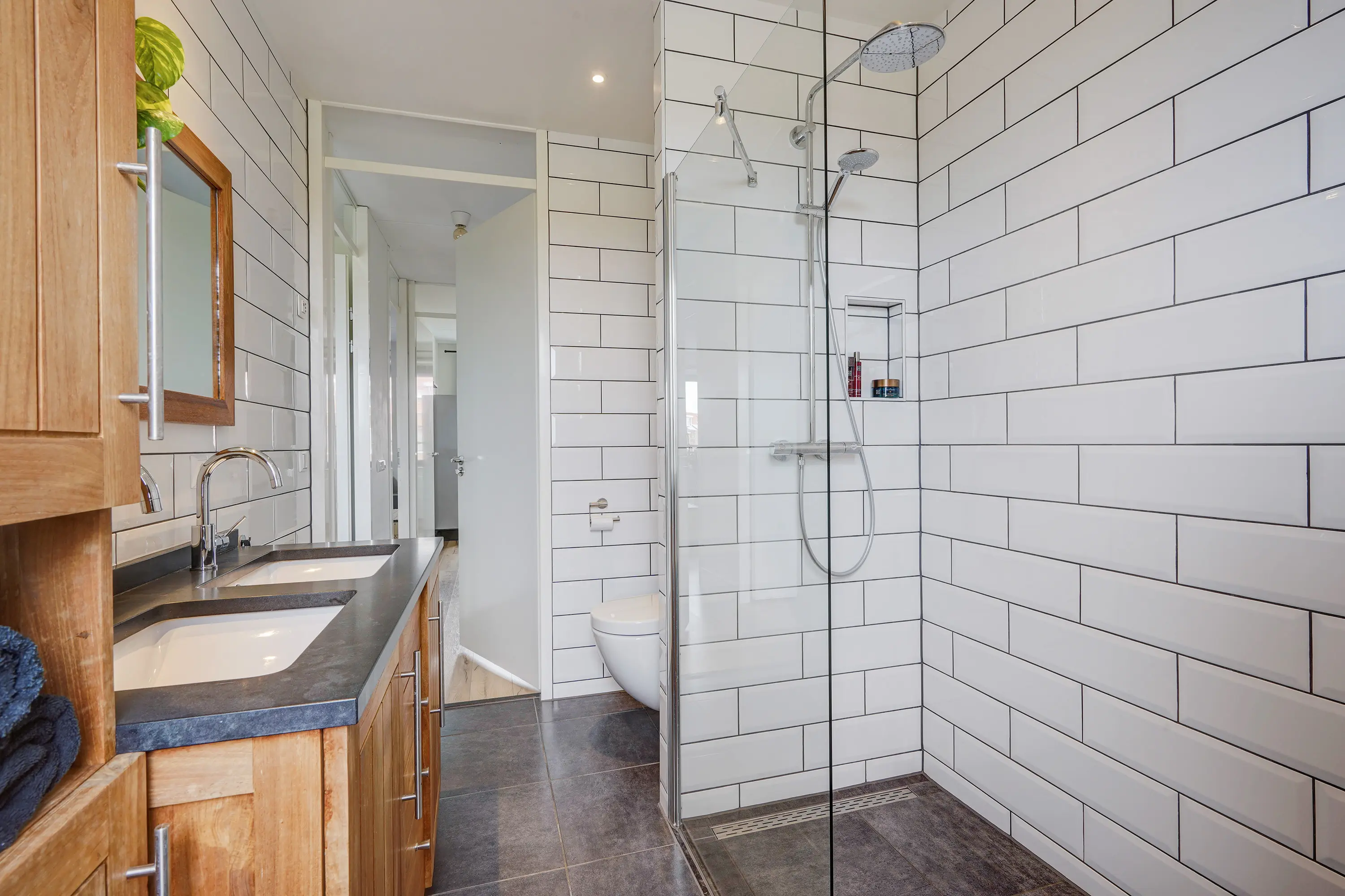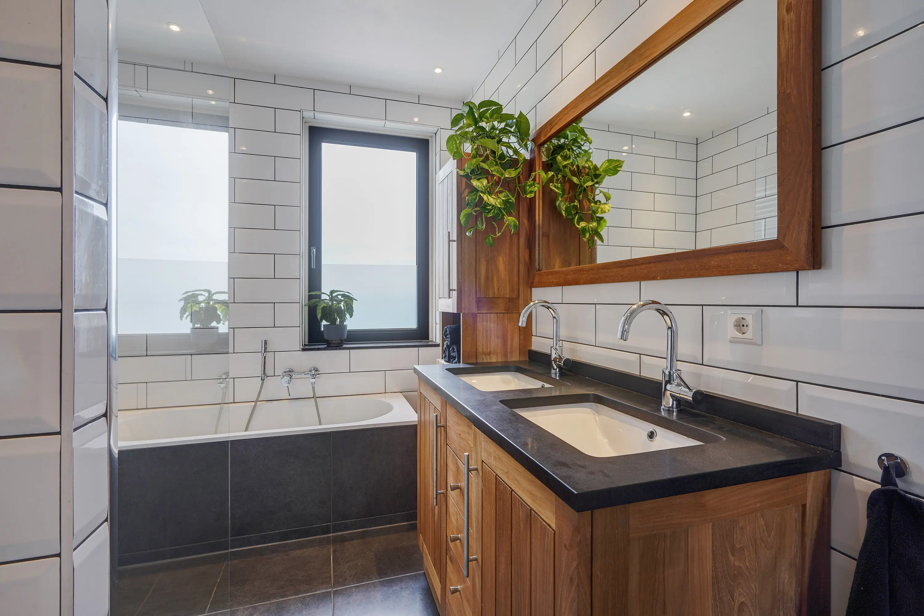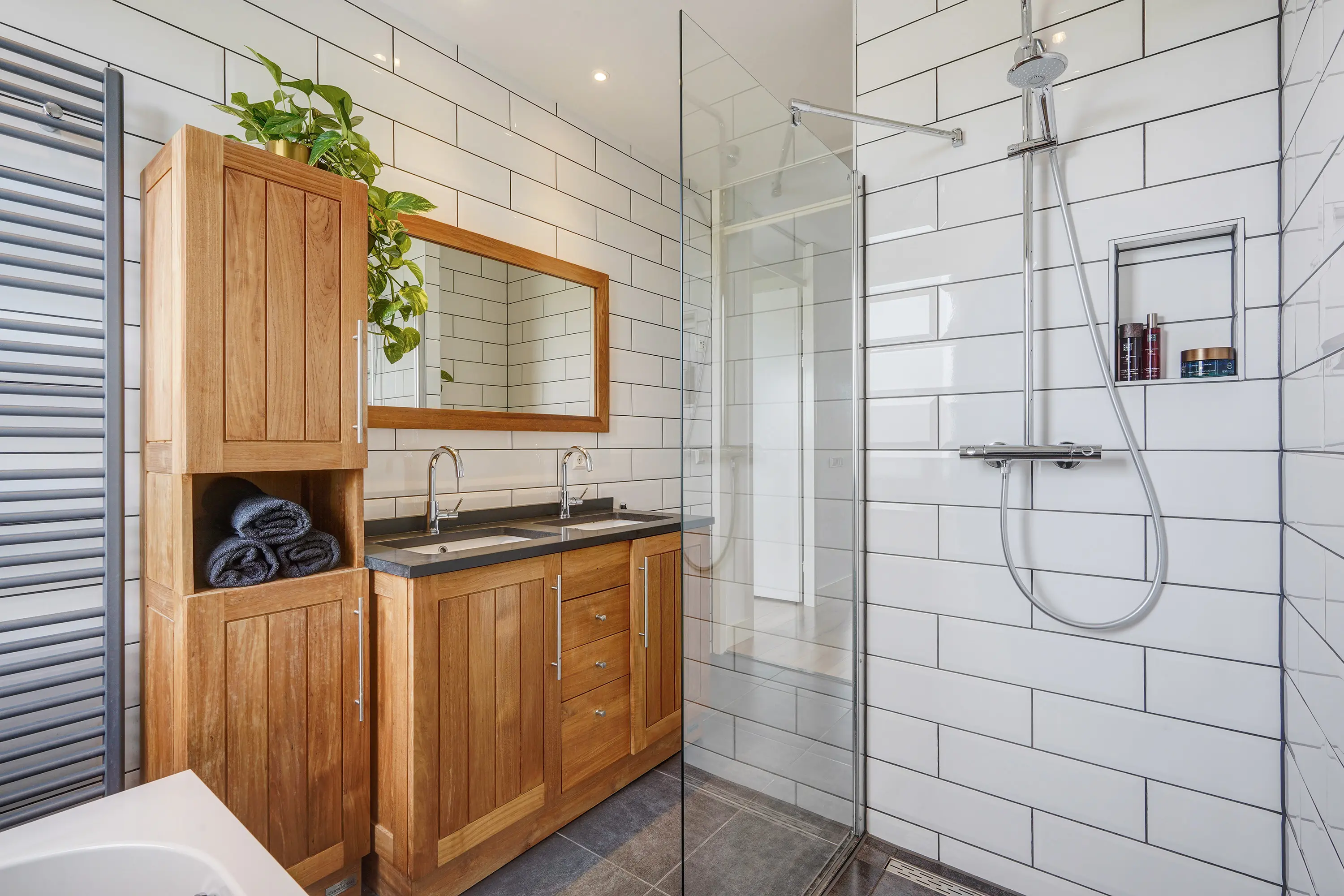 - Badkamer met ligbad, inloopdouche en dubbel wastafelmeubel;