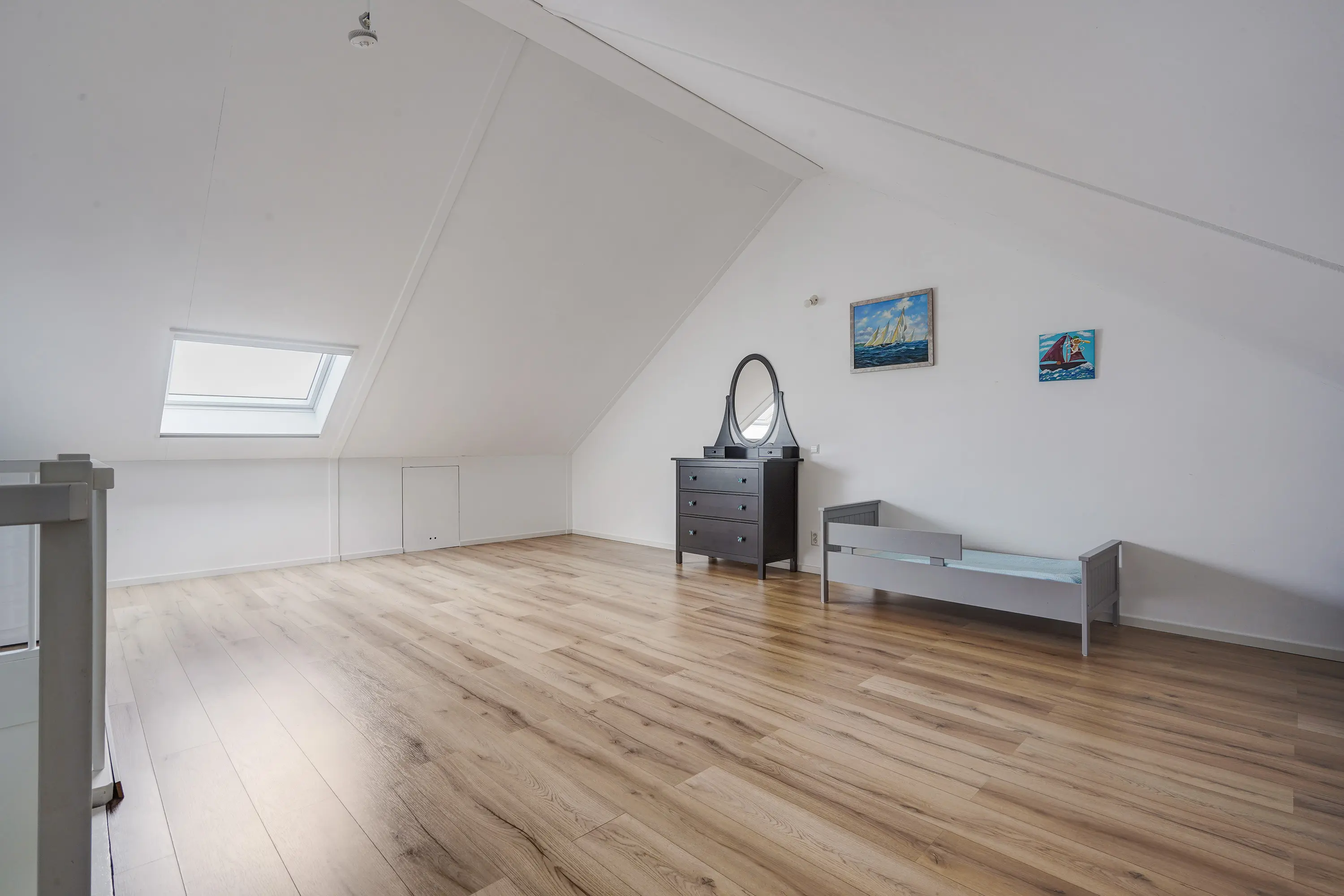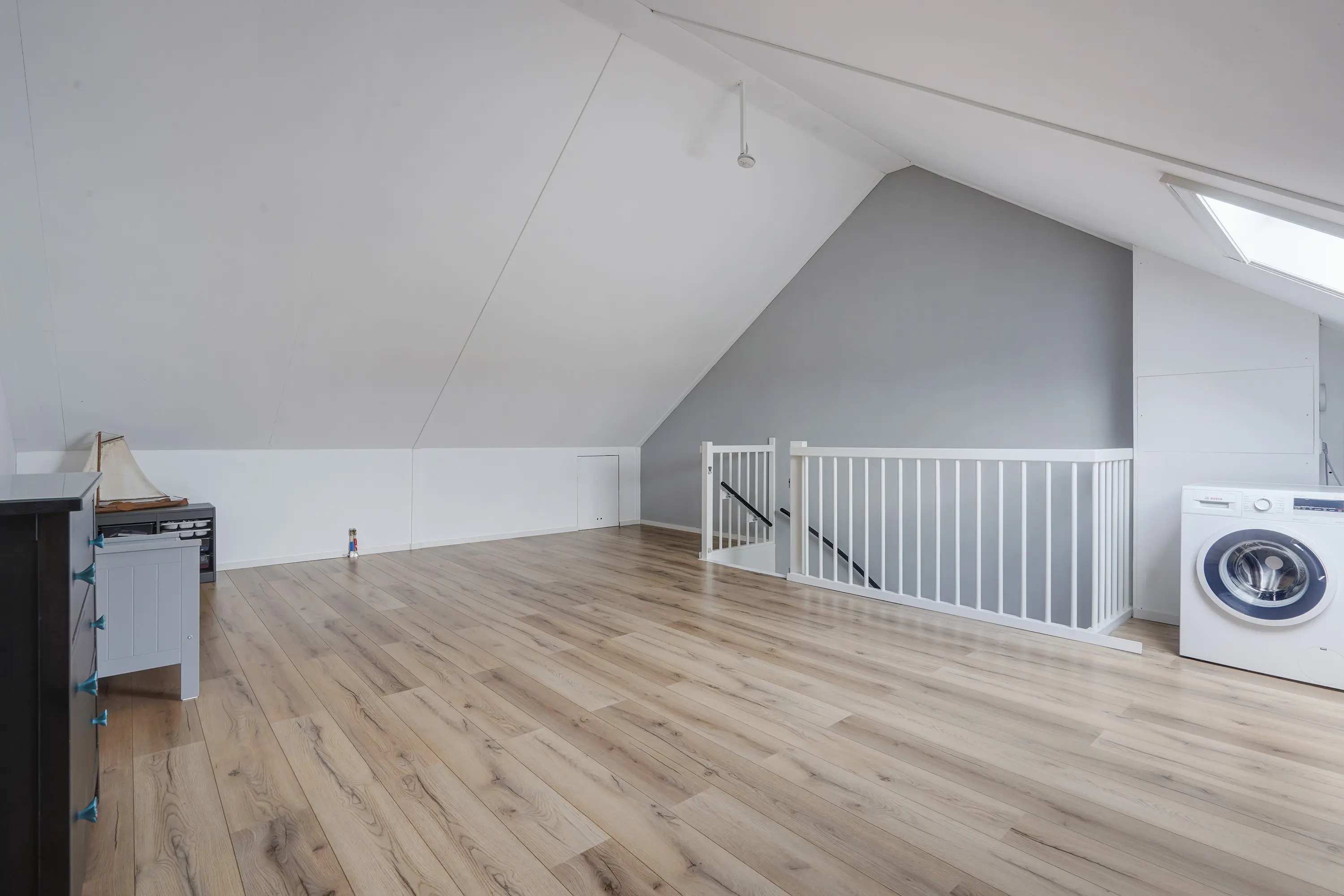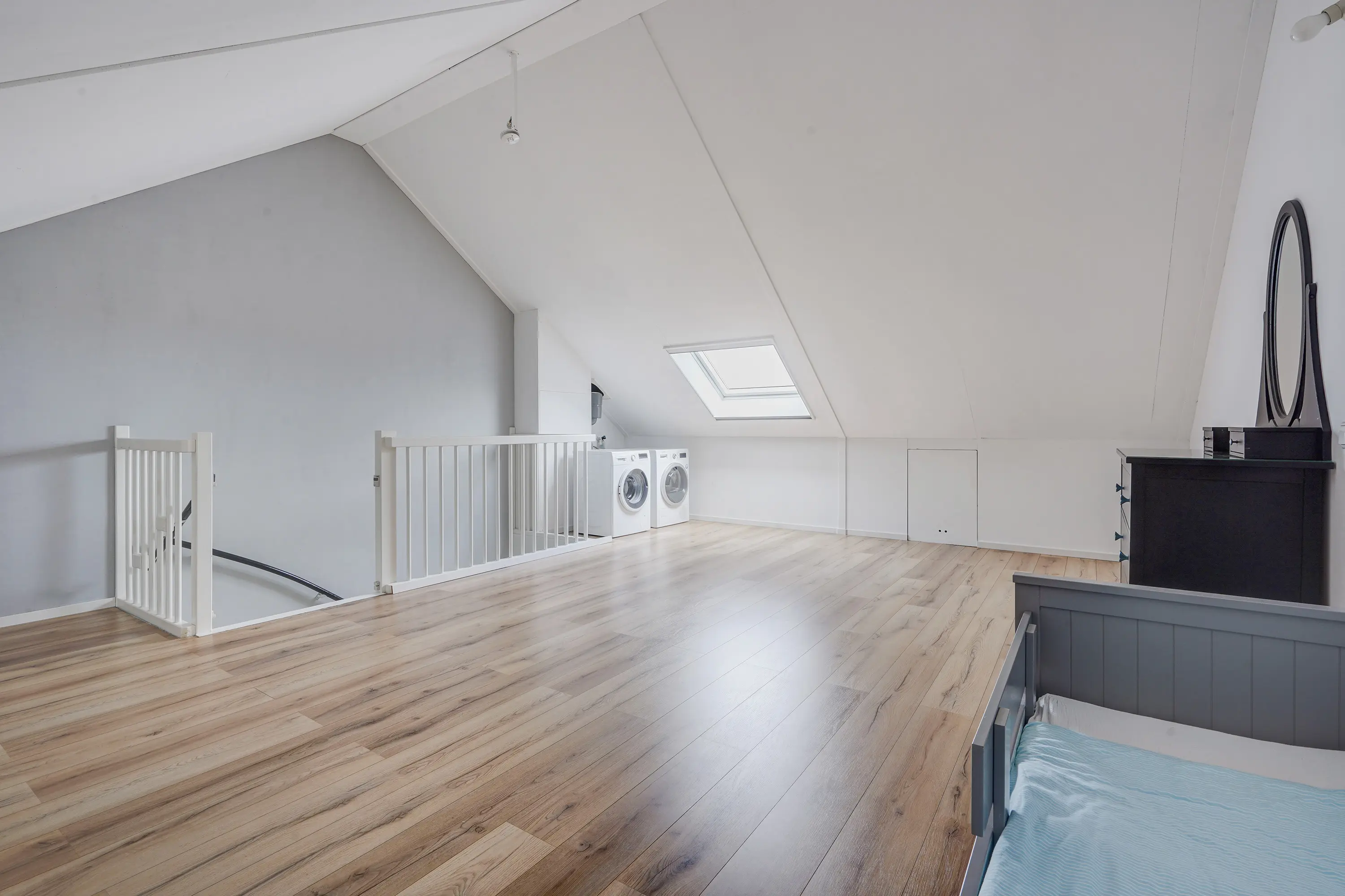 Via een vaste trap bereikt u de zolderverdieping, een open en lichte ruimte die naar wens kan worden ingedeeld. Met een dakraam, bergruimte achter de knieschotten en de wasmachine-opstelling en voorbereiding voor verwarming, biedt deze verdieping mogelijkheden voor één of twee extra slaapkamers, een kantoor of een hobbyruimte.