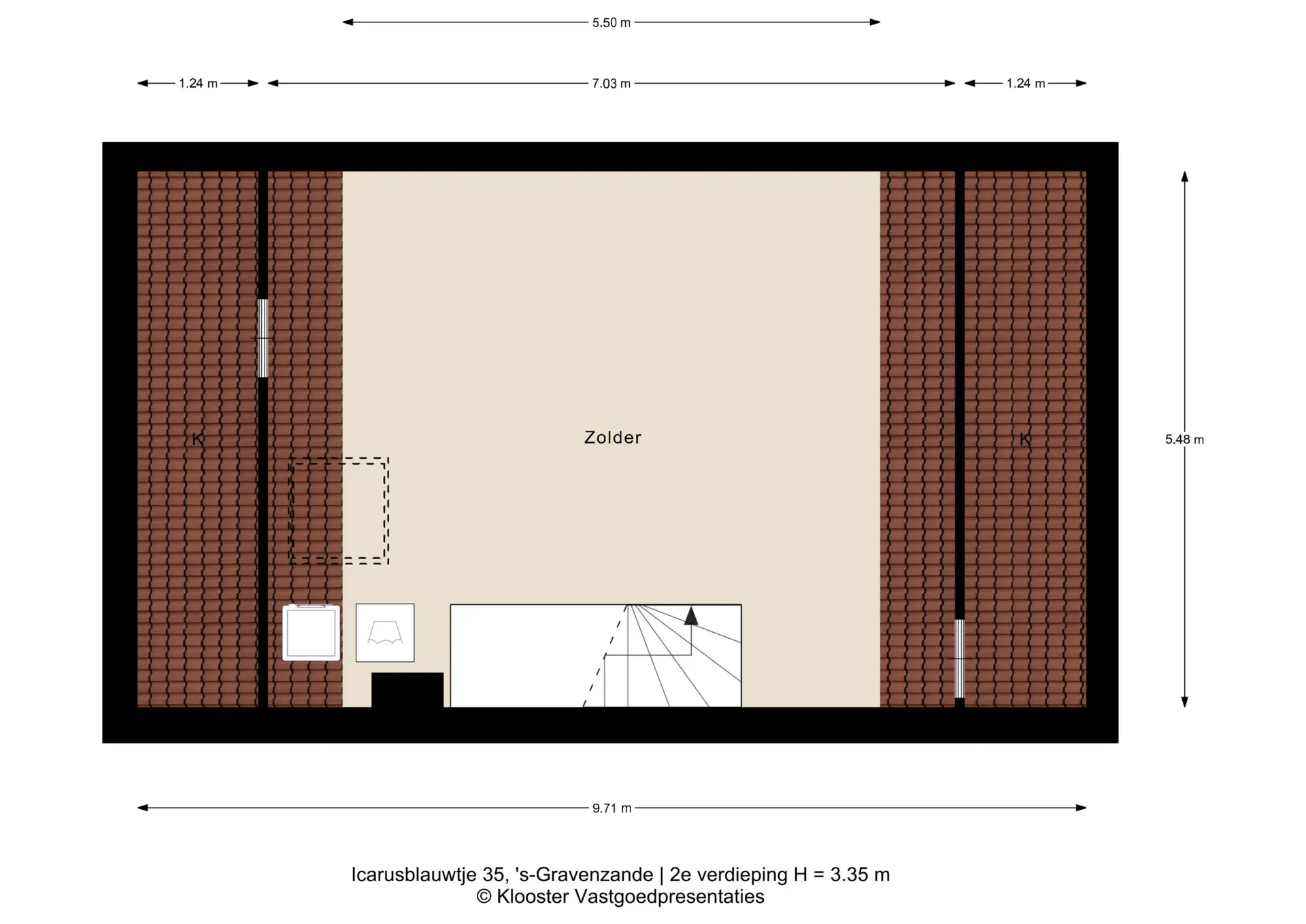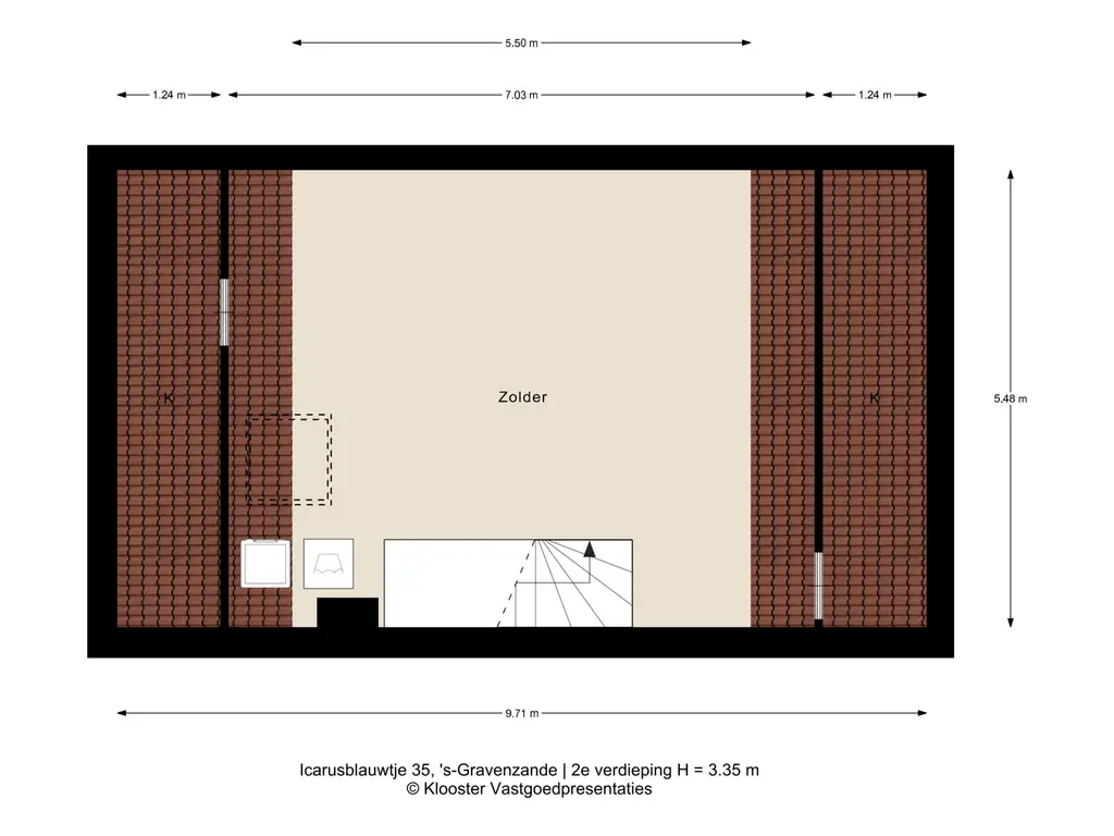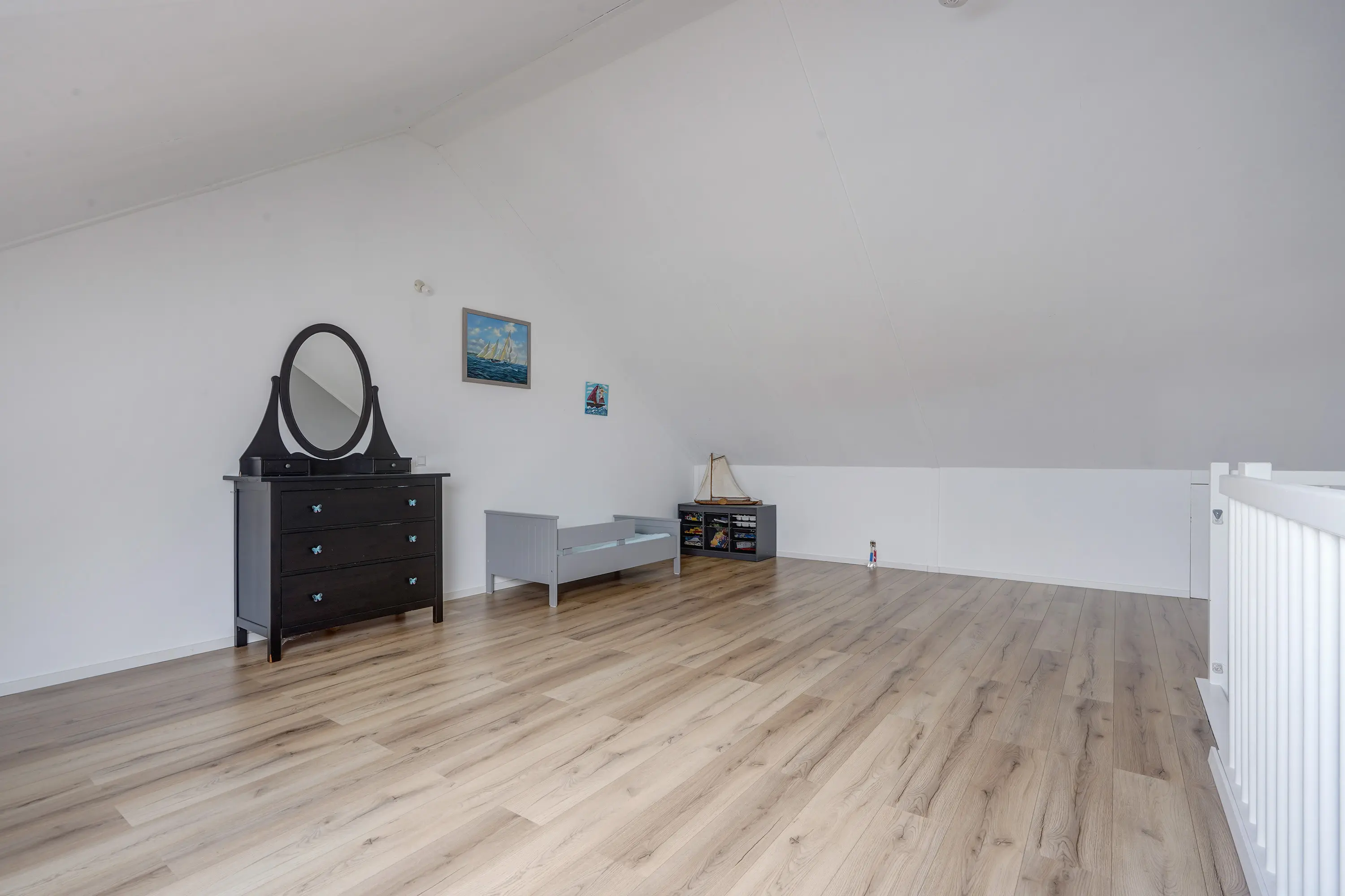 Via een vaste trap bereikt u de zolderverdieping, een open en lichte ruimte die naar wens kan worden ingedeeld. Met een dakraam, bergruimte achter de knieschotten en de wasmachine-opstelling en voorbereiding voor verwarming, biedt deze verdieping mogelijkheden voor één of twee extra slaapkamers, een kantoor of een hobbyruimte.