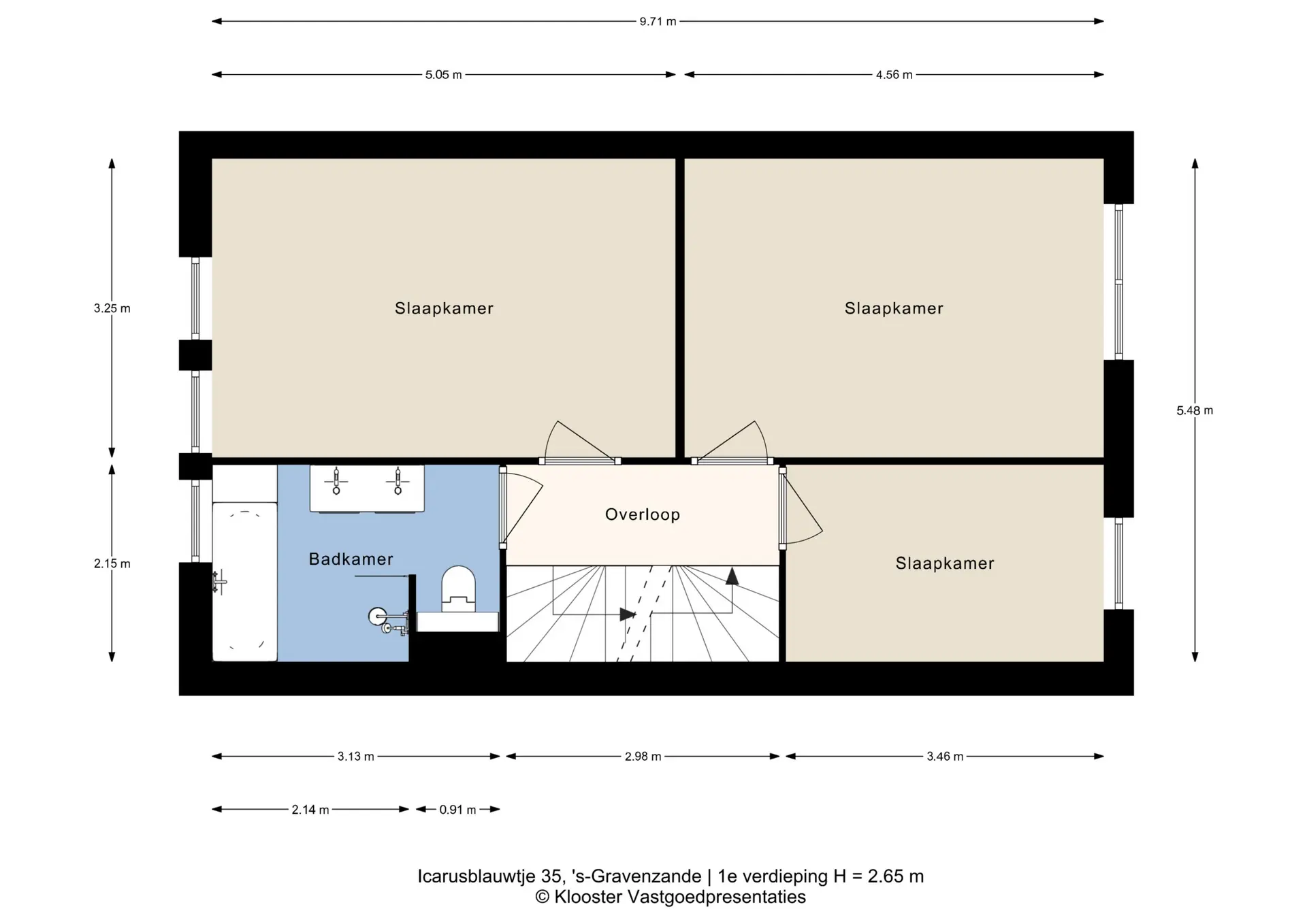 De eerste verdieping is volledig voorzien van laminaat (m.u.v. de badkamer), wat een rustige uitstraling geeft. Aan de voorzijde op het noordoosten ligt de hoofdslaapkamer met ruimte voor een grote kast en wijds uitzicht over natuur, water en een heuse western Ranch. De badkamer grenst direct aan deze kamer en is uitgevoerd in een hotel chique stijl met ligbad, inloopdouche, teakhouten dubbel wastafelmeubel, toilet, radiator, spots en te openen raam.