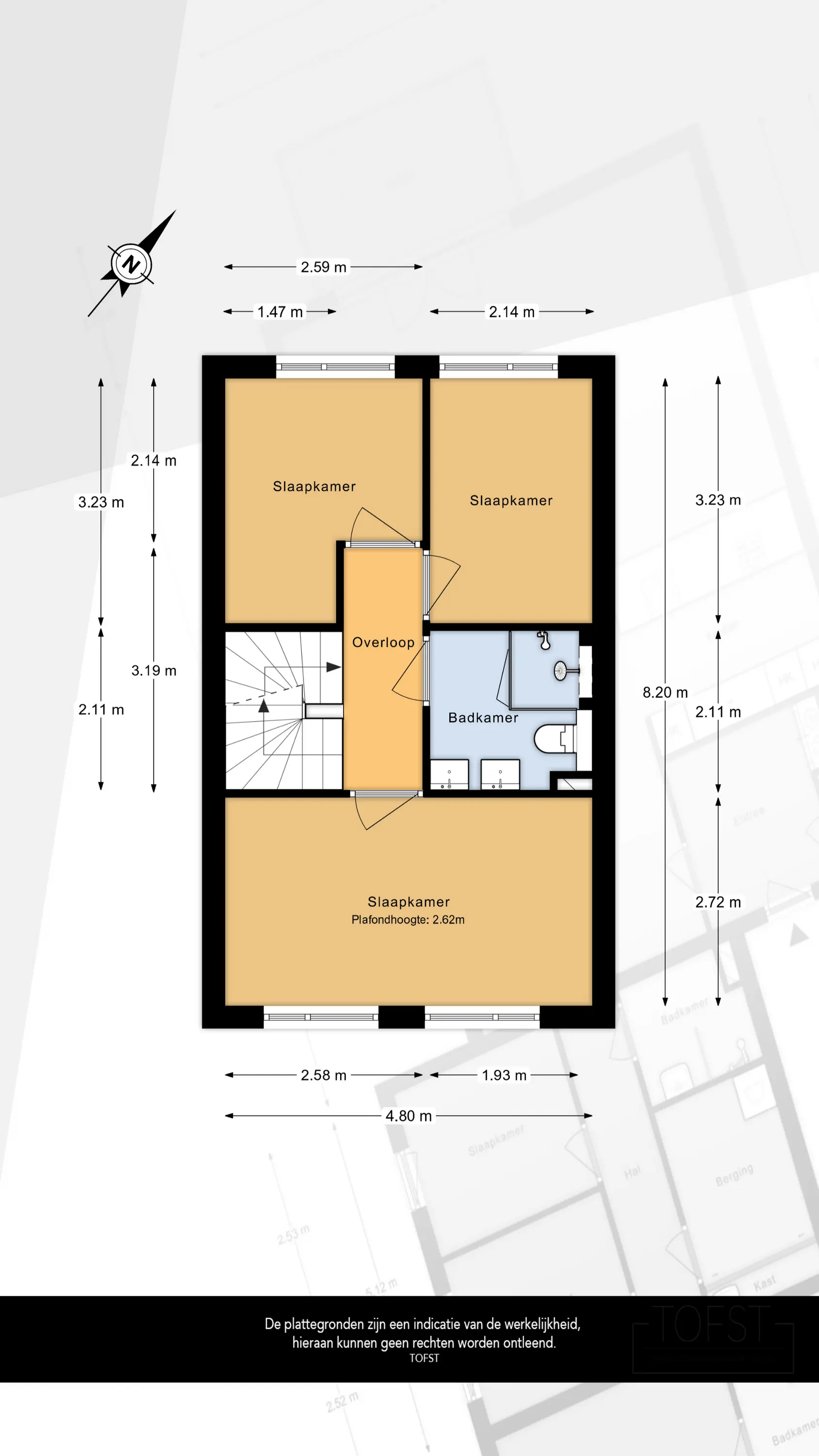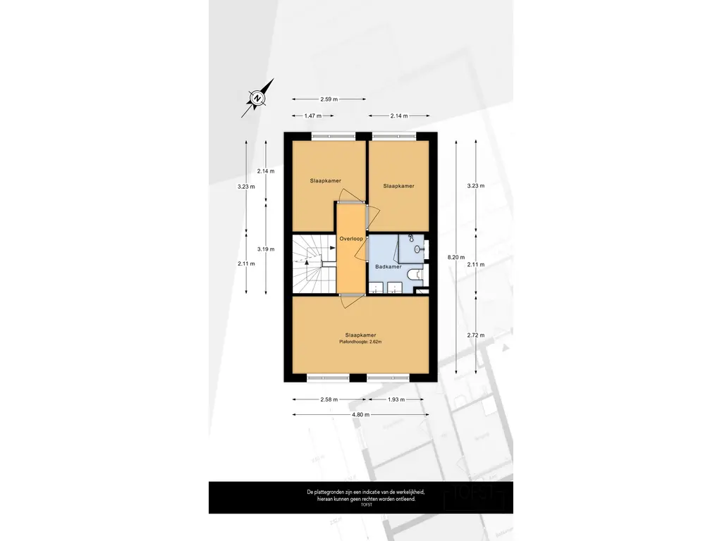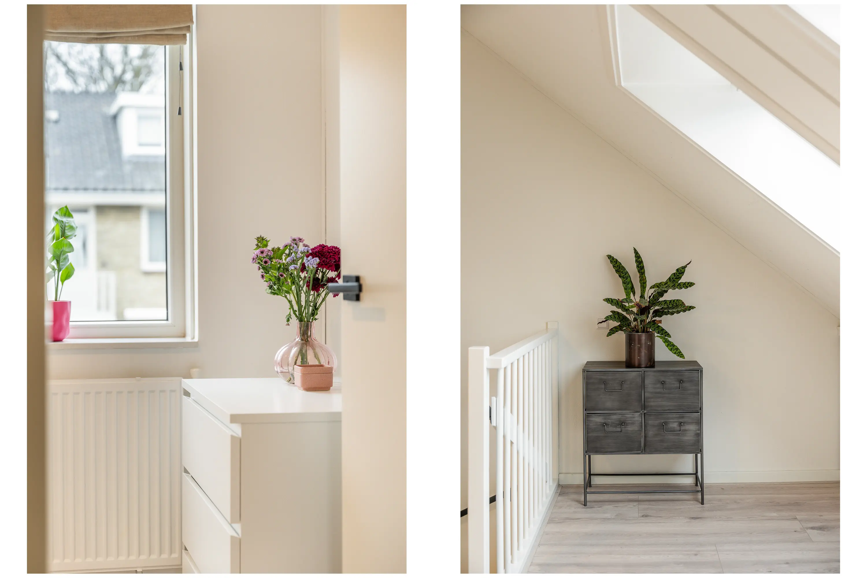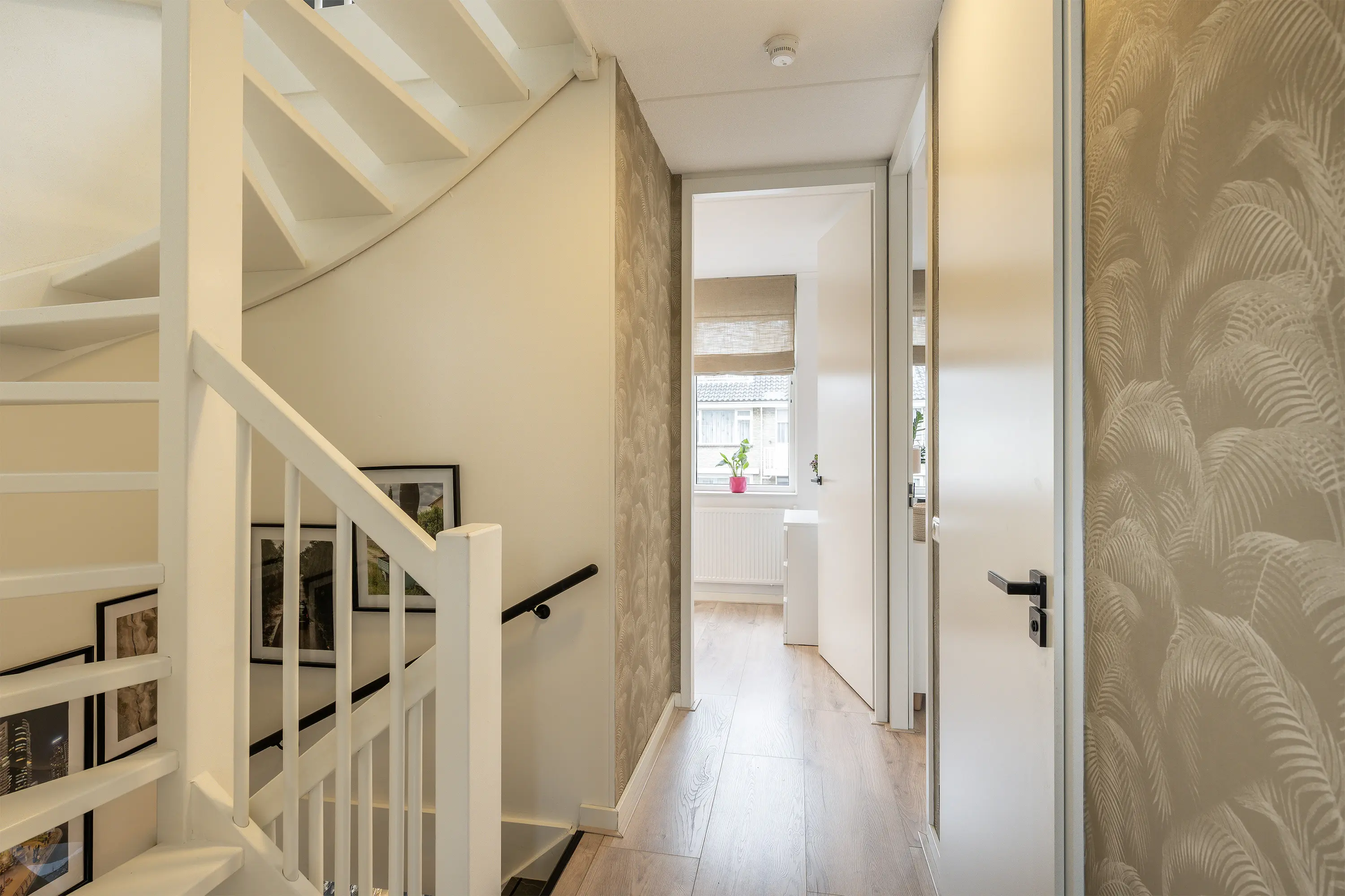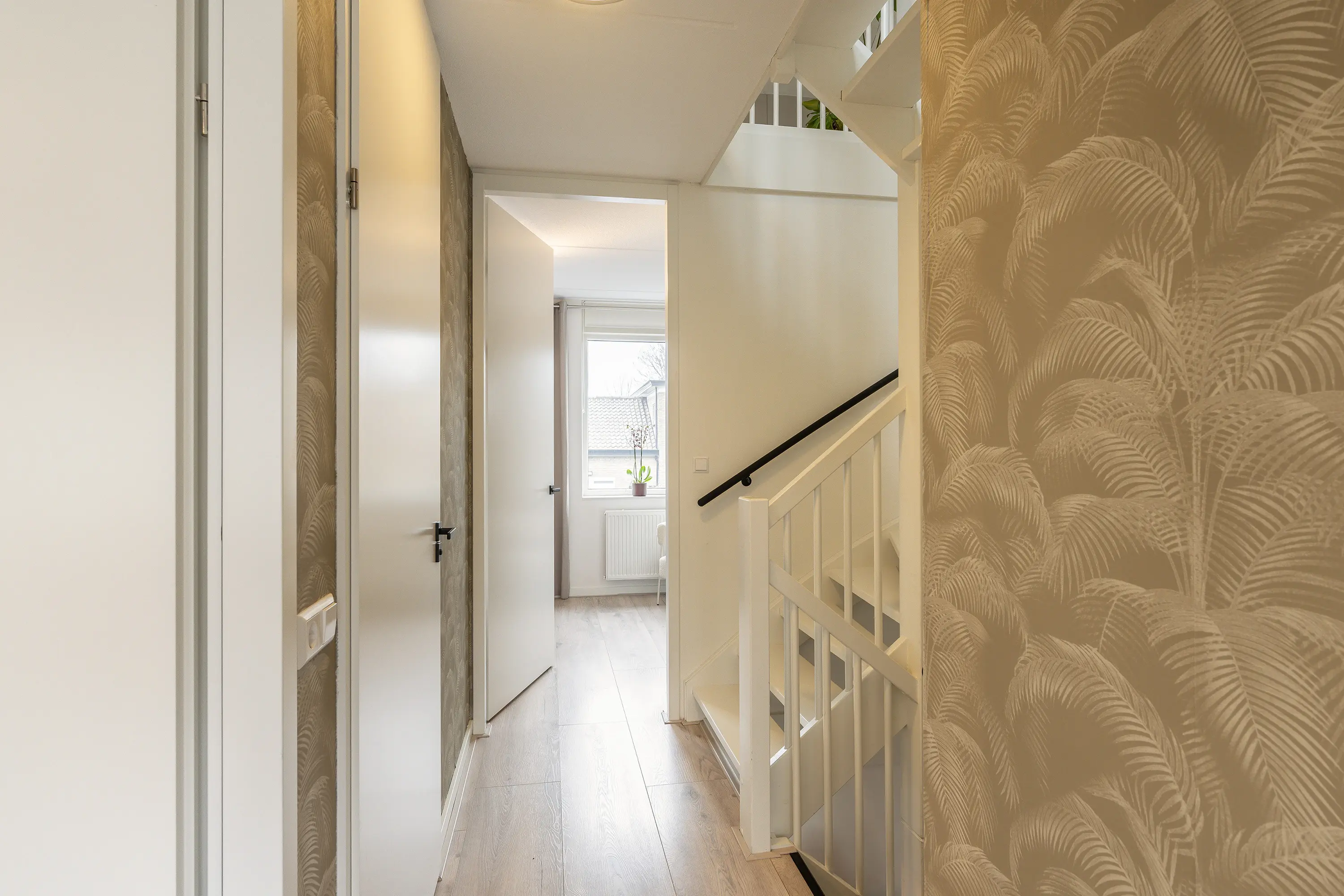 Op de overloop, met vaste trap naar de zolderverdieping, vindt u drie comfortabele slaapkamers. De moderne badkamer is compleet uitgevoerd met een inloopdouche, toilet, dubbel wastafelmeubel en handdoekradiator. De derde slaapkamer is voorzien van rolluiken – ideaal voor extra comfort en privacy.