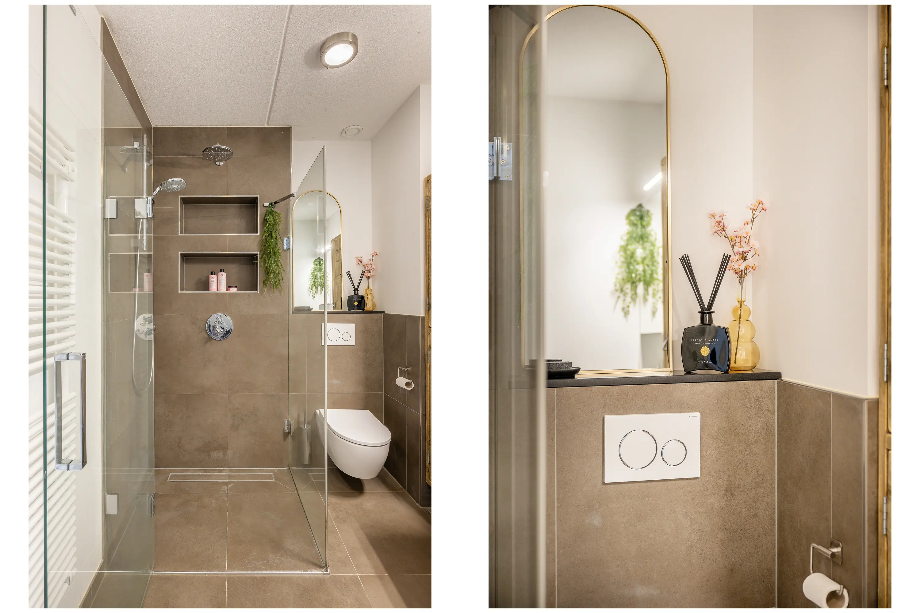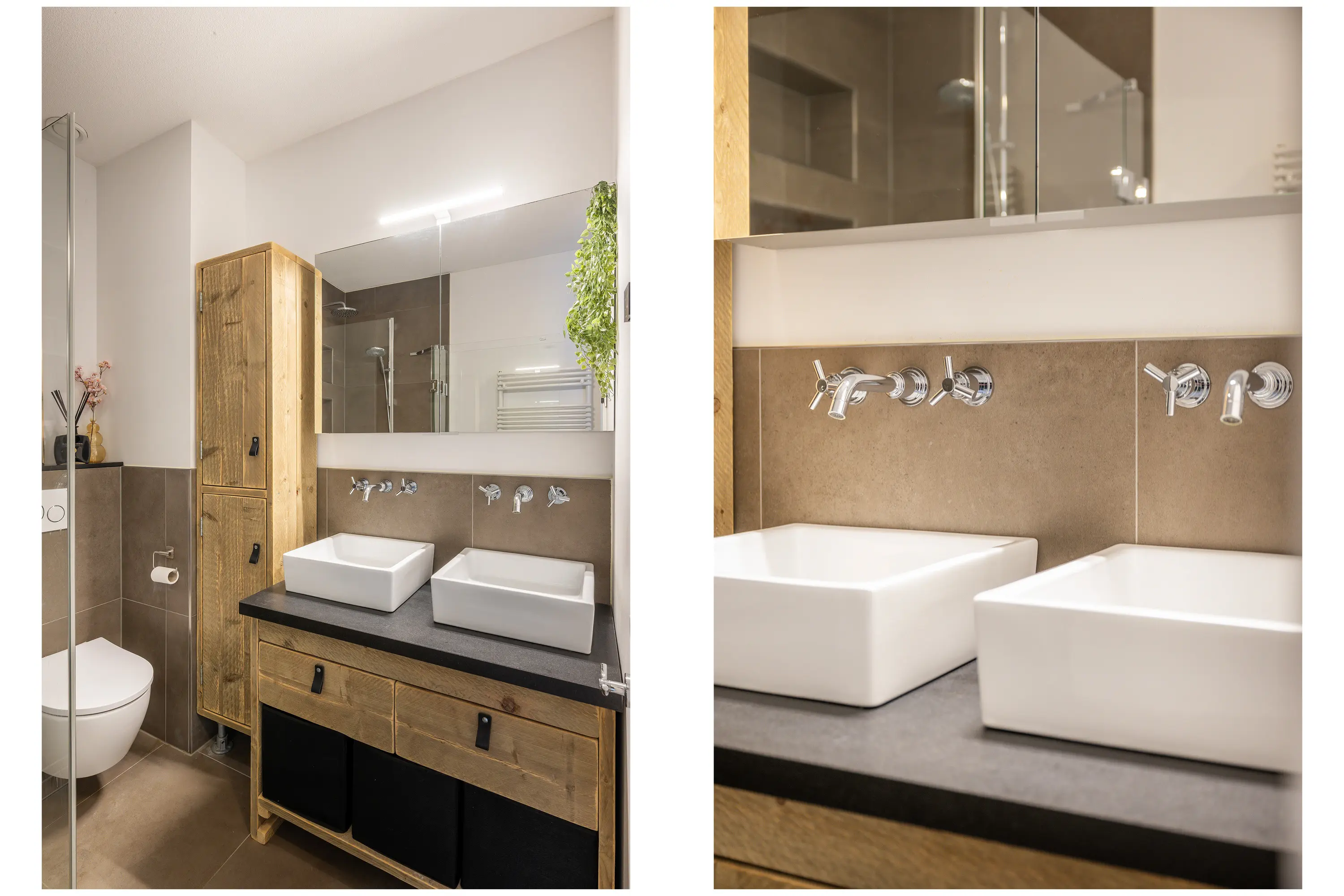 - Moderne badkamer met inloopdouche en dubbel wastafelmeubel;