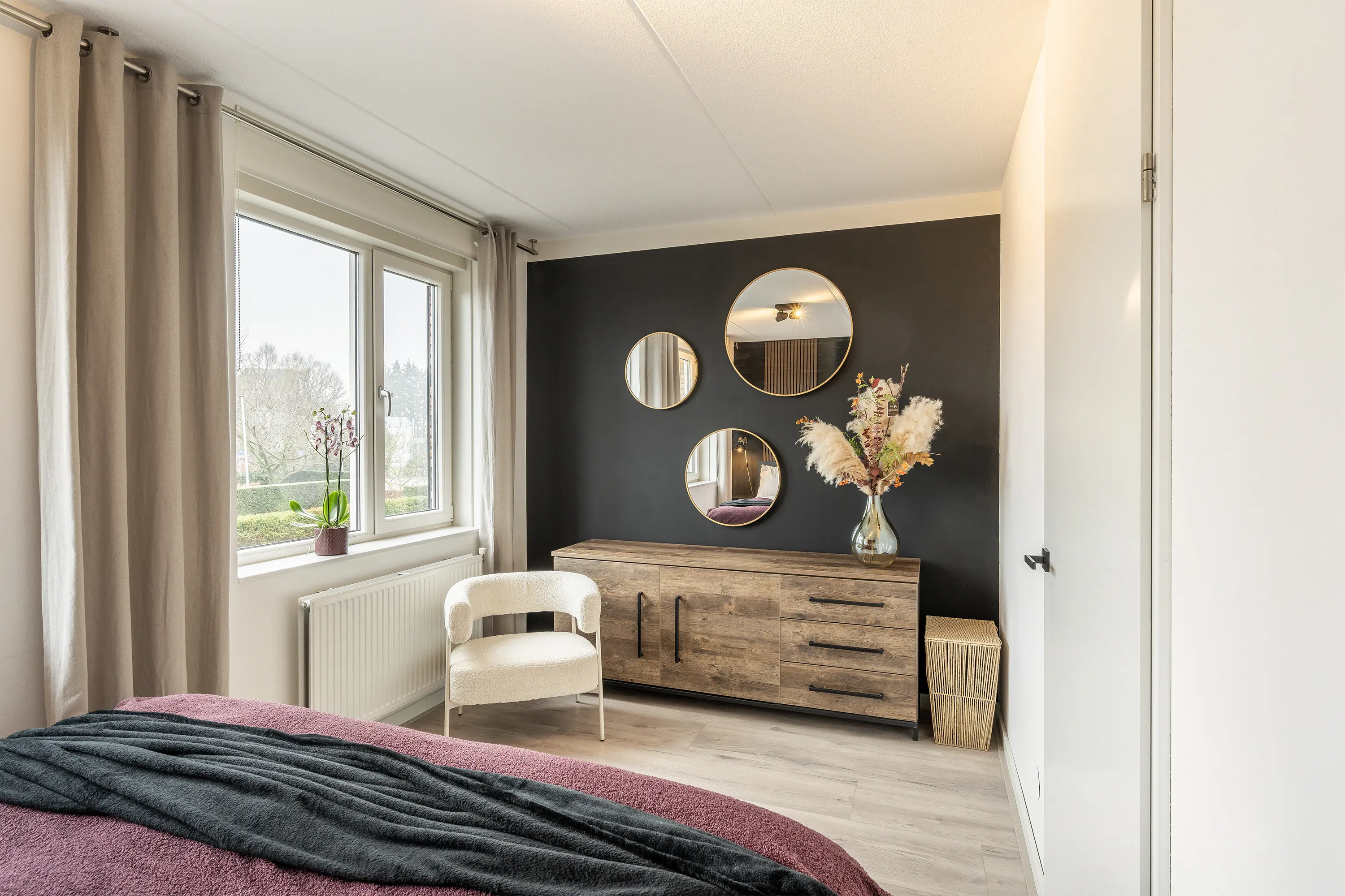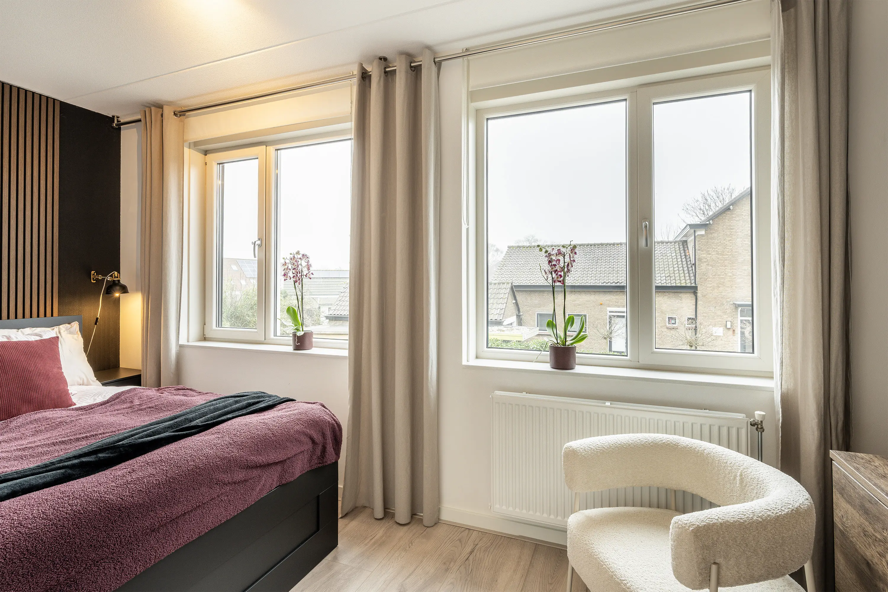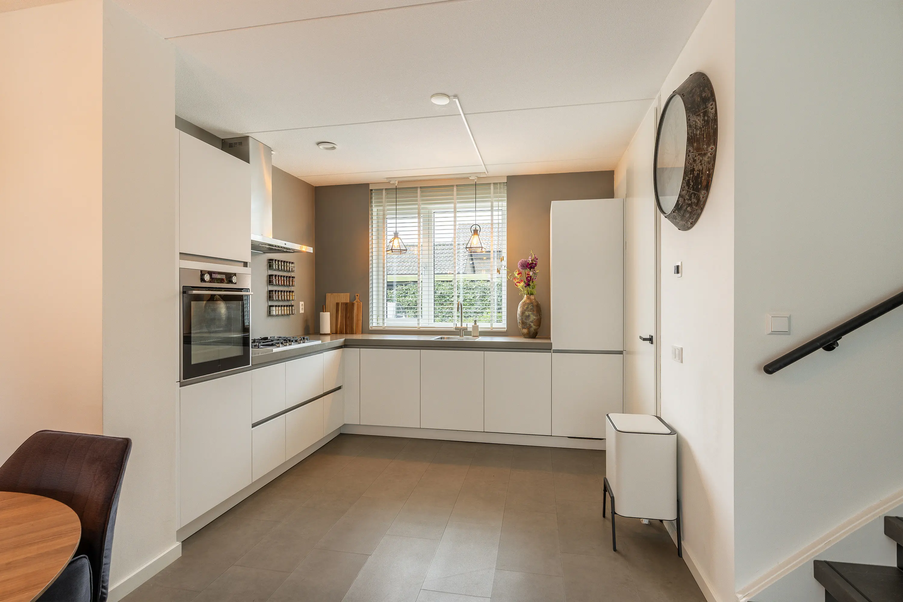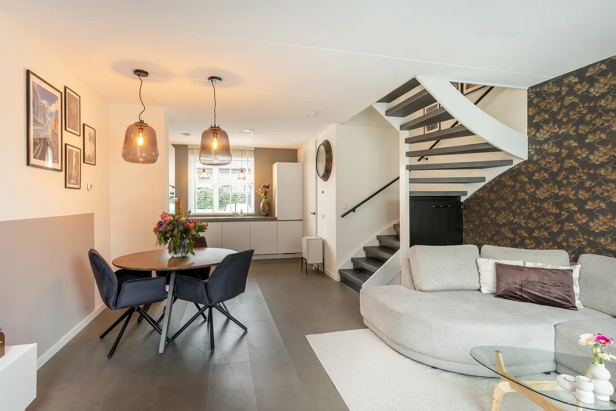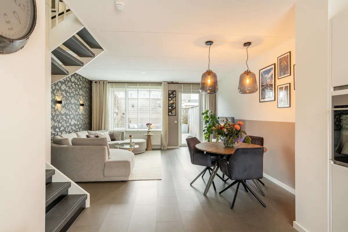 De woonkamer vormt het warme hart van de woning en biedt een heerlijke plek om te ontspannen en samen te komen. Vanwege de grote raampartijen heeft de woonkamer veel natuurlijke lichtinval, wat zorgt voor een prettige leefruimt. De moderne PVC-vloer geeft het geheel een stijlvolle uitstraling en is bovendien onderhoudsvriendelijk en duurzaam in gebruik. Dankzij de praktische indeling is er volop ruimte voor een comfortabele zithoek, terwijl de directe toegang tot de tuin zorgt voor een fijne verbinding tussen binnen en buiten.