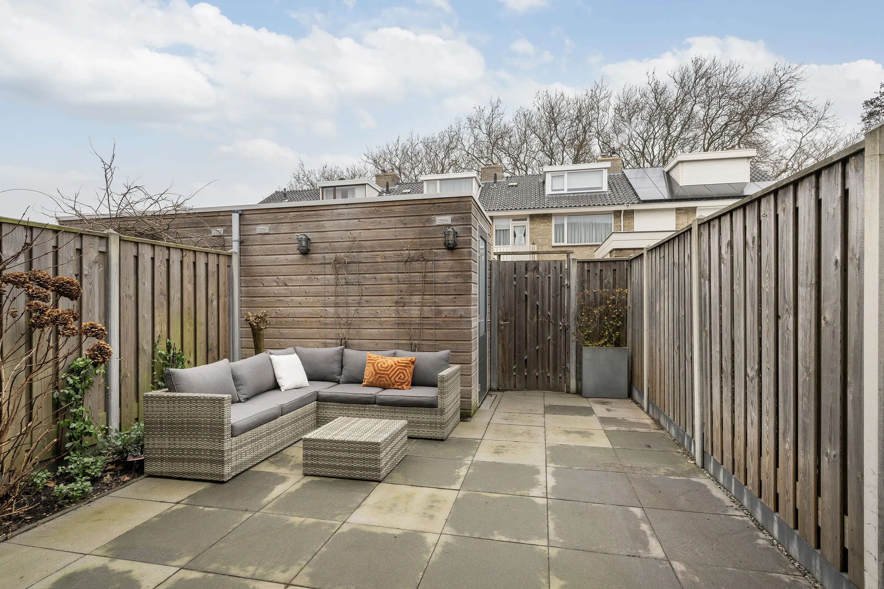 De verzorgde achtertuin is gelegen op het noordwesten, waardoor u in de middag en avond heerlijk van de zon kunt genieten. De tuin beschikt over een achterom en een vrijstaande houten berging met elektra, ideaal voor fietsen en gereedschap.