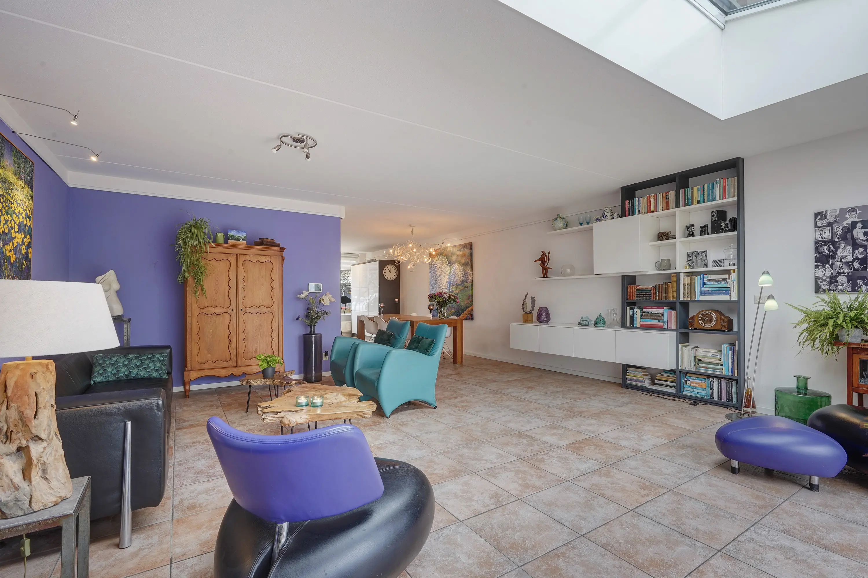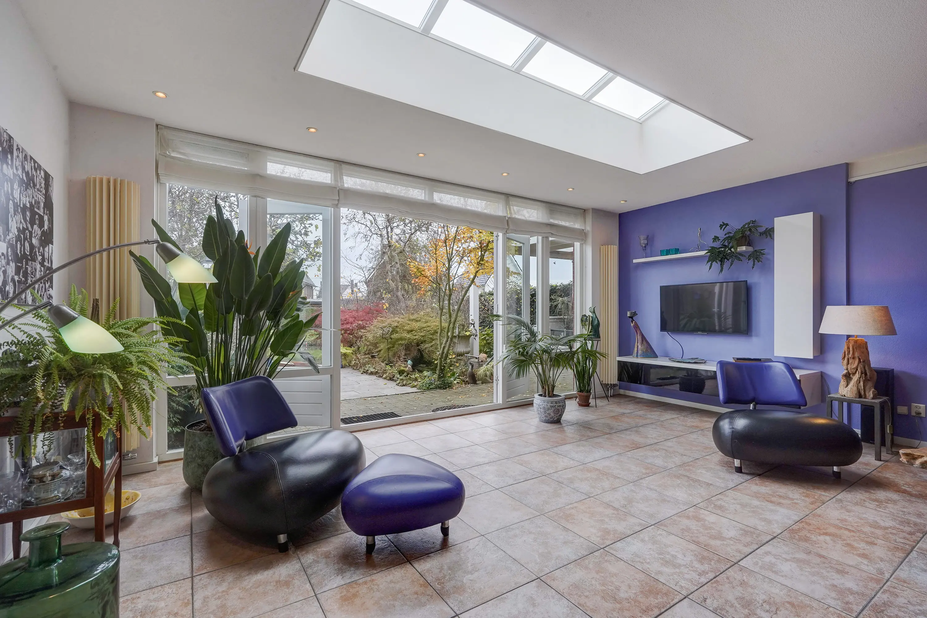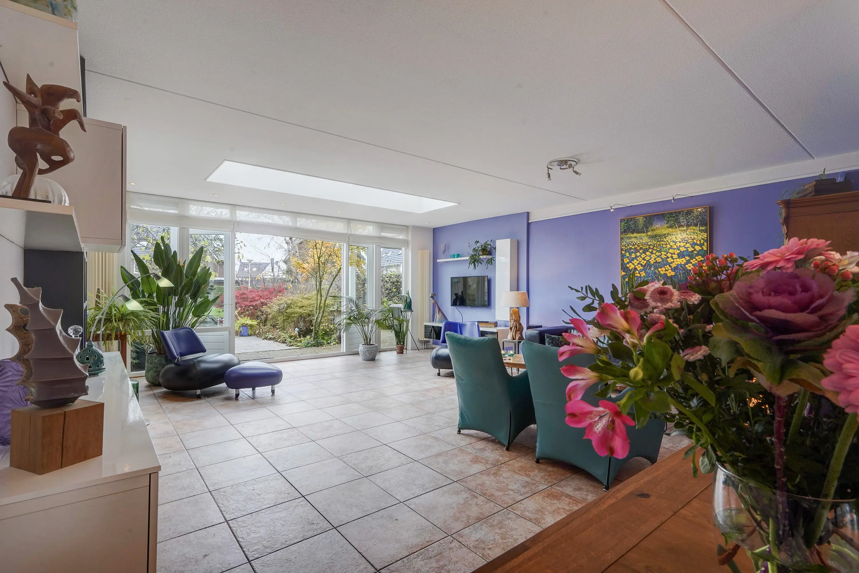 De woonkamer is aan de achterzijde uitgebouwd (2007) en voorzien van een lichtstraat, waardoor er veel daglicht naar binnenvalt. Openslaande deuren bieden een directe verbinding met de tuin en het doorgaande water. De plavuizen vloer met vloerverwarming en strak afgewerkte wanden maken het geheel helemaal af.