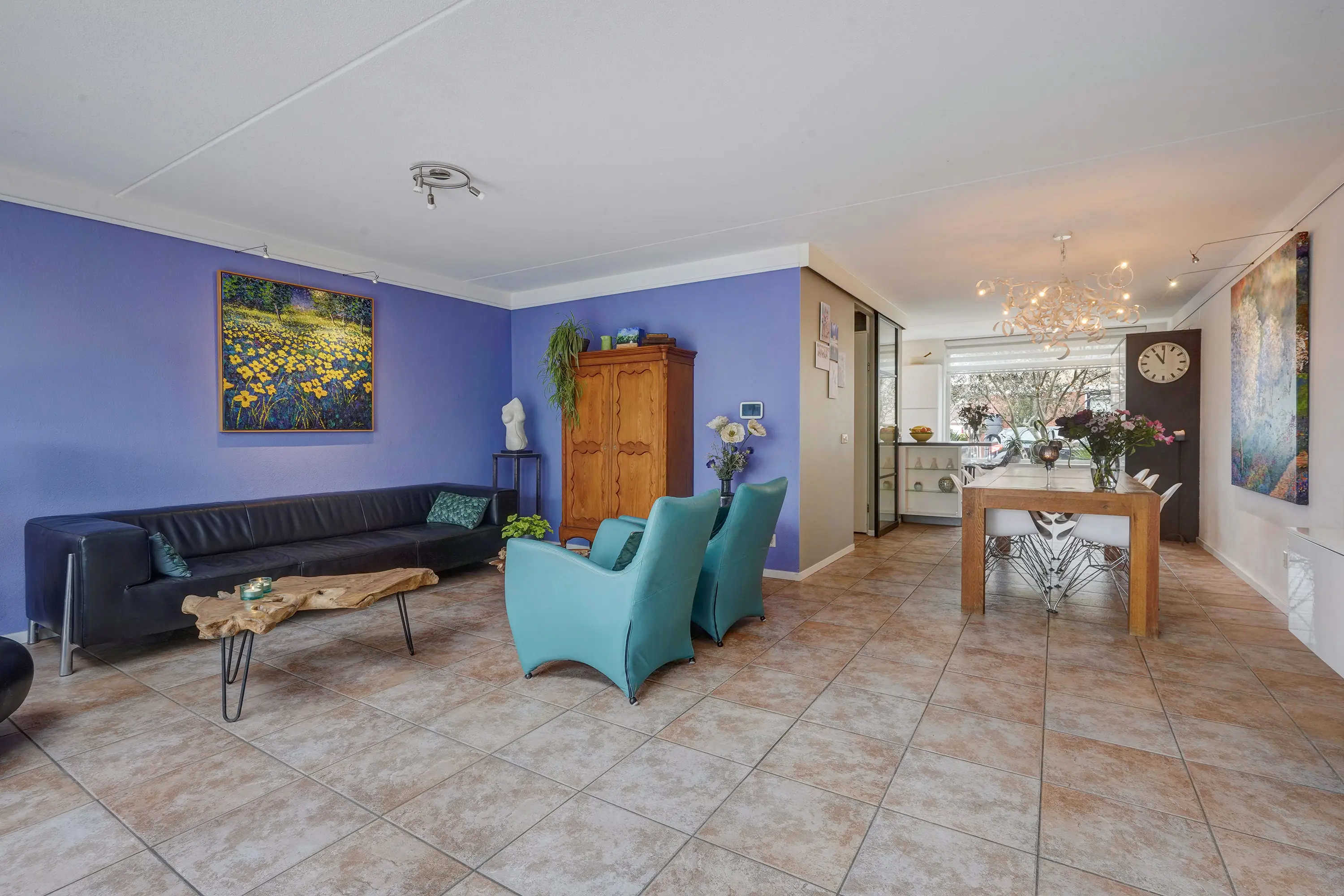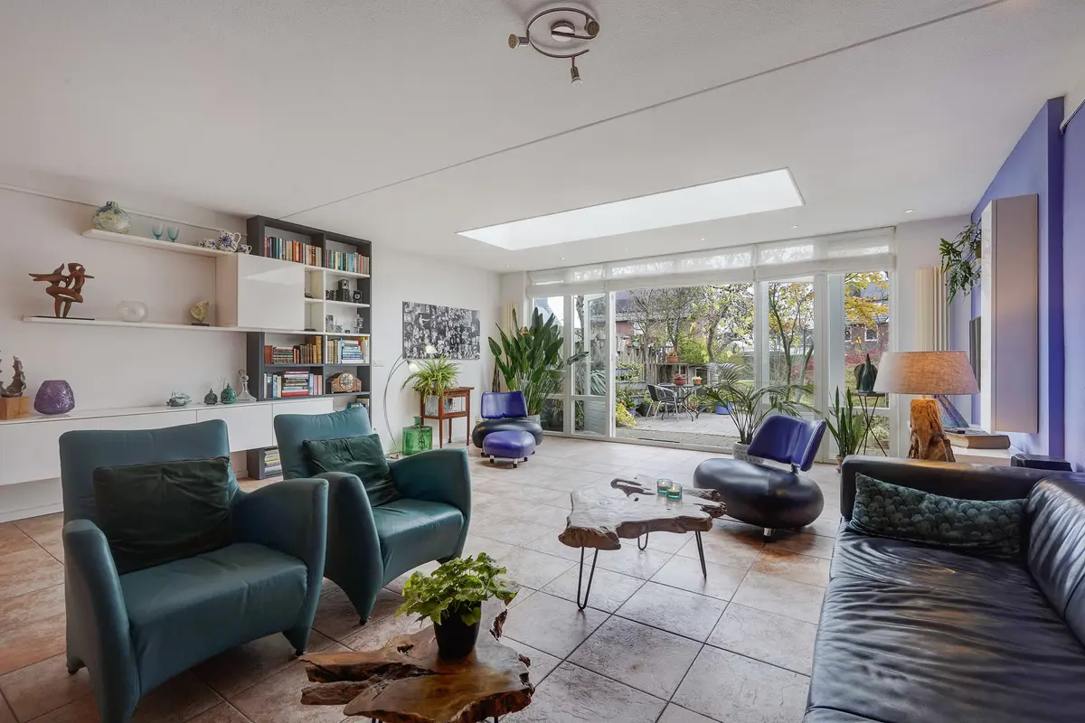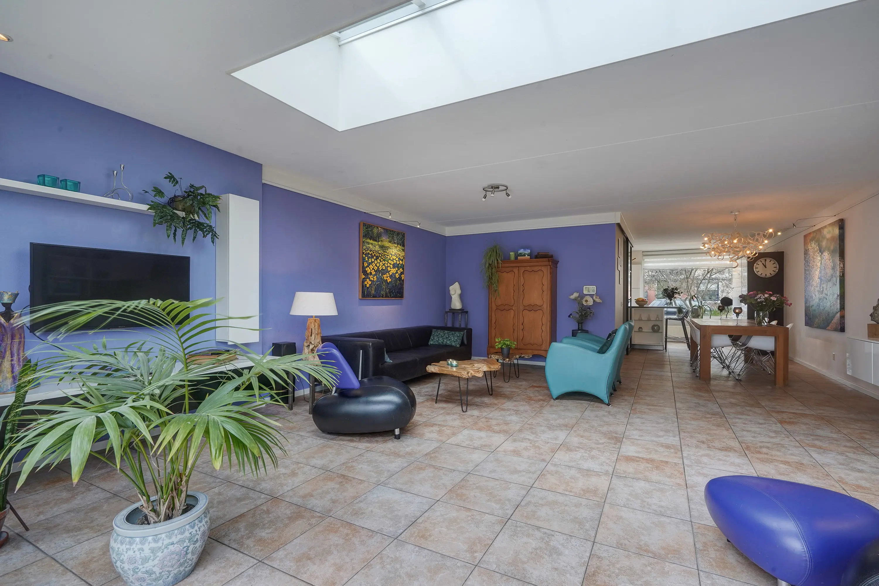 De woonkamer is aan de achterzijde uitgebouwd (2007) en voorzien van een lichtstraat, waardoor er veel daglicht naar binnenvalt. Openslaande deuren bieden een directe verbinding met de tuin en het doorgaande water. De plavuizen vloer met vloerverwarming en strak afgewerkte wanden maken het geheel helemaal af.