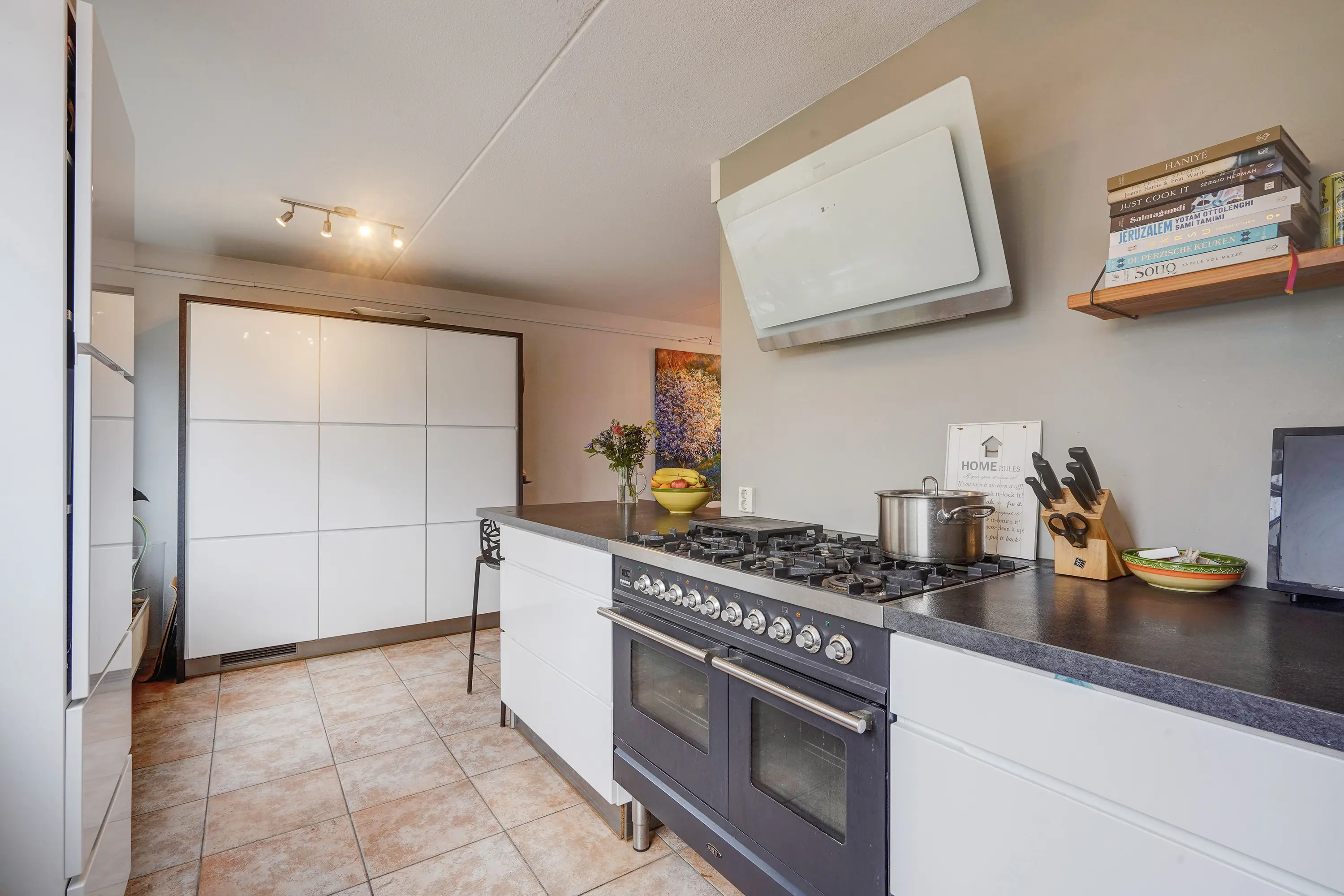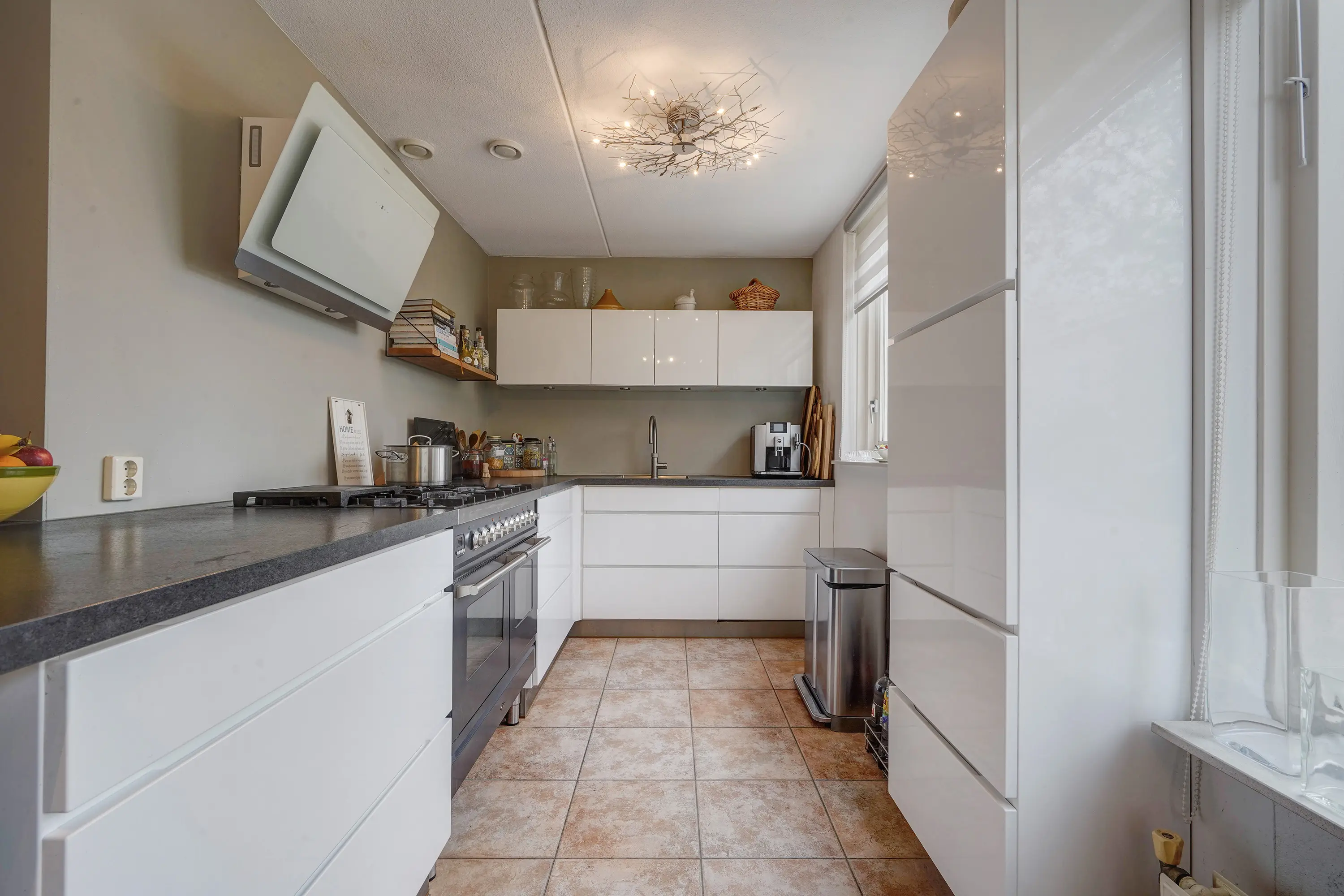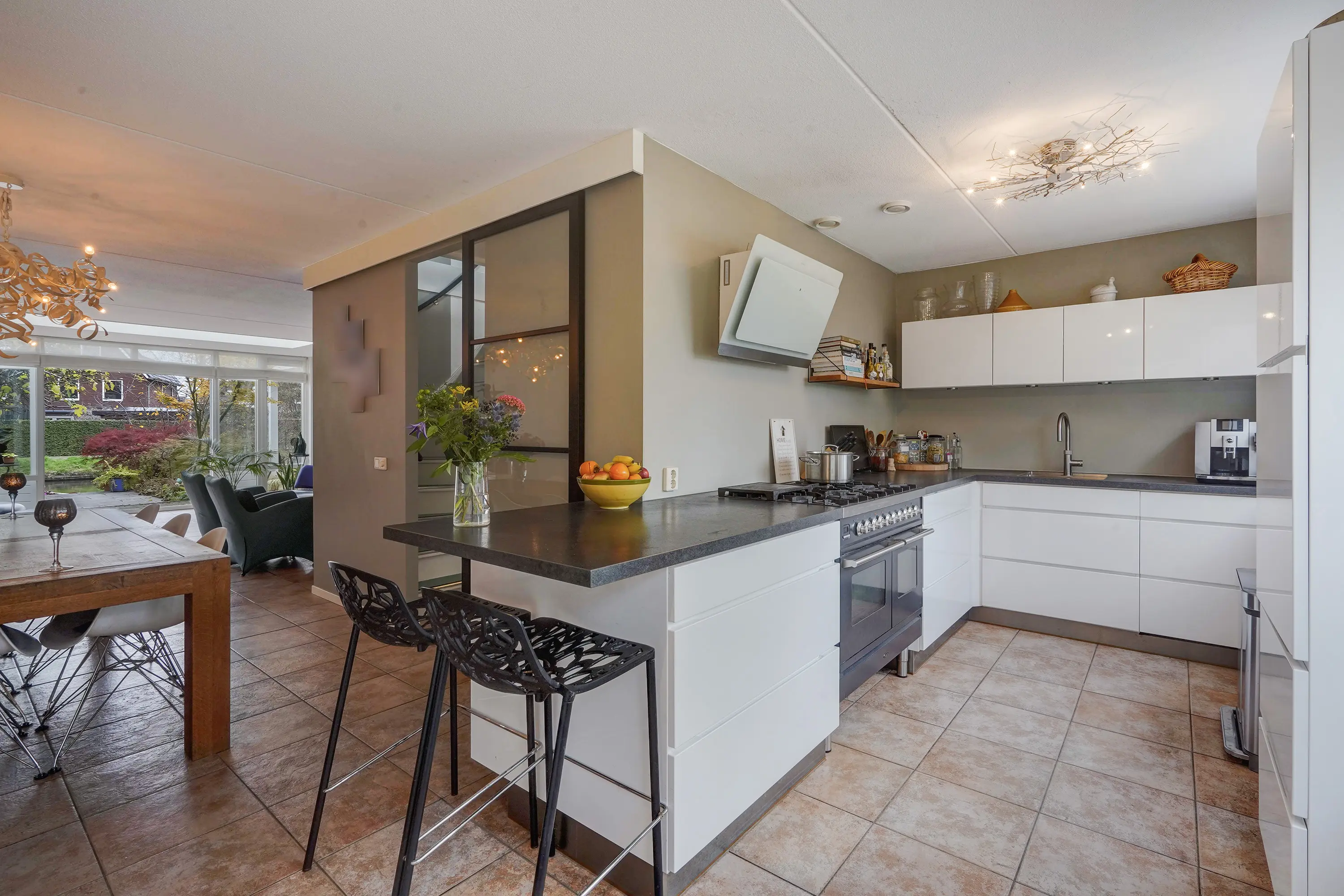 Aan de voorzijde vindt u de moderne witte hoogglans keuken (2016) met composiet werkblad, gezellige bar en Boretti-fornuis. Daarnaast is de keuken o.a. voorzien van een Quooker (2018), afwasmachine (2022) en close-in boiler (2024). Een praktische en smaakvolle ruimte om uitgebreid te koken of gezellig samen te zijn.