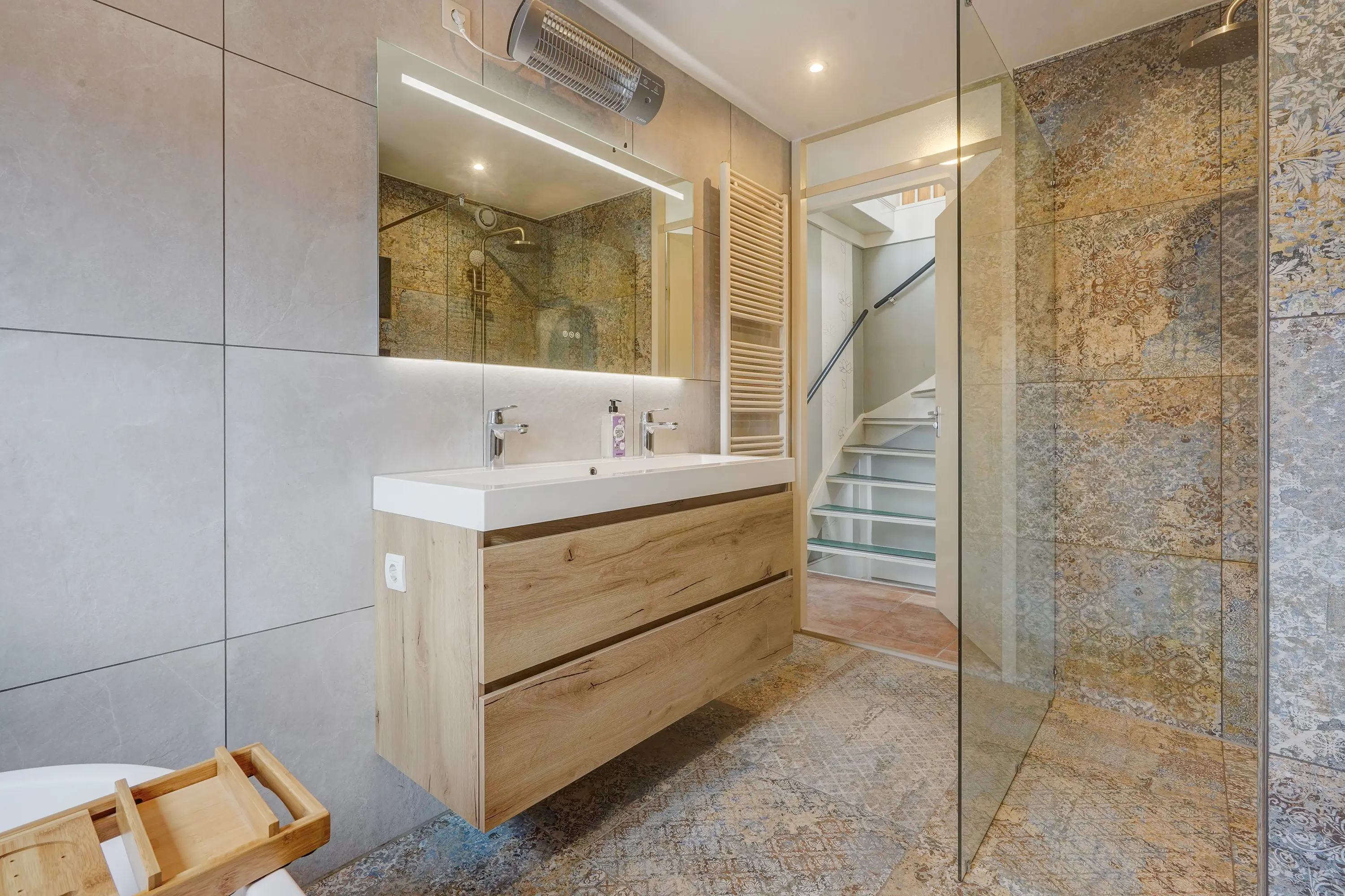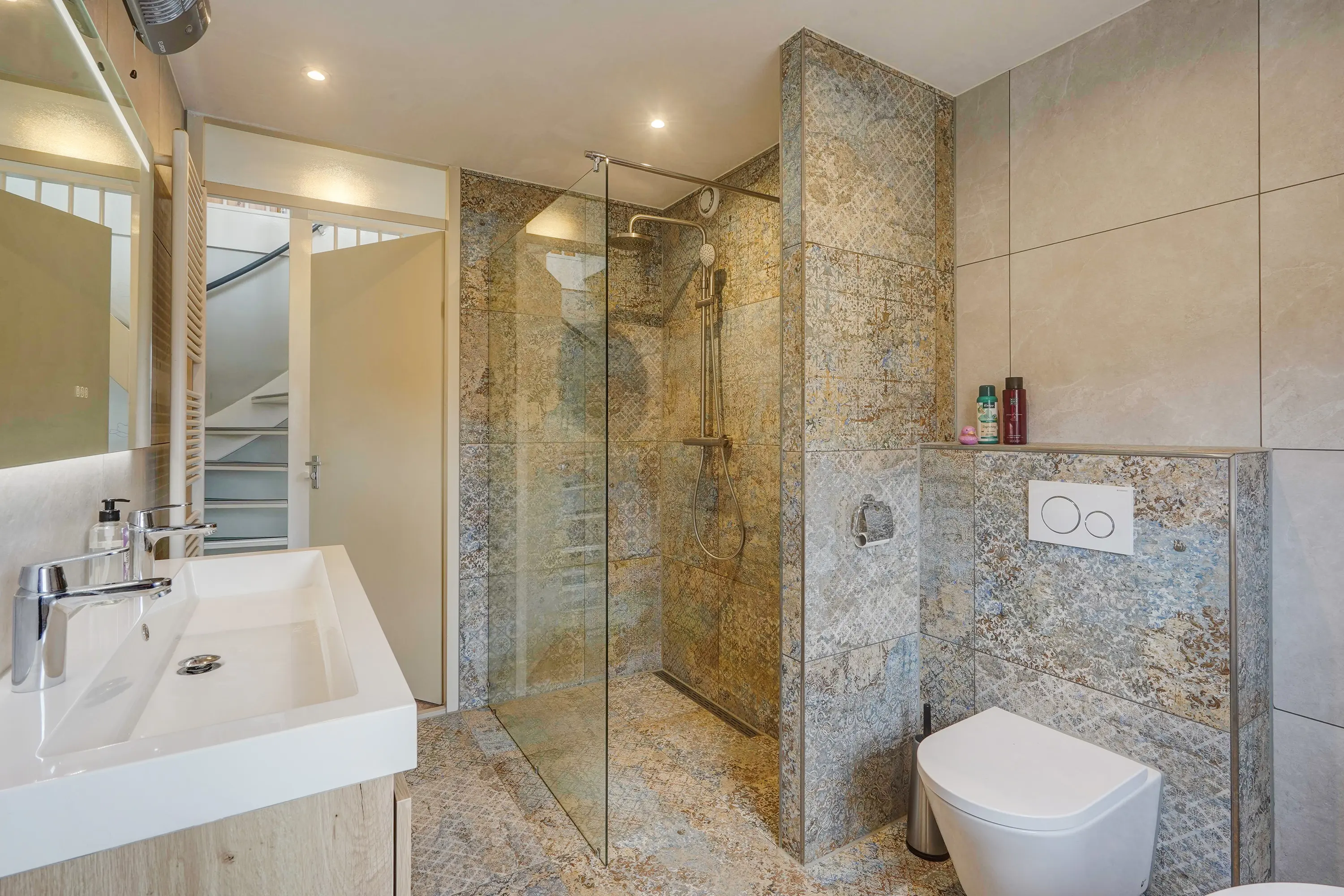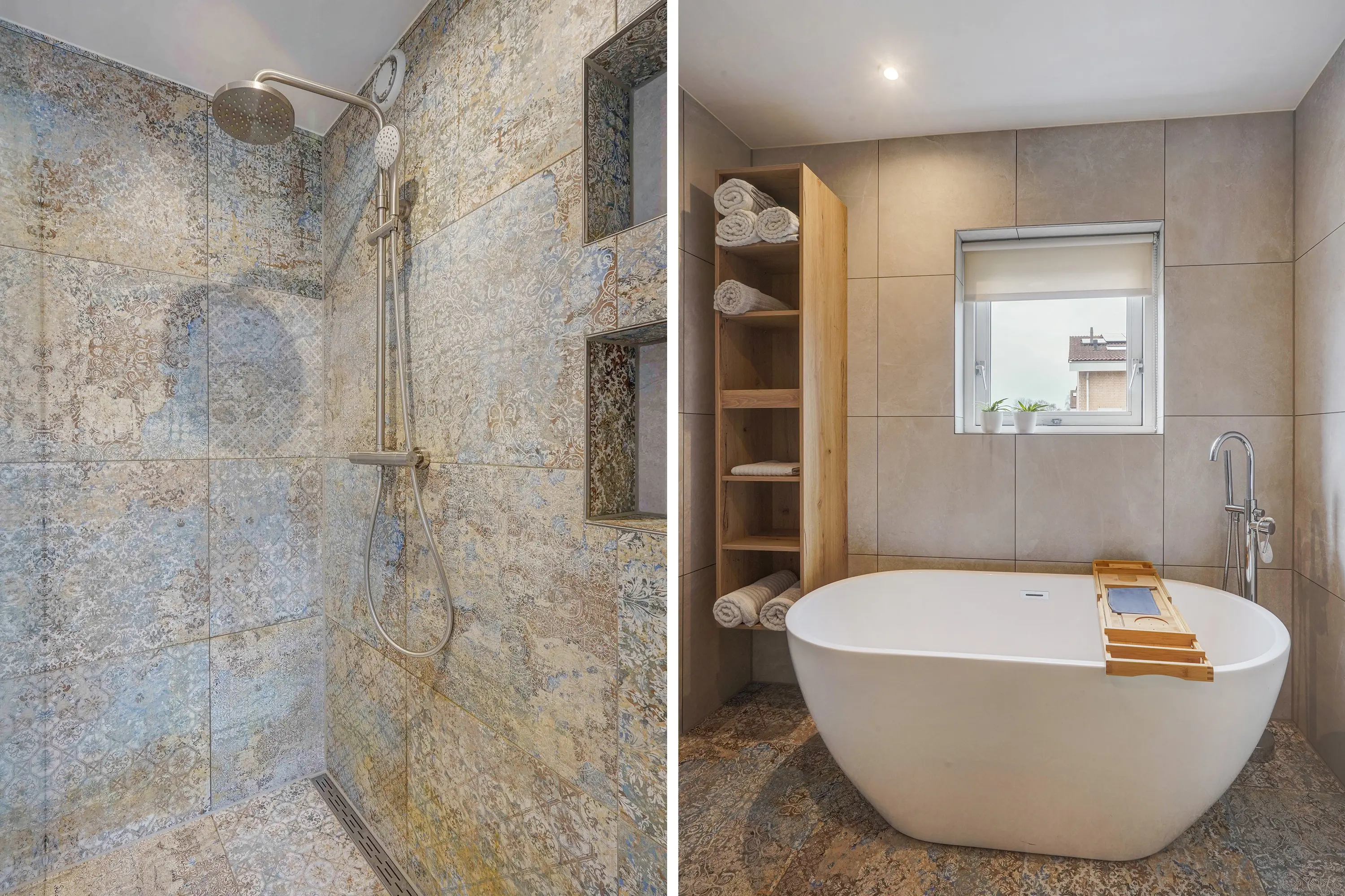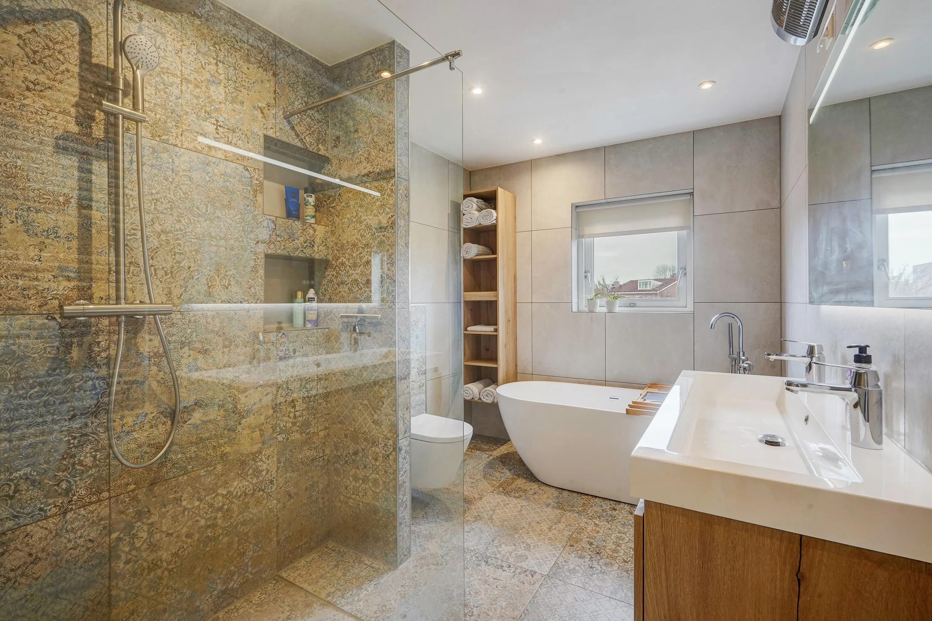 De badkamer (2022) is modern en stijlvol, met een losstaand ligbad, ruime inloopdouche, dubbel wastafelmeubel en tweede toilet. De royale afmetingen zorgen dat deze ruimte praktisch is voor het hele gezin.