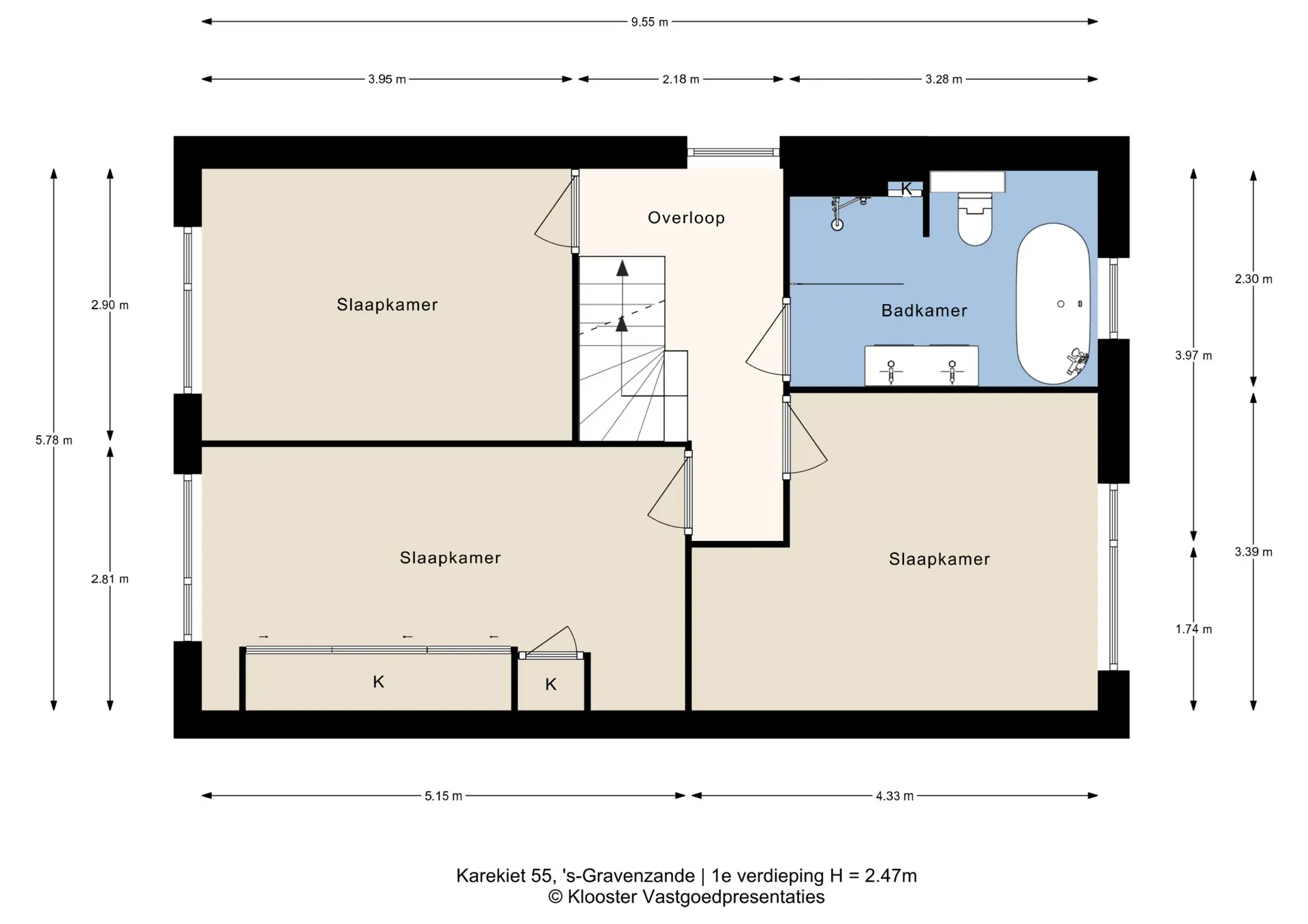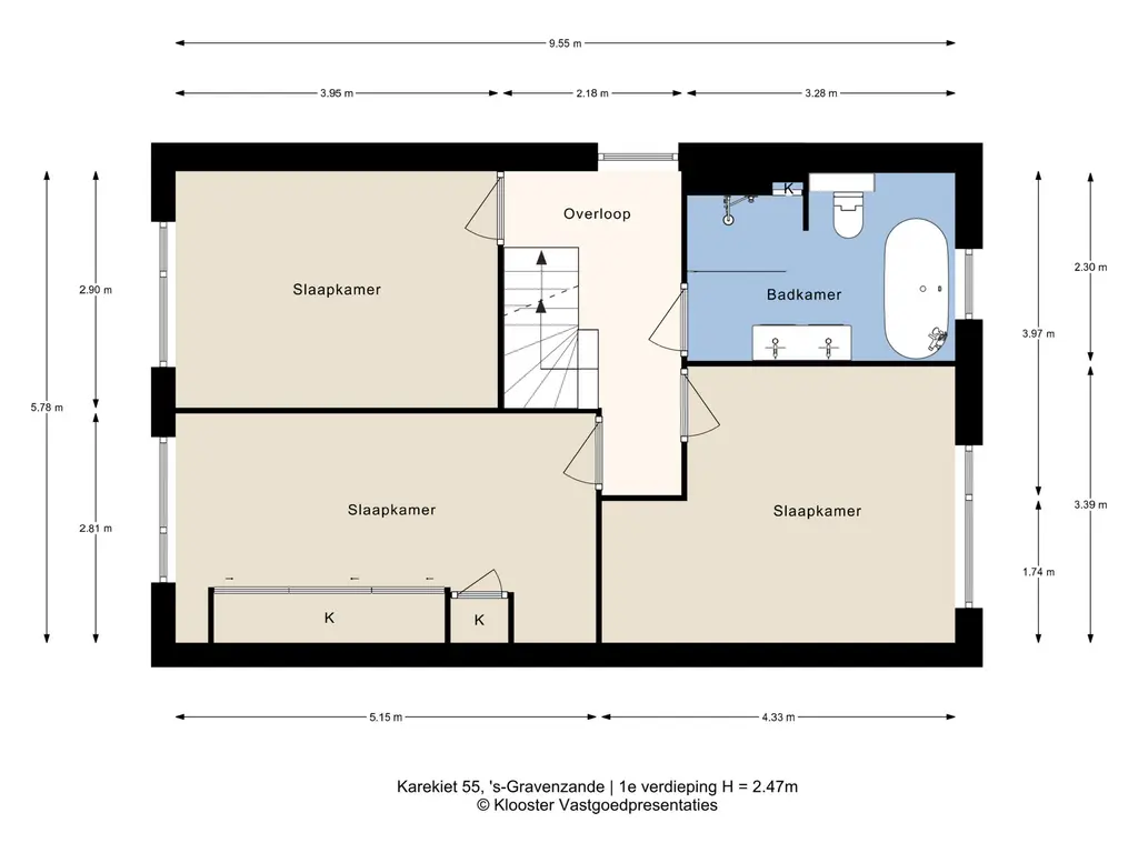 Via de vaste trap vanuit de hal bereikt u de eerste verdieping. U vindt hier drie slaapkamers en een luxe badkamer.