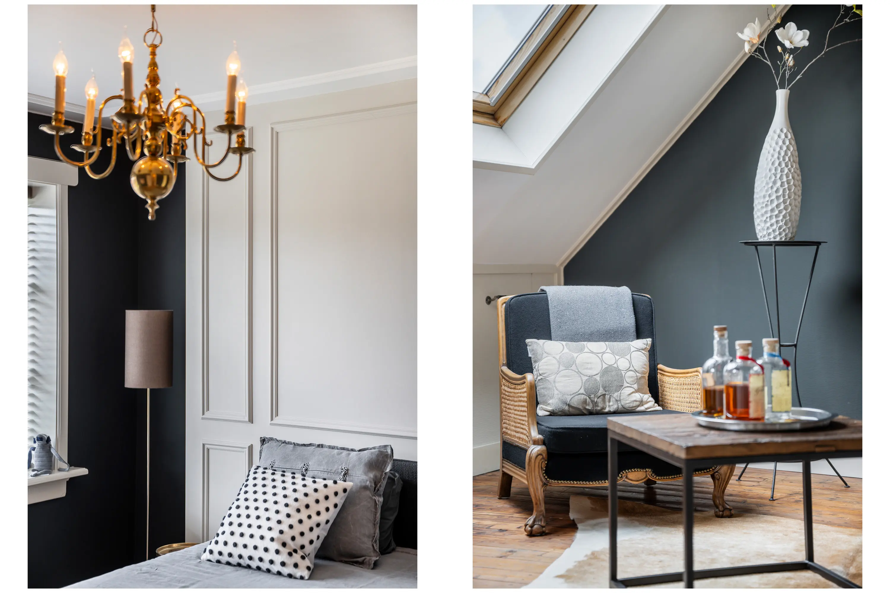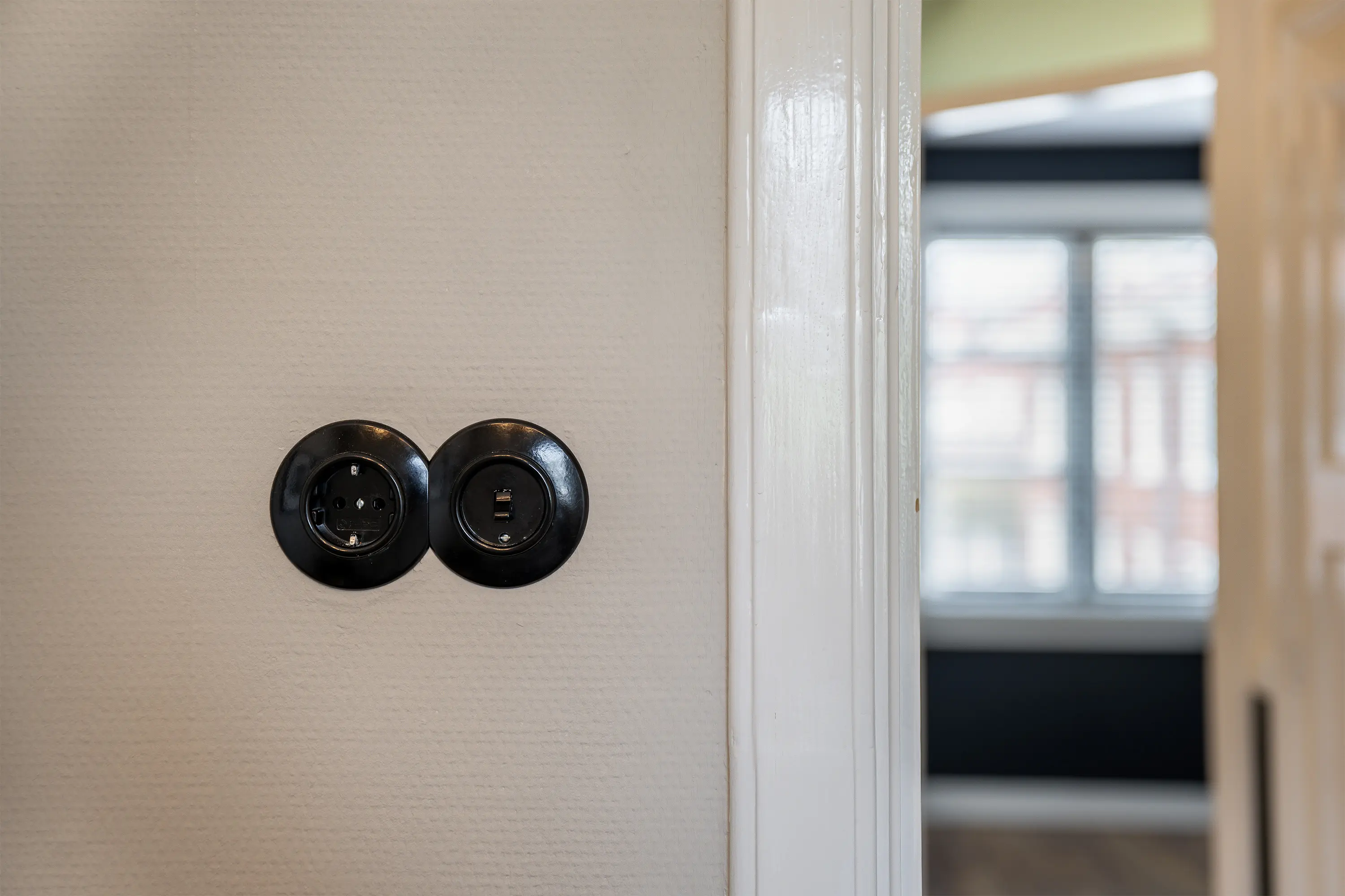 - Door de hele woning zijn nieuwe wandschakelaars en stopcontacten geplaatst in bakeliet jaren ’30-stijl. Ook het deurbeslag is volledig in deze klassieke stijl uitgevoerd;