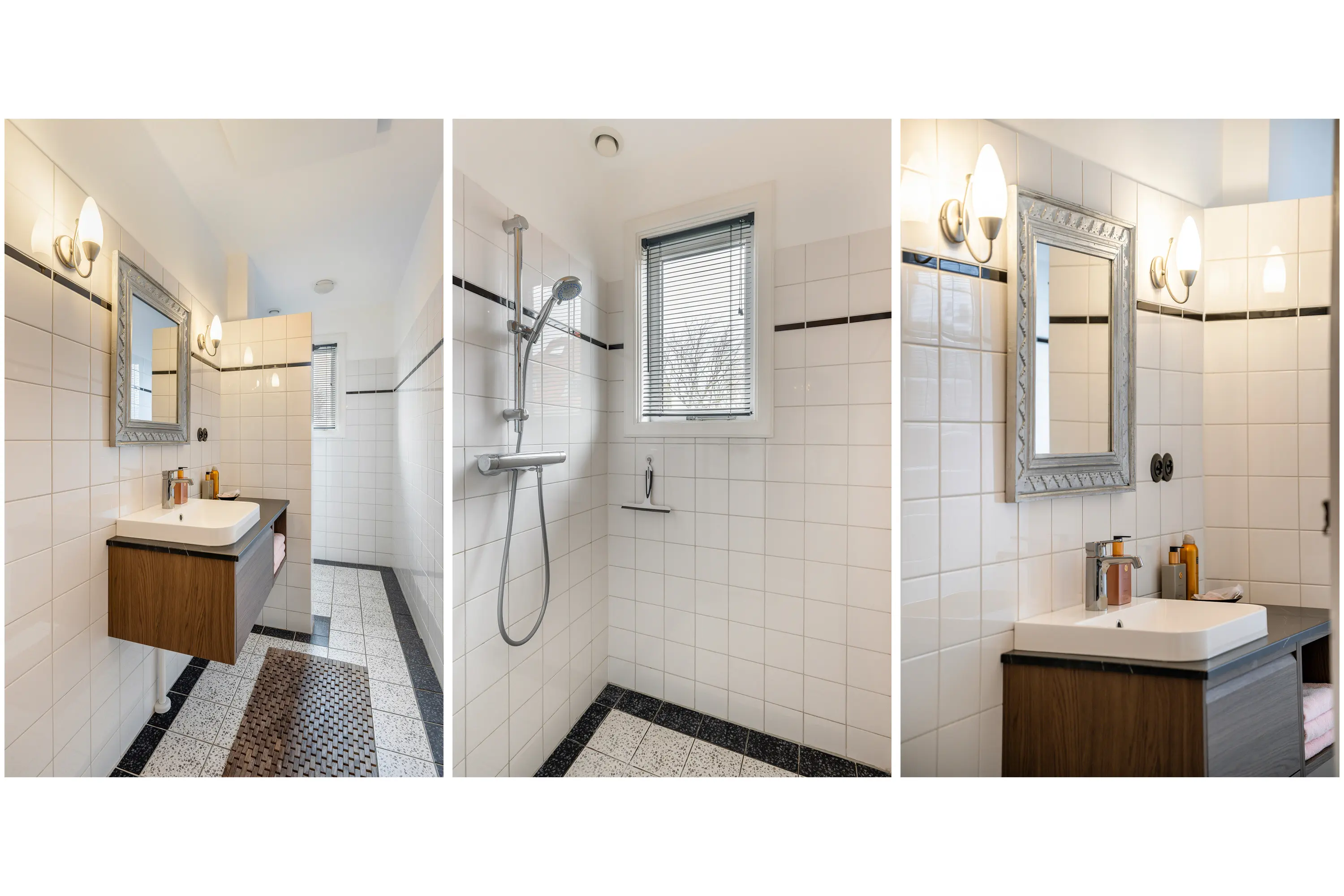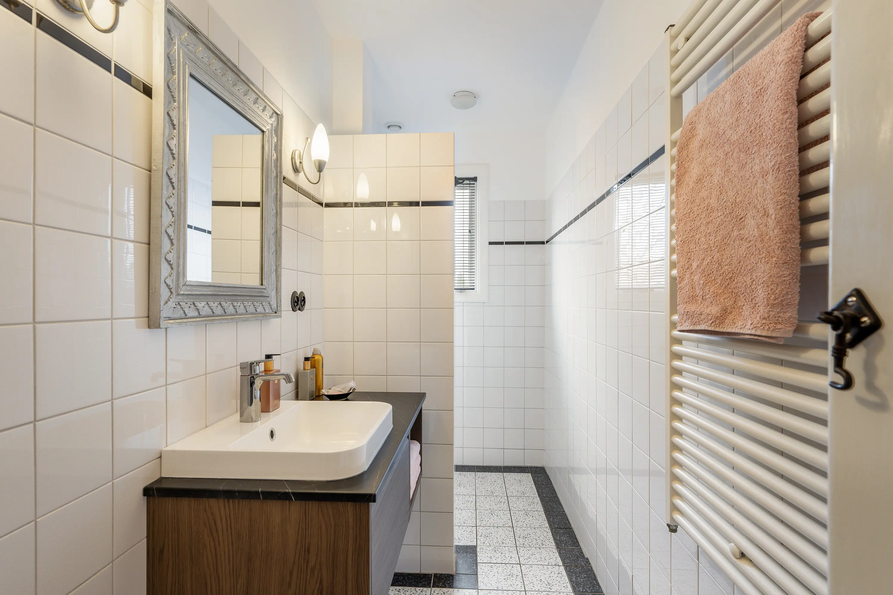 De badkamer is netjes afgewerkt en beschikt over een modern wastafelmeubel en een inloopdouche aan de achterzijde. Dankzij het aanwezige raam is er natuurlijke ventilatie, wat bijdraagt aan een fris en aangenaam klimaat in de ruimte.