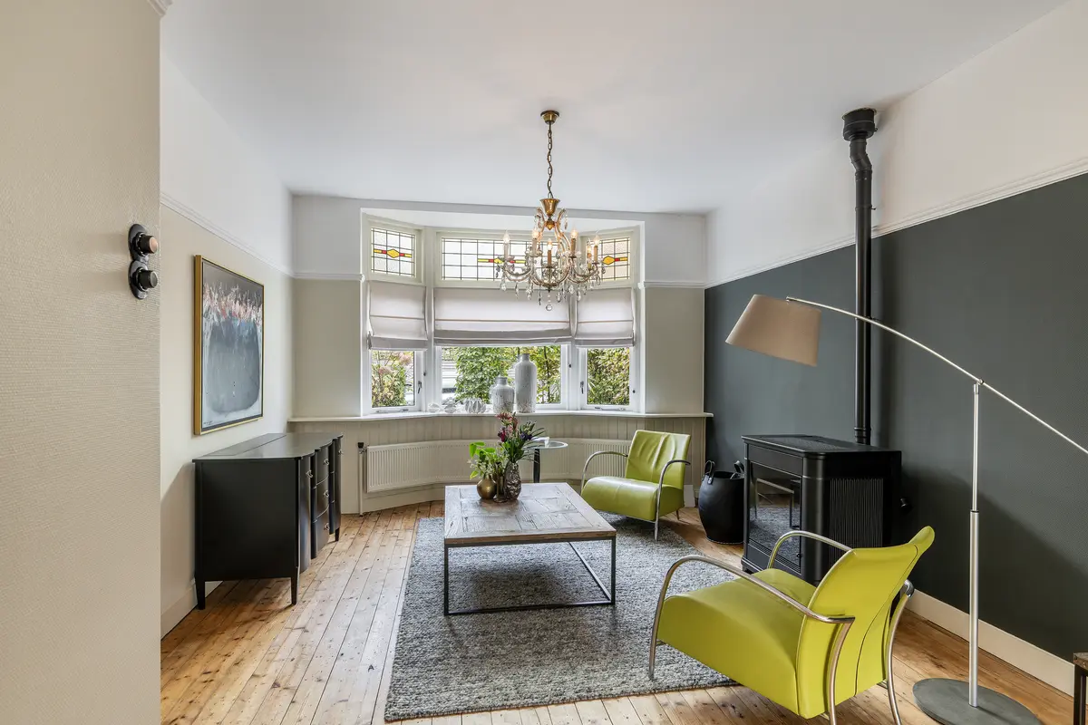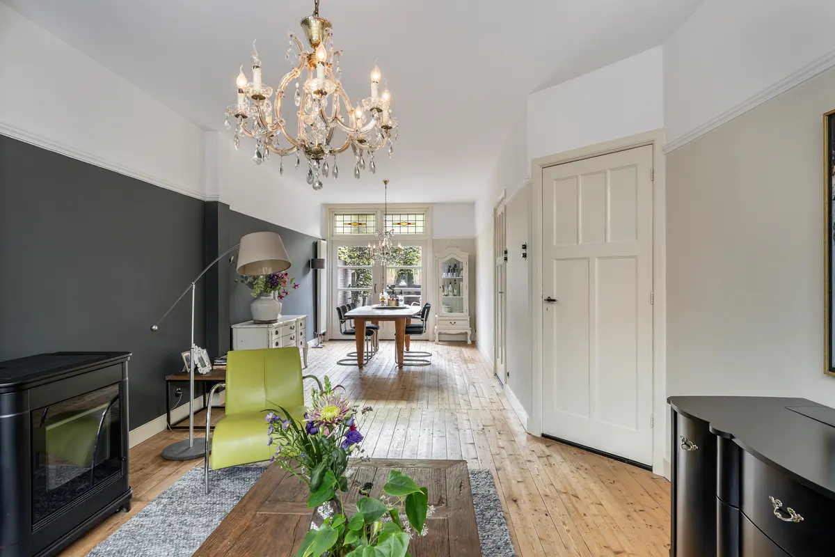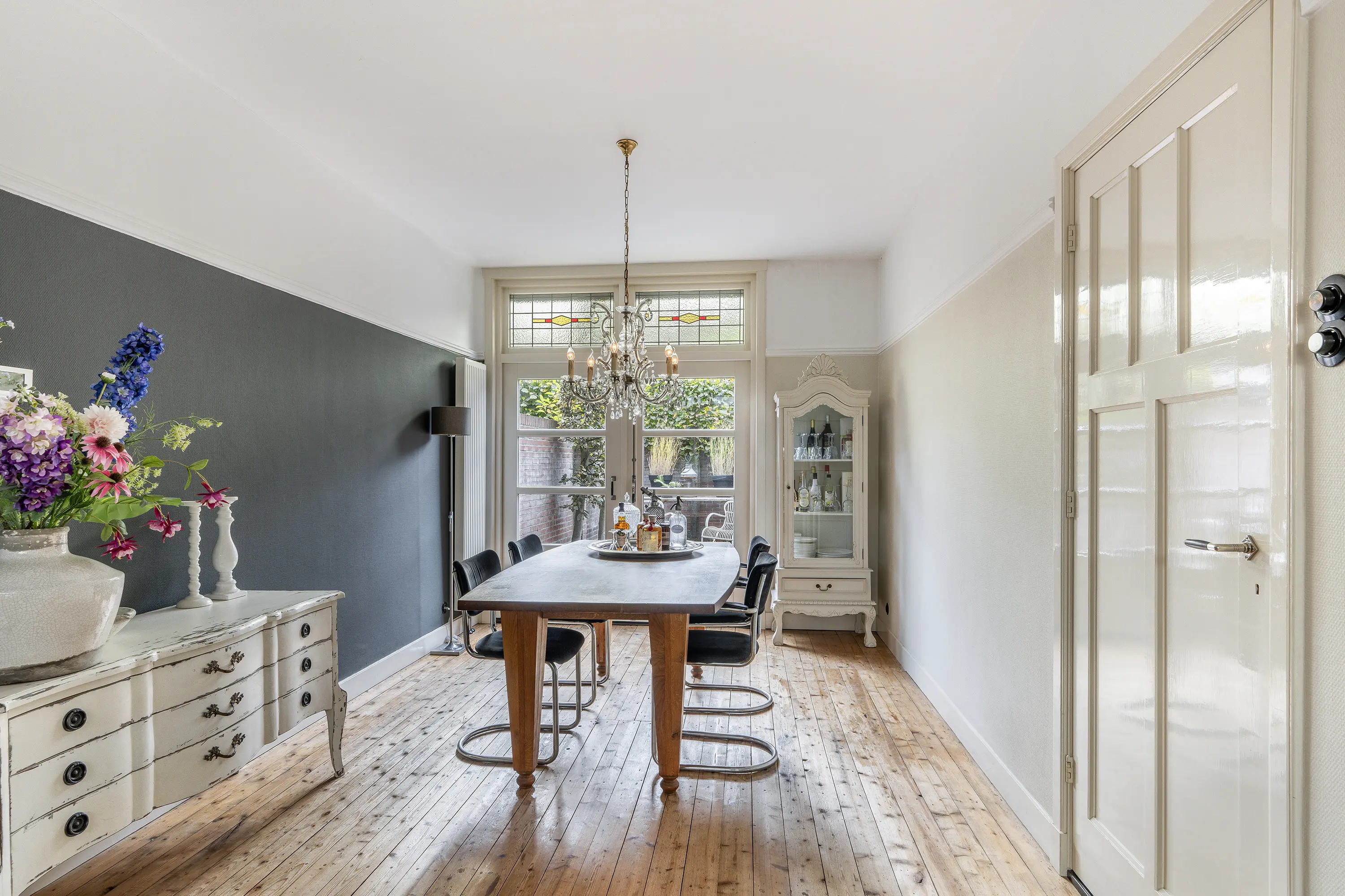 De grote doorzonwoonkamer biedt aan de voorzijde een sfeervol zitgedeelte, compleet met pelletkachel en een karakteristieke glas-in-loodafwerking in het voorraam – een echte eyecatcher die zorgt voor een unieke en warme sfeer. Aan de achterzijde van de woonkamer bevindt zich het eetgedeelte, grenzend aan grote openslaande deuren die toegang geven tot de zonnige achtertuin. Deze opstelling zorgt voor veel daglicht en maakt het een heerlijke plek om te dineren of te ontspannen.