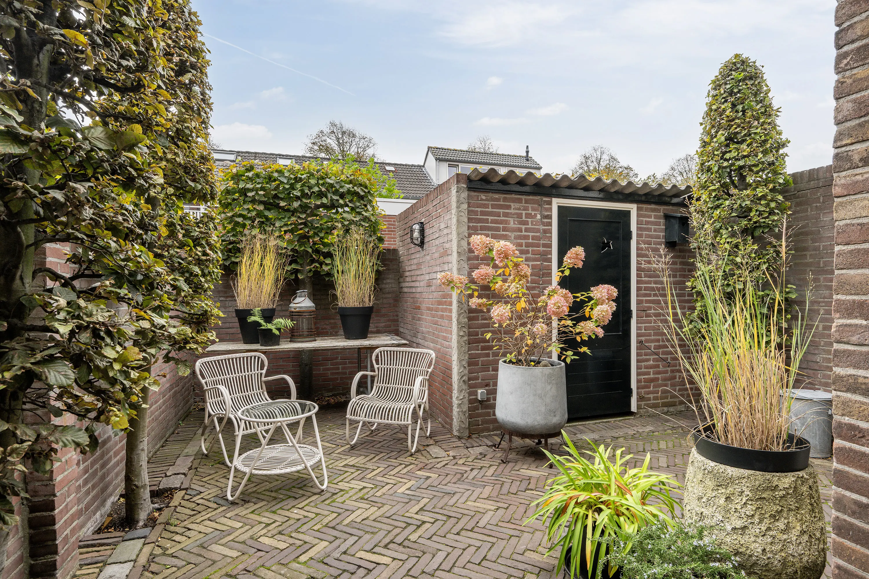 De achtertuin is gesitueerd op het zonnige zuidwesten en beschikt over een vrijstaand stenen berging, buitenkraan en buitenzonwering.
