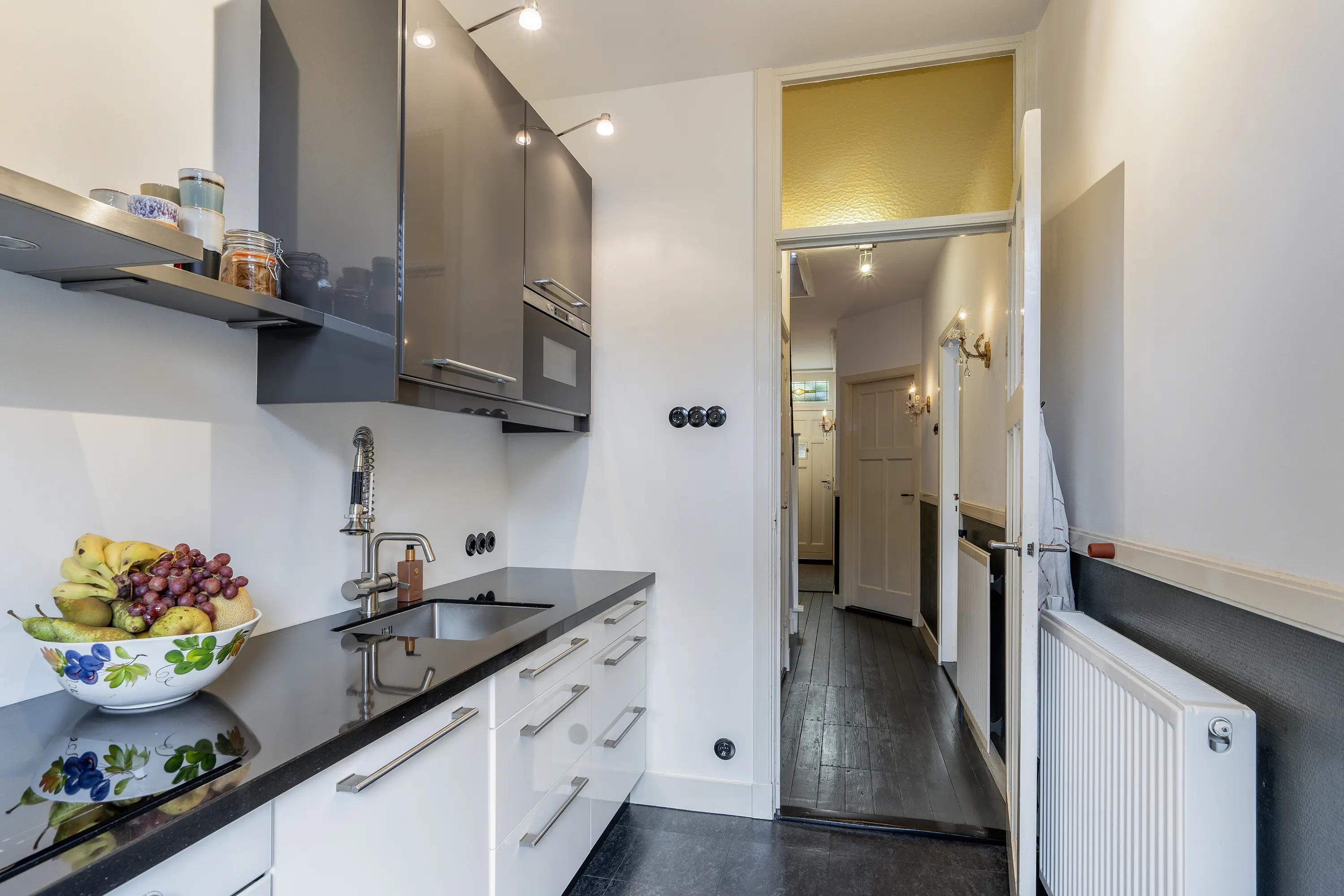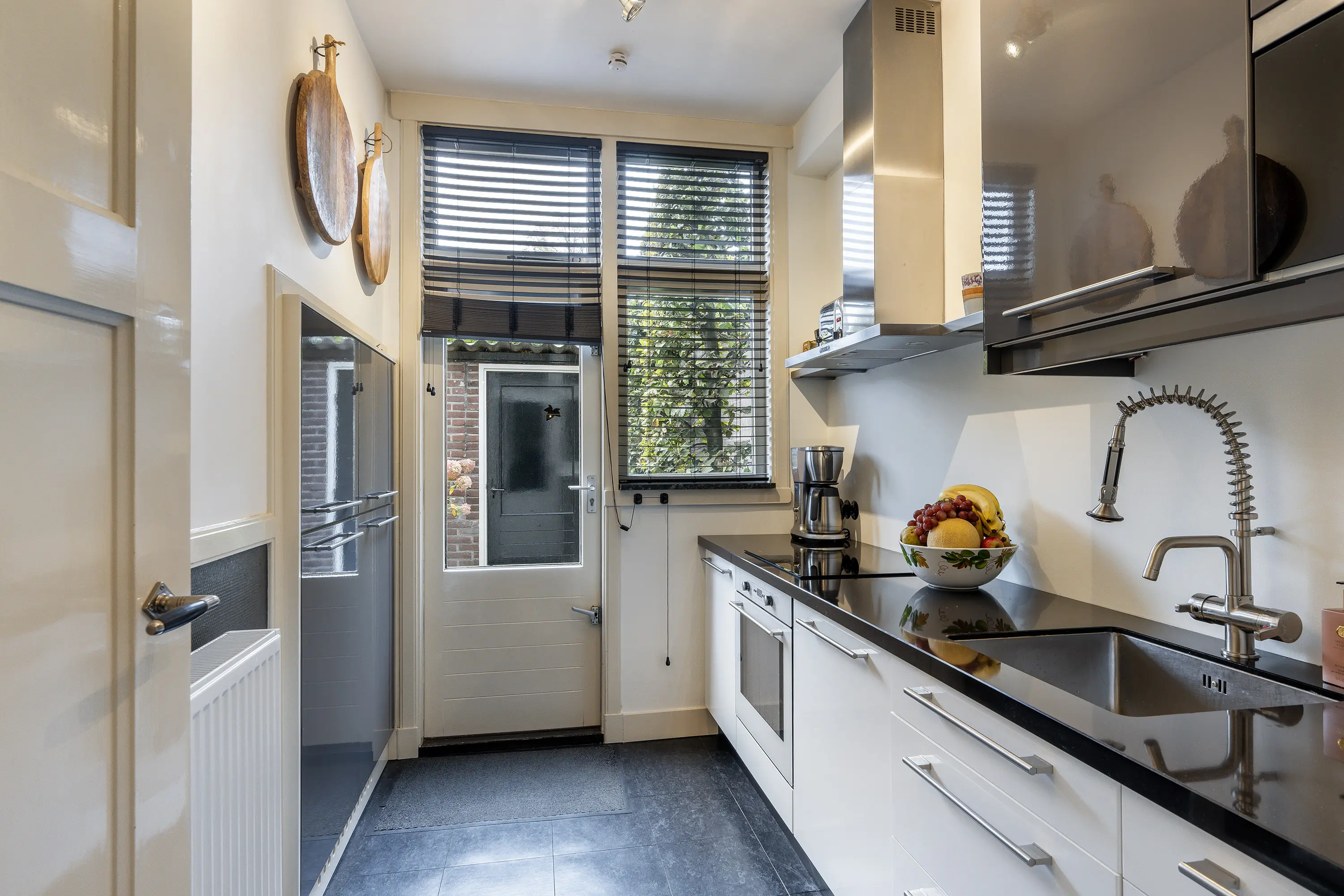 Via de hal bereikt u ook de keuken. Deze is voorzien van diverse inbouwapparatuur, beschikt over een inductiekookplaat op een stijlvol zwart werkblad en magnetron, oven, vaatwasser, koelkast en vriezer. Zeer praktisch is de 10L boiler waardoor u binnen een mum van tijd warm water heeft. Ook vanuit de keuken heeft u directe toegang tot de achtertuin, wat het praktisch en aangenaam maakt tijdens het koken en buiten eten.