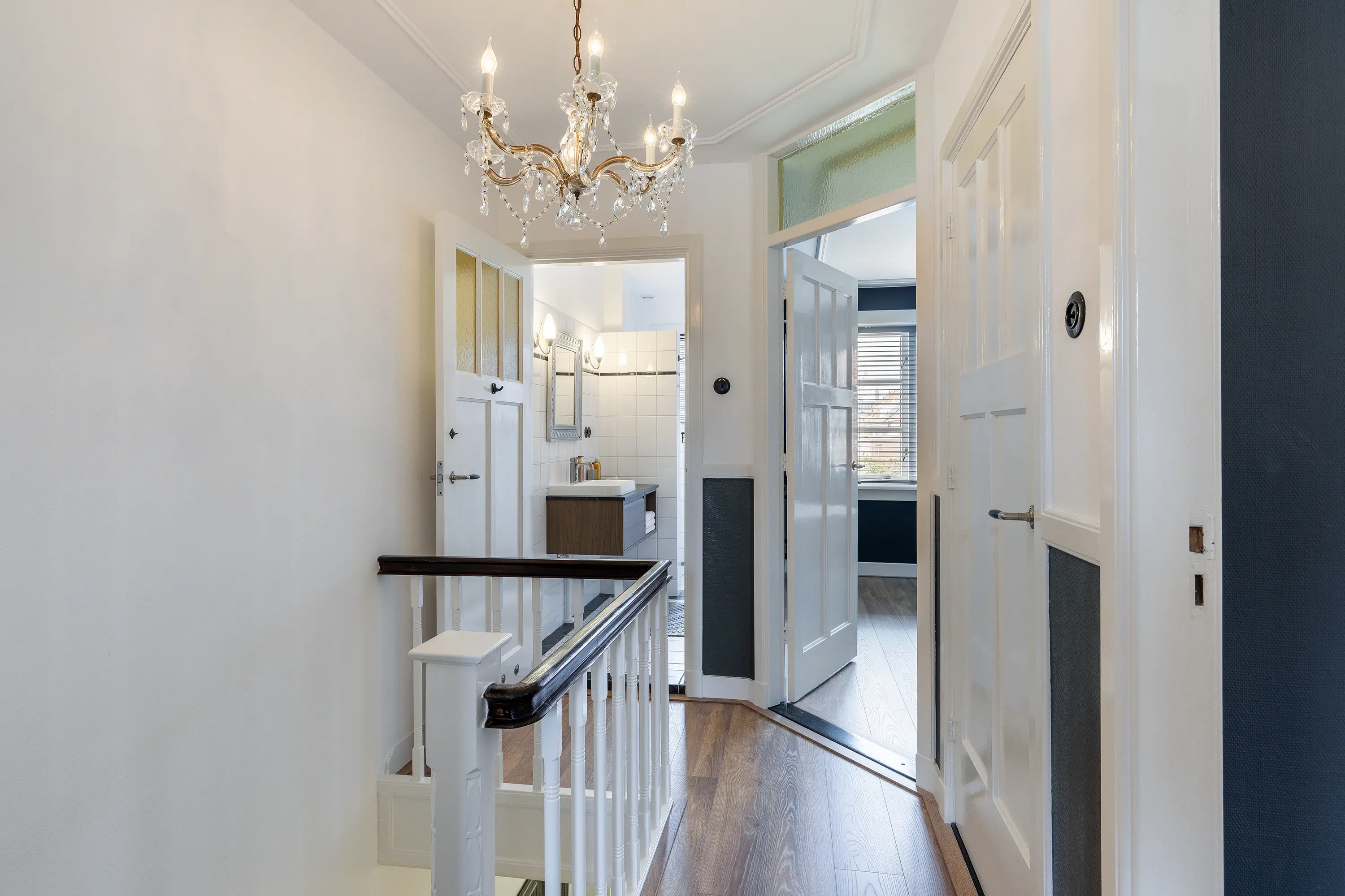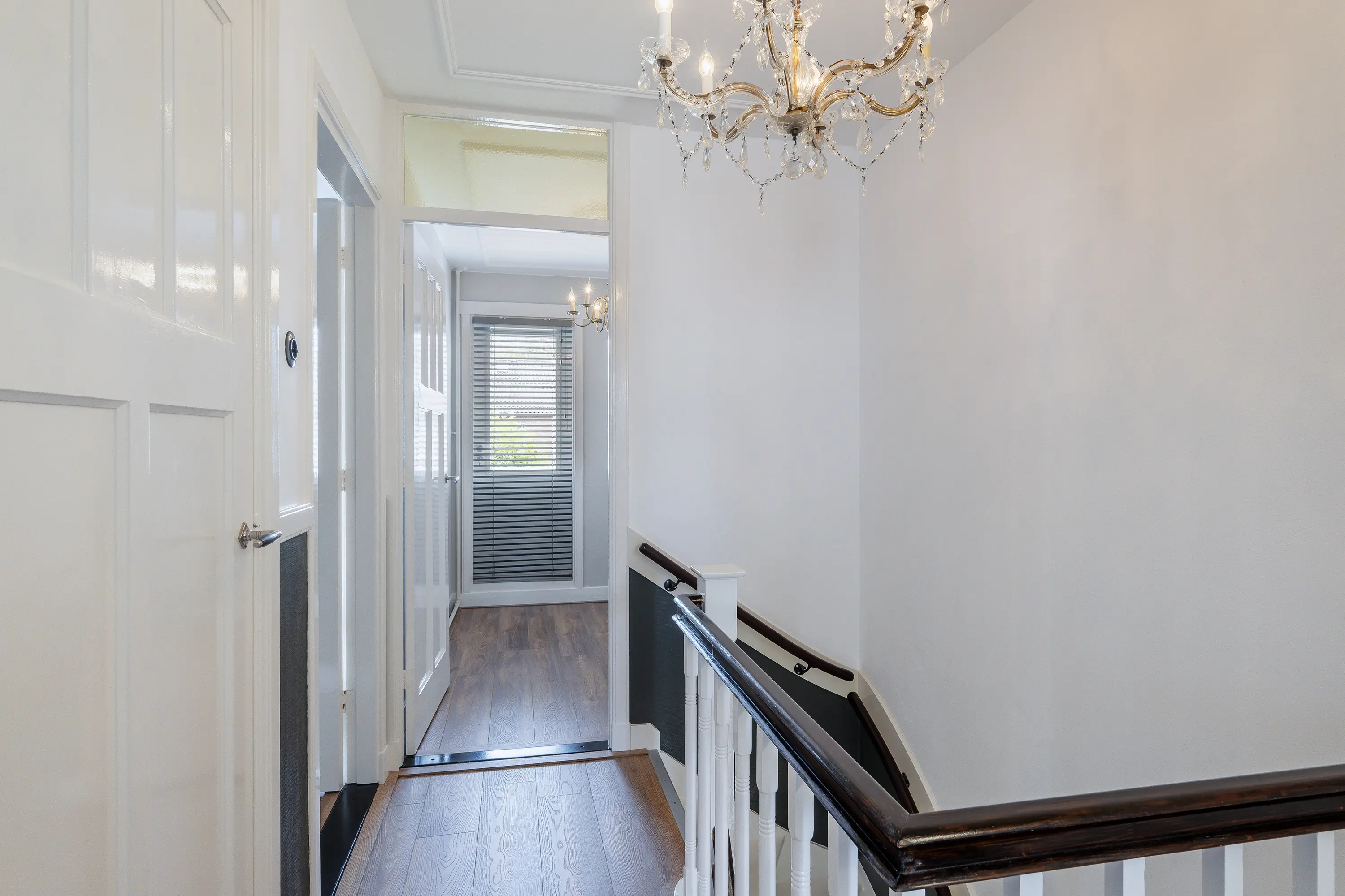 Via de trap komt u op de overloop van de eerste verdieping. Vanaf hier heeft u toegang tot drie slaapkamers en de badkamer. De vaste trap naar de zolder is keurig weggewerkt achter een deur op de overloop.