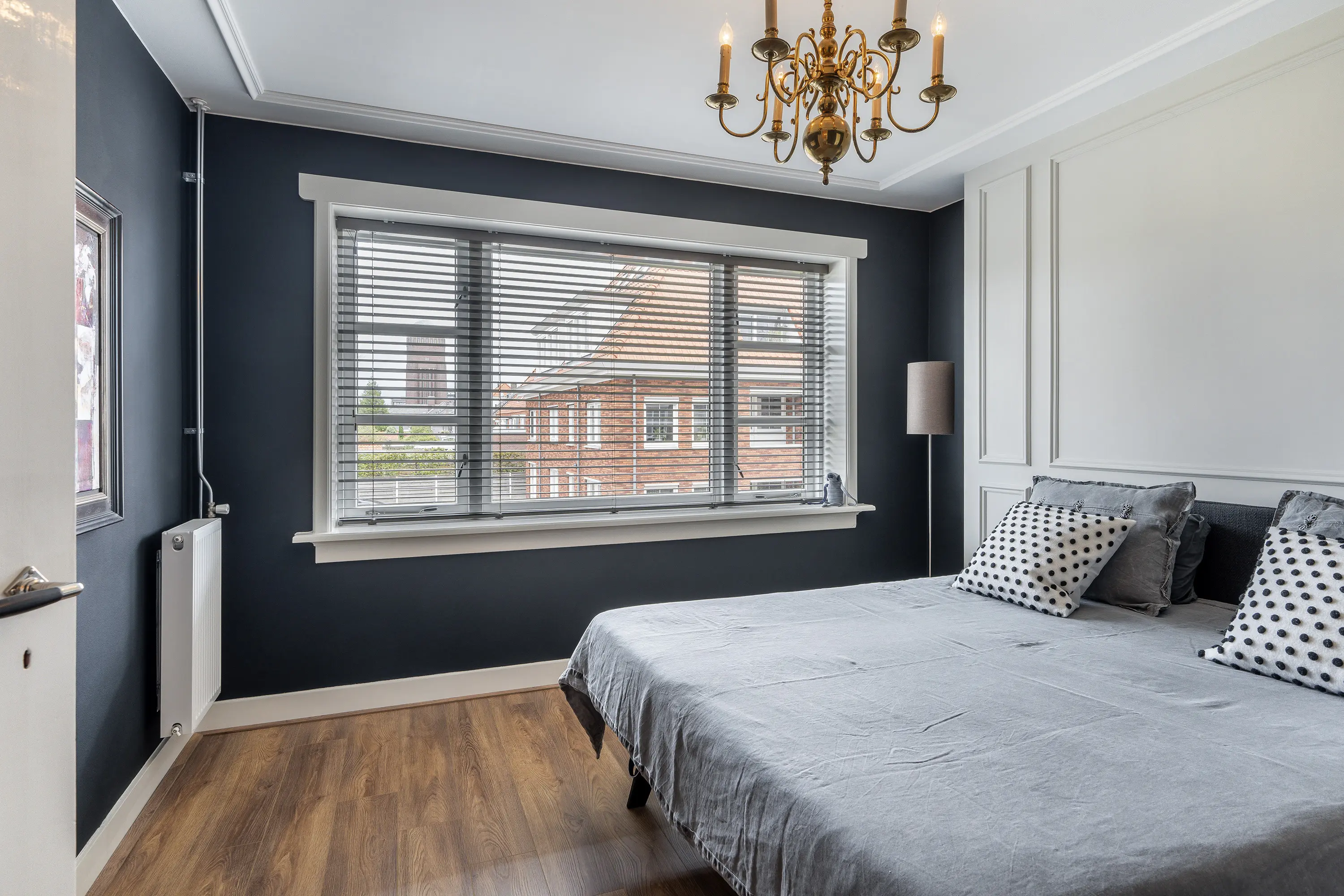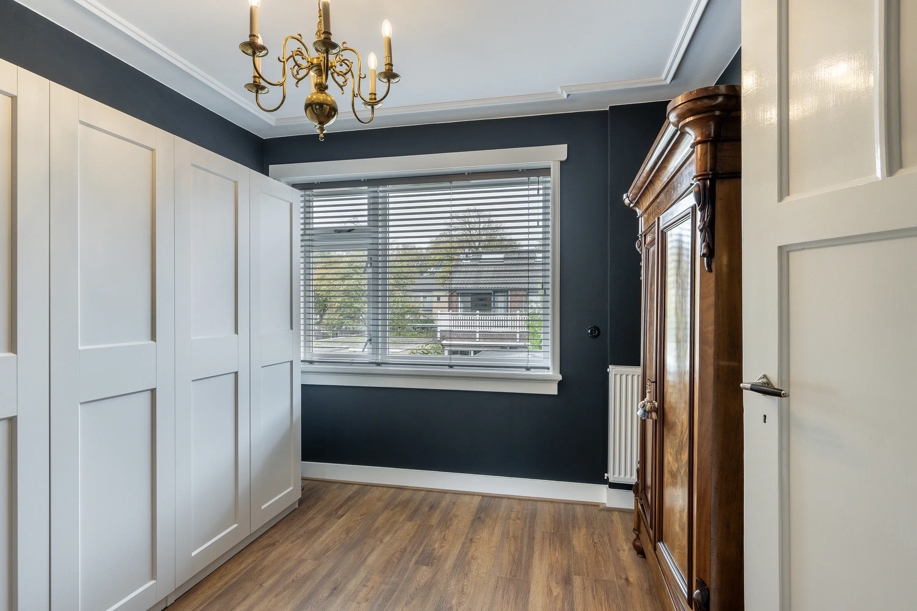 De grootste slaapkamer bevindt zich aan de voorzijde van de woning. Deze kamer is voorzien van een ingebouwde kast en een royale raampartij, wat zorgt voor veel natuurlijk licht en een ruimtelijk gevoel. Aan de buitenzijde zorgt een markies voor schaduw in de zomer.