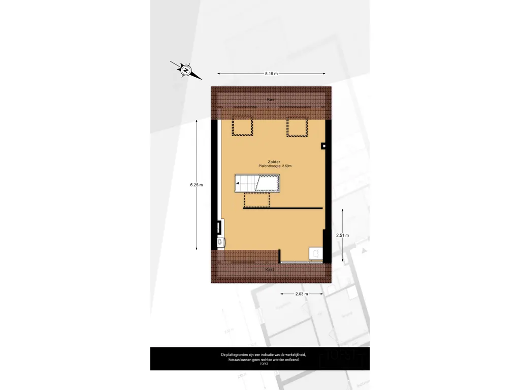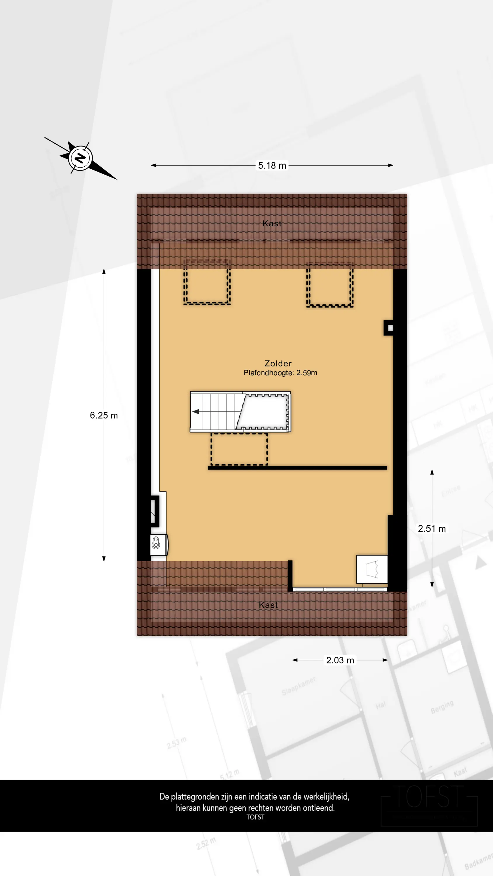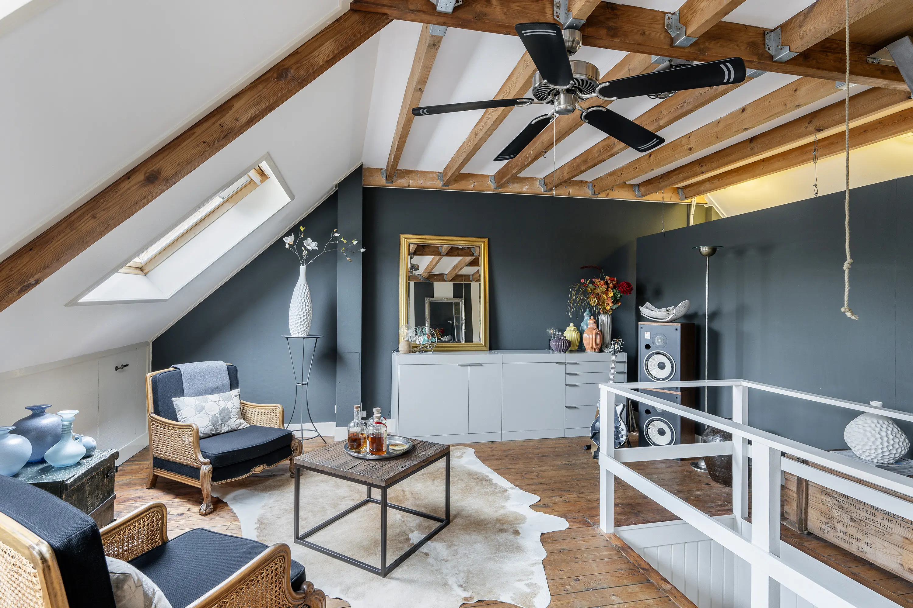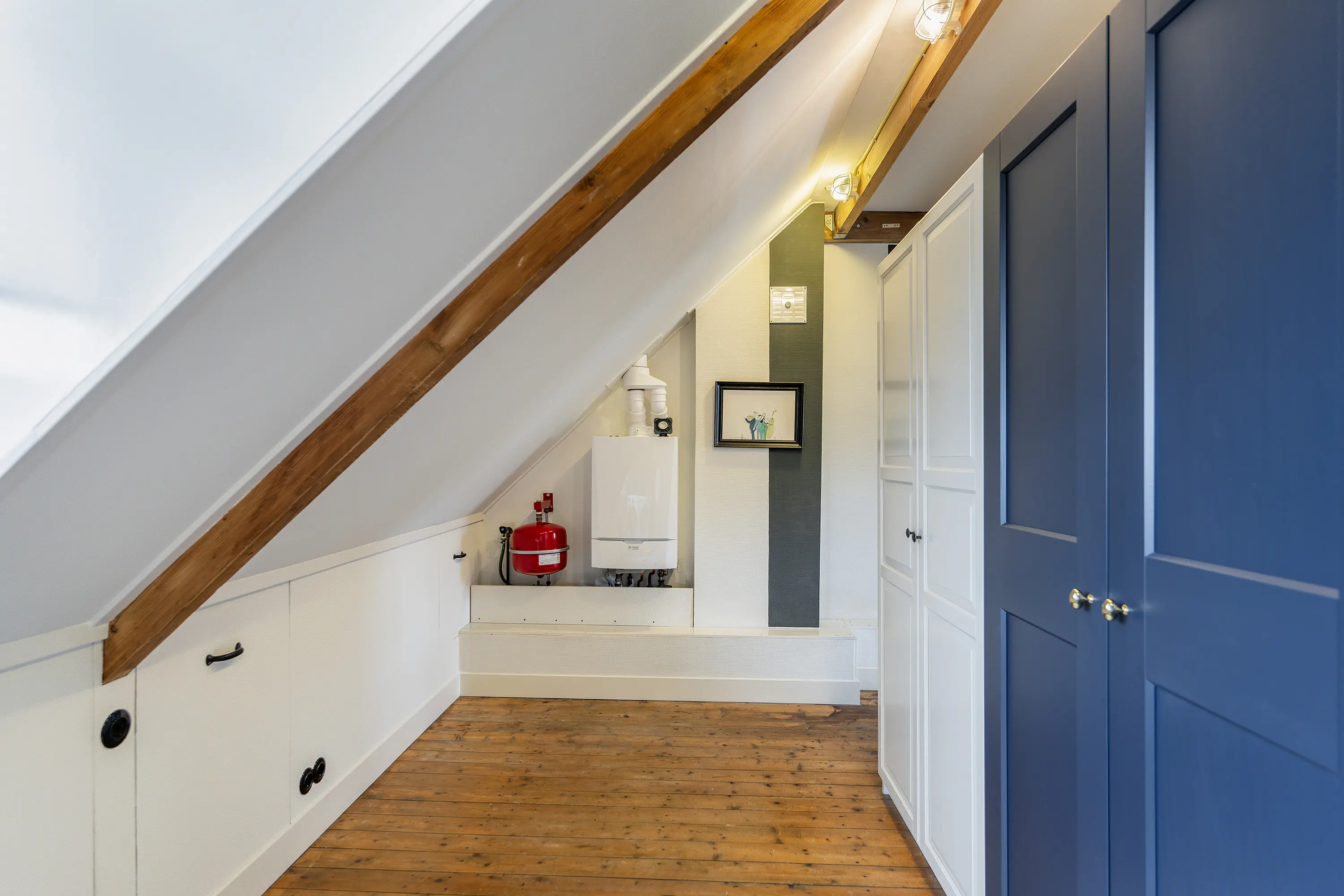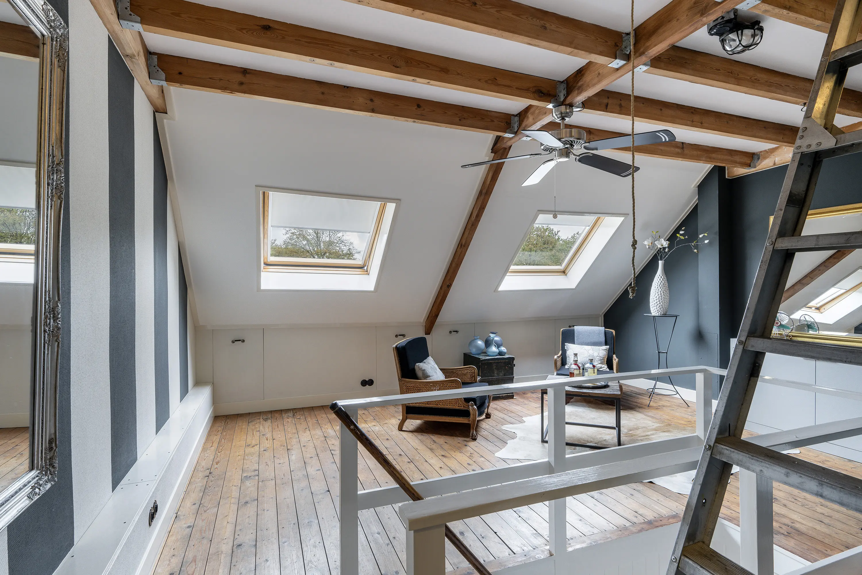 De zolder is opvallend licht dankzij twee grote dakramen aan de achterzijde en een dakkapel aan de voorzijde, wat zorgt voor een prettige en open sfeer.