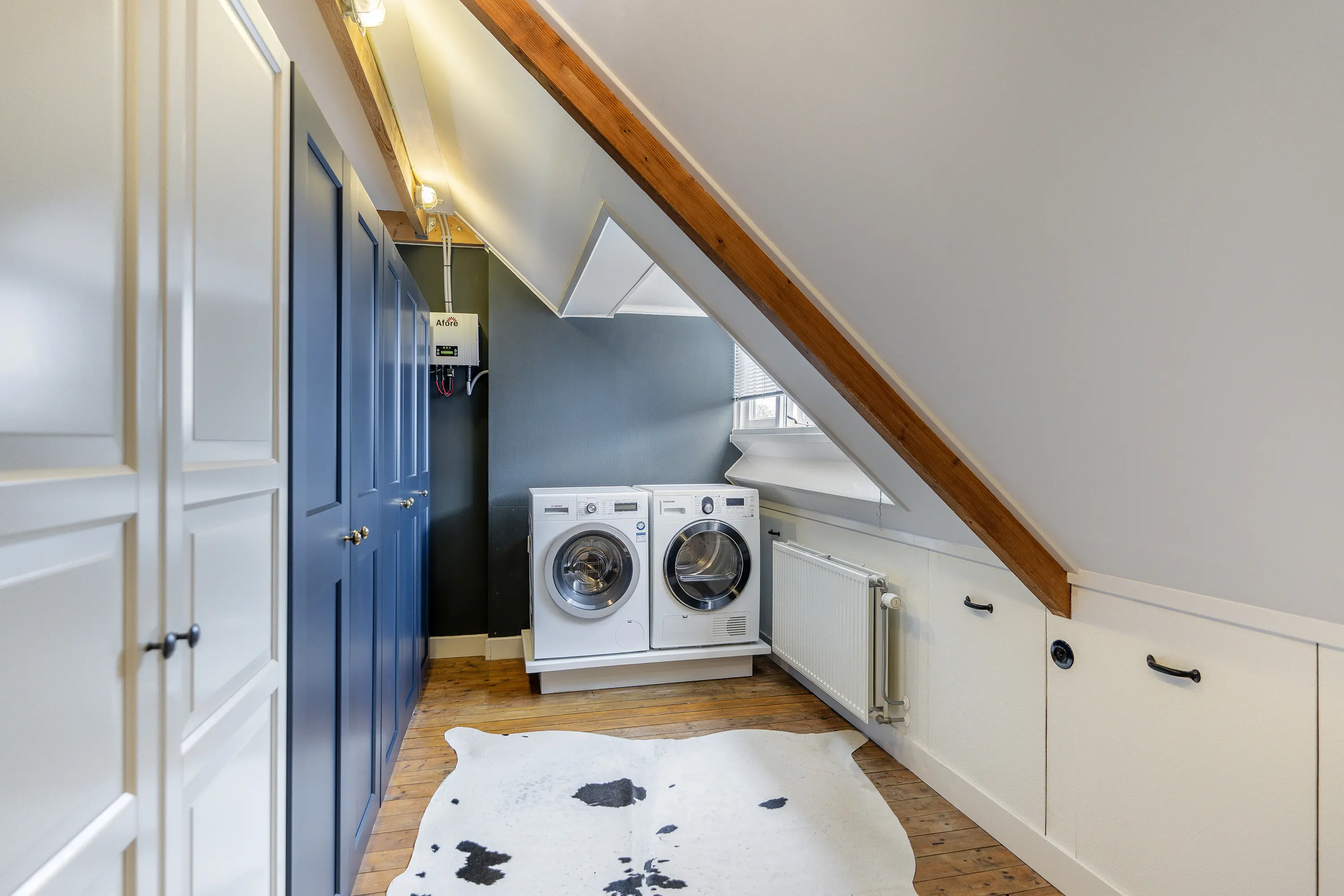 Er is een praktische scheidingsmuur geplaatst die een aparte wasruimte creëert, voorzien van zowel een wasmachine als een droger. Deze ruimte is efficiënt ingericht met ingebouwde kasten voor extra opbergruimte.