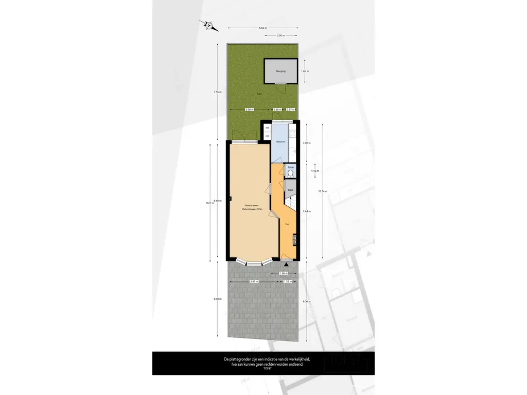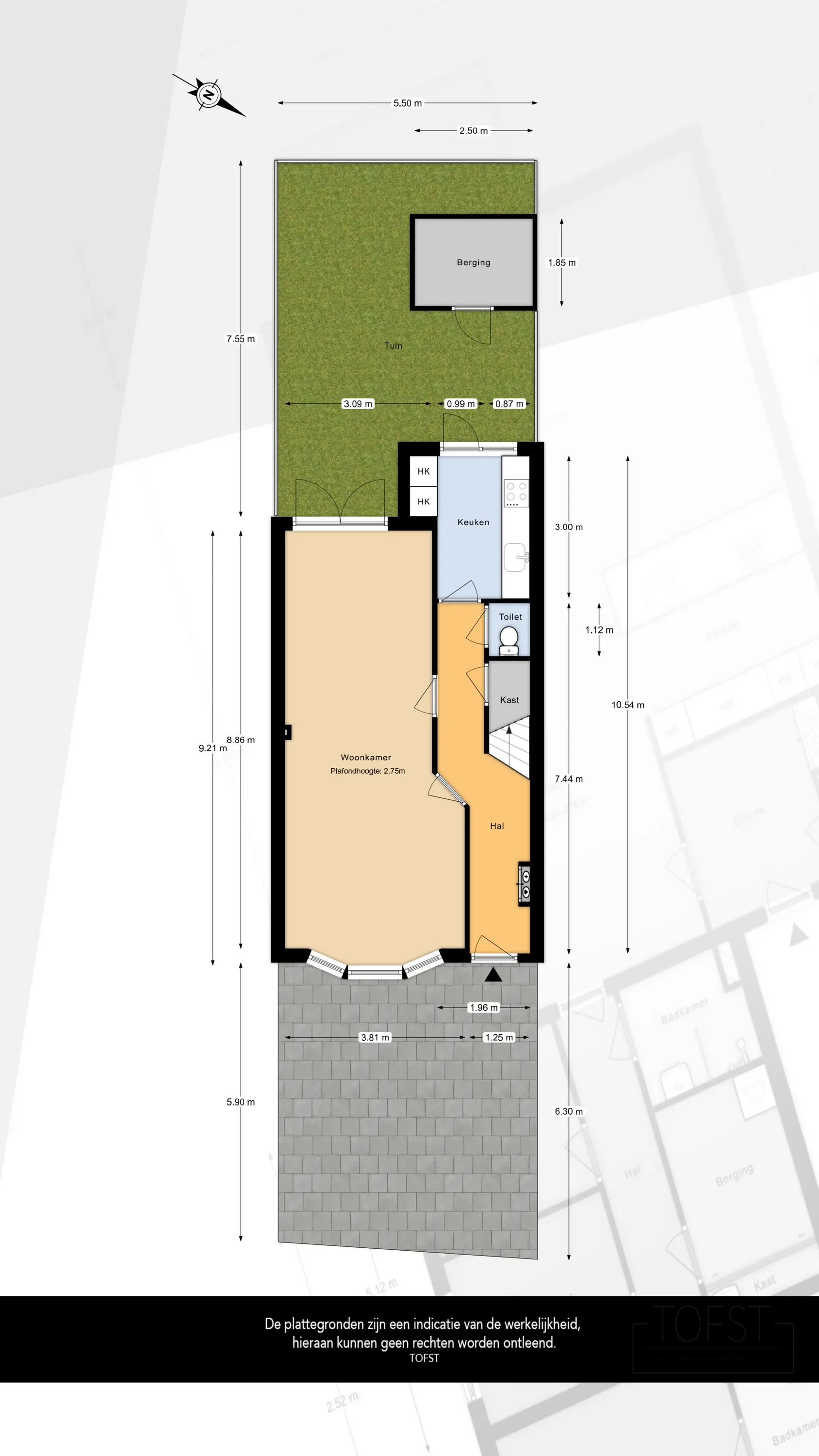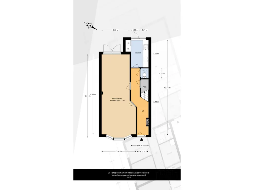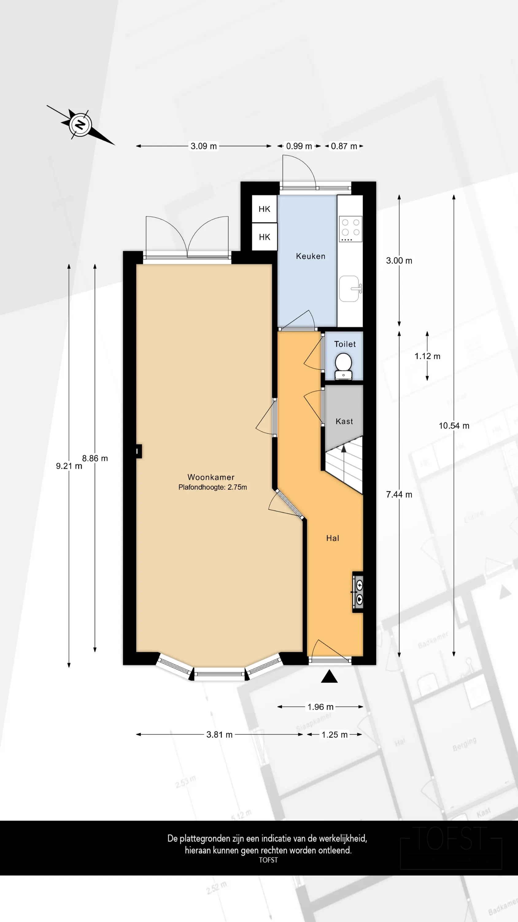 Wanneer u de woning betreedt via de voortuin, komt u binnen in een langwerpige hal. Vanuit deze hal heeft u toegang tot het toilet, de keuken, de trap naar de eerste verdieping en maar liefst twee deuren die leiden naar de ruime woonkamer.