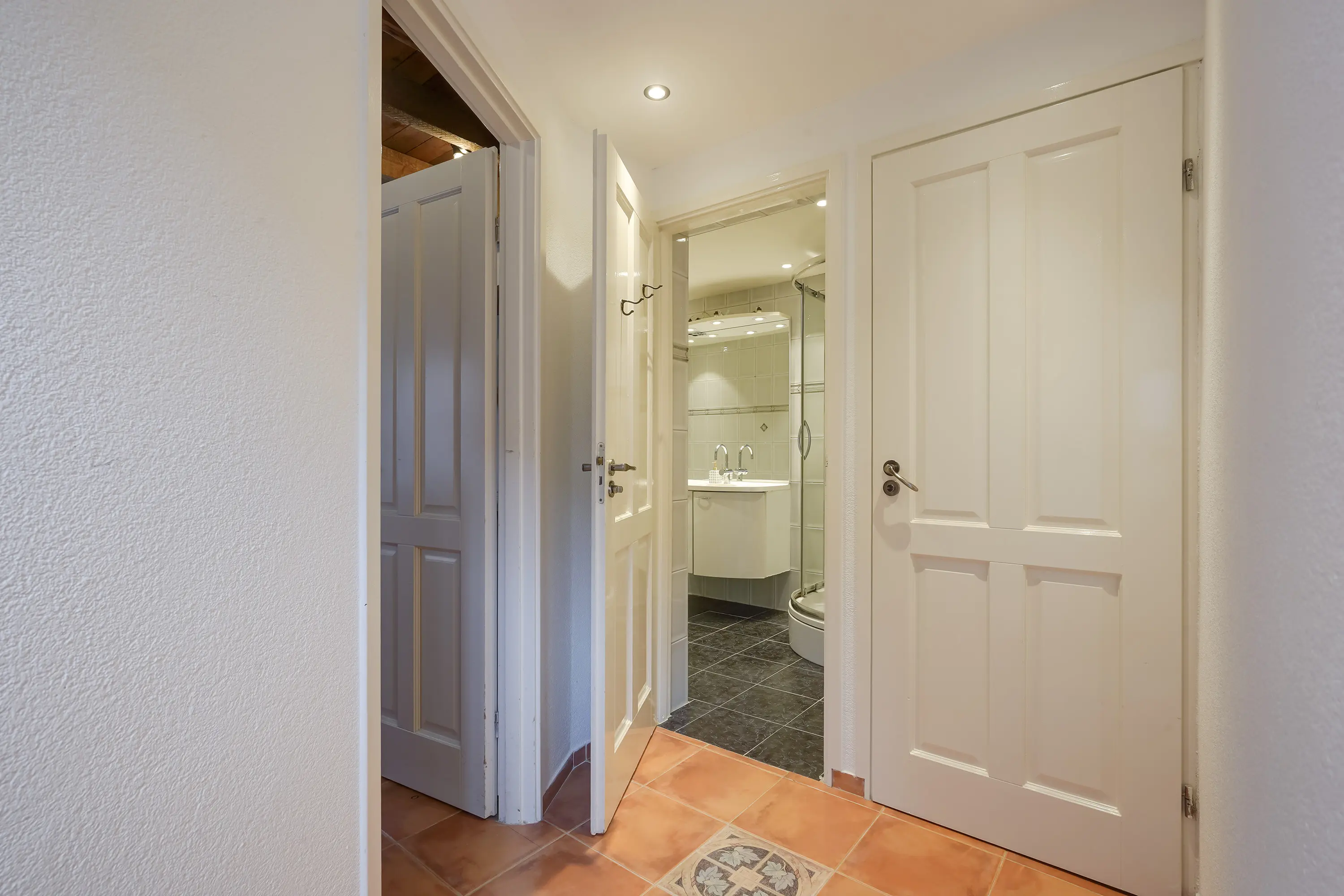 Aan de achterzijde van de hal bevinden zich nog twee deuren. De rechterdeur geeft toegang tot het toilet met fontein. De linkerdeur leidt naar de comfortabele badkamer, voorzien van een wastafelmeubel, een afgesloten douchecabine en een royaal ligbad met jacuzzi-functie. Zowel het toilet als de badkamer zijn voorzien van vloerverwarming.