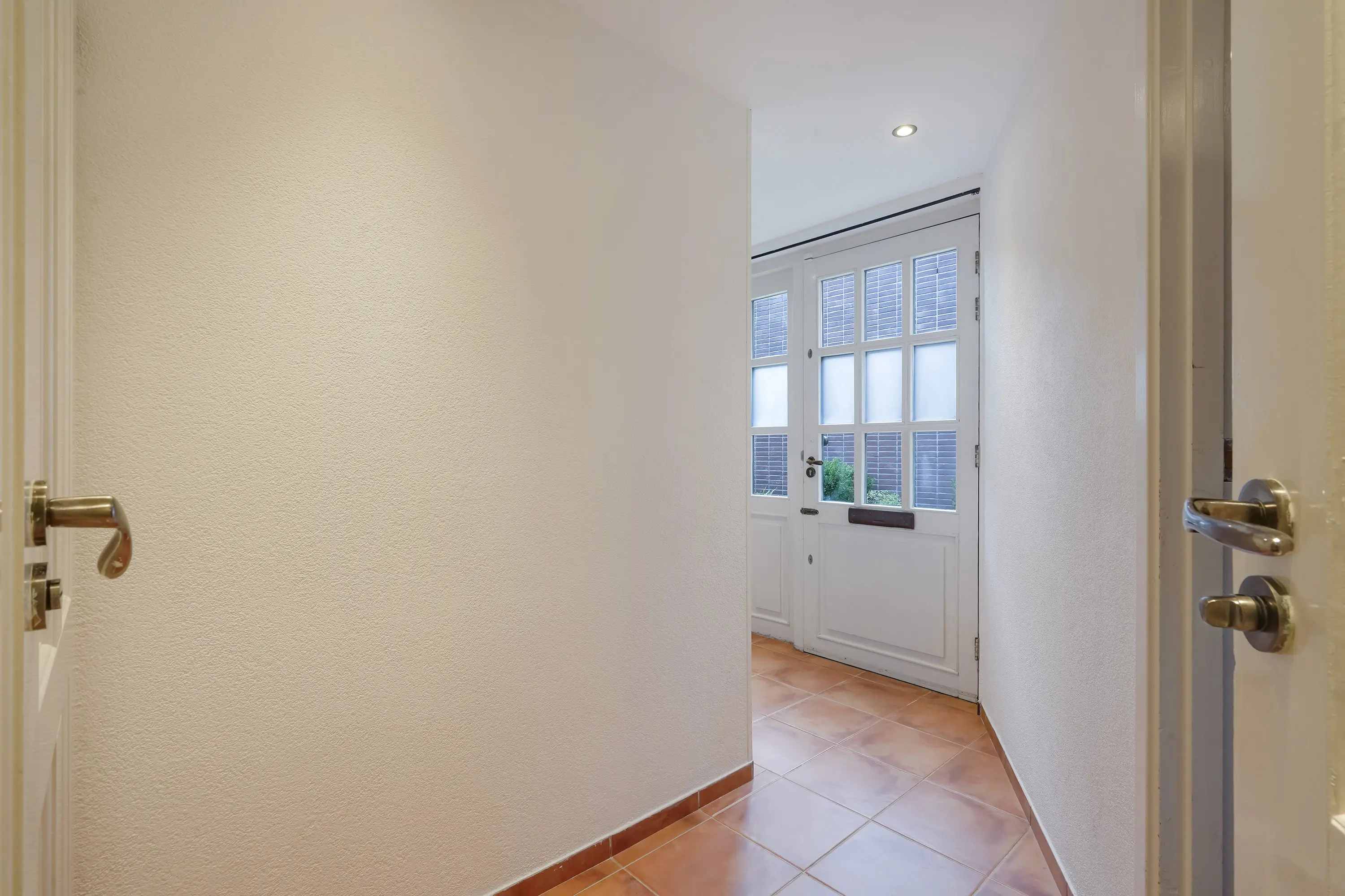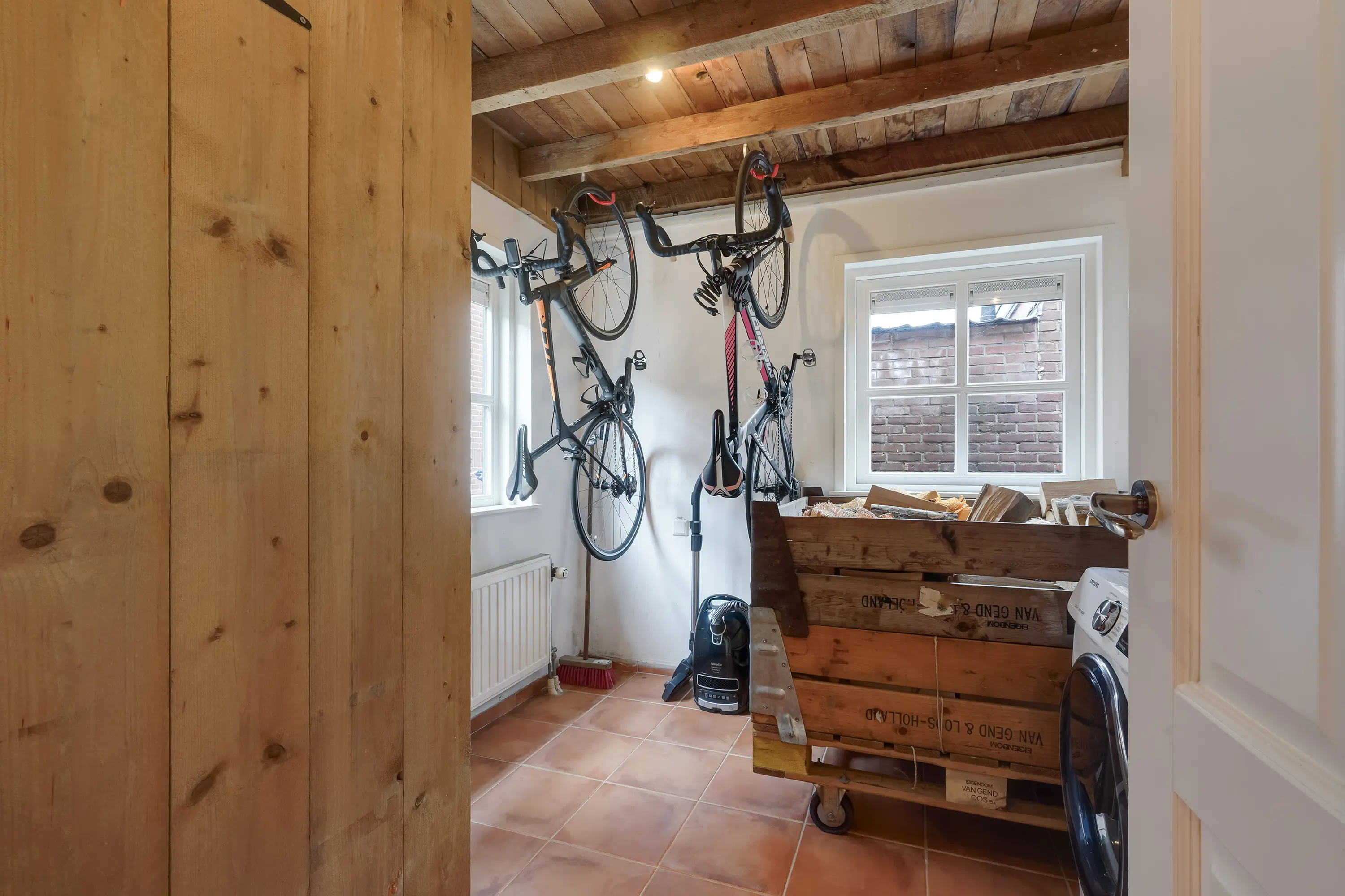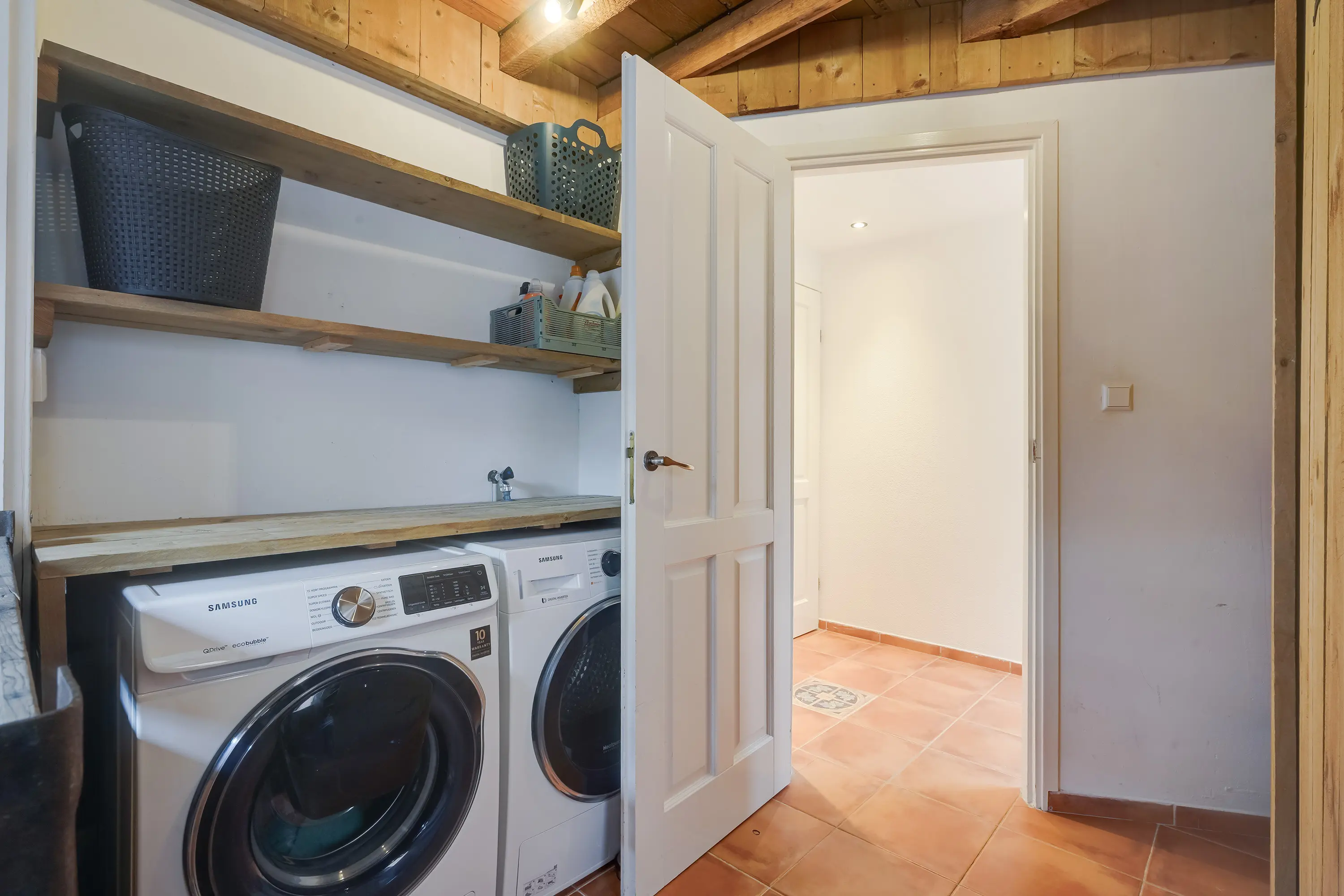 Wanneer u vanuit de hal naar links gaat, komt u bij de praktische wasruimte. Hier vindt u aansluitingen voor een wasmachine en droger, evenals twee ruime kasten die ideaal zijn voor opslag. Dankzij twee grote ramen aan weerszijden van de ruimte valt er veel daglicht binnen, en is natuurlijke ventilatie tijdens het wassen mogelijk.