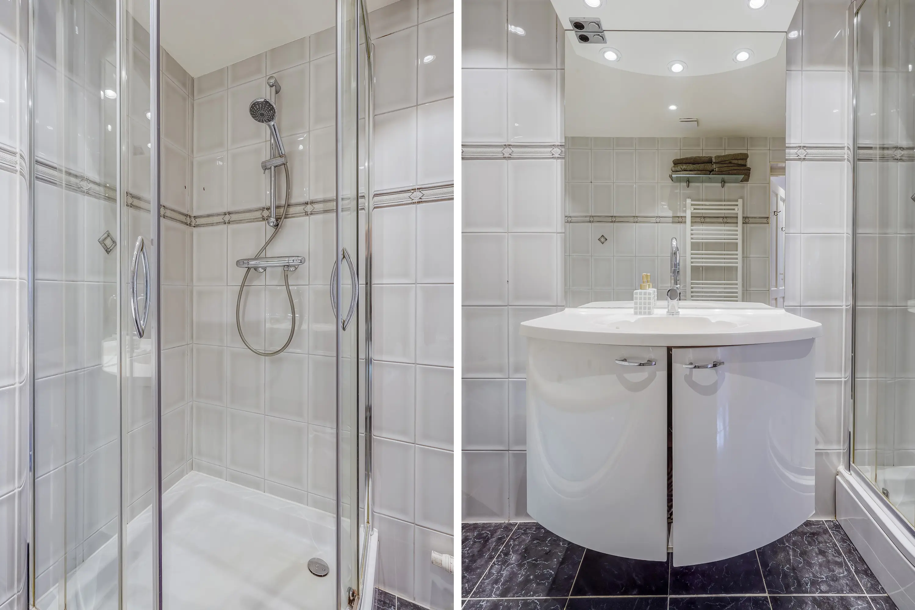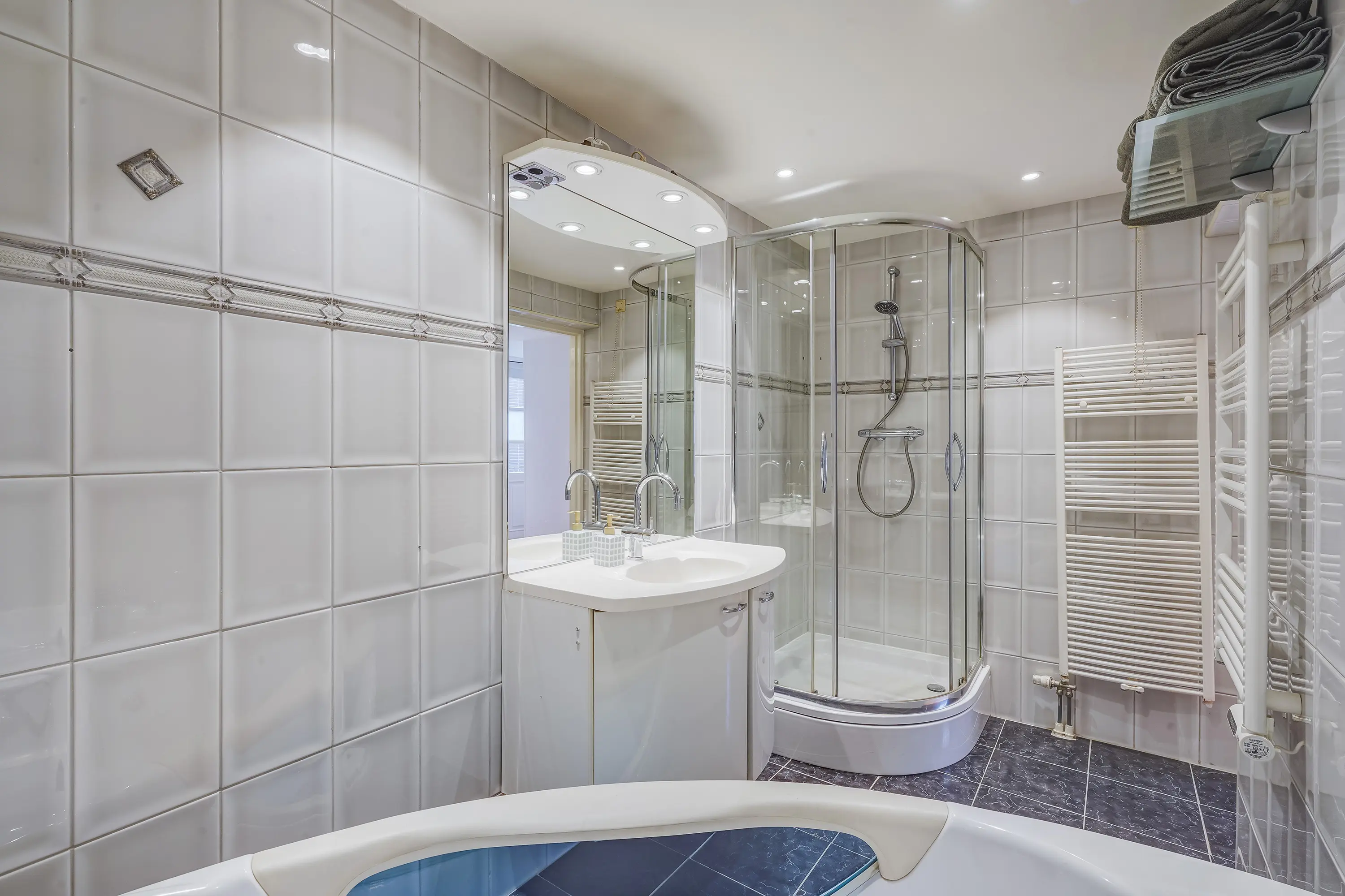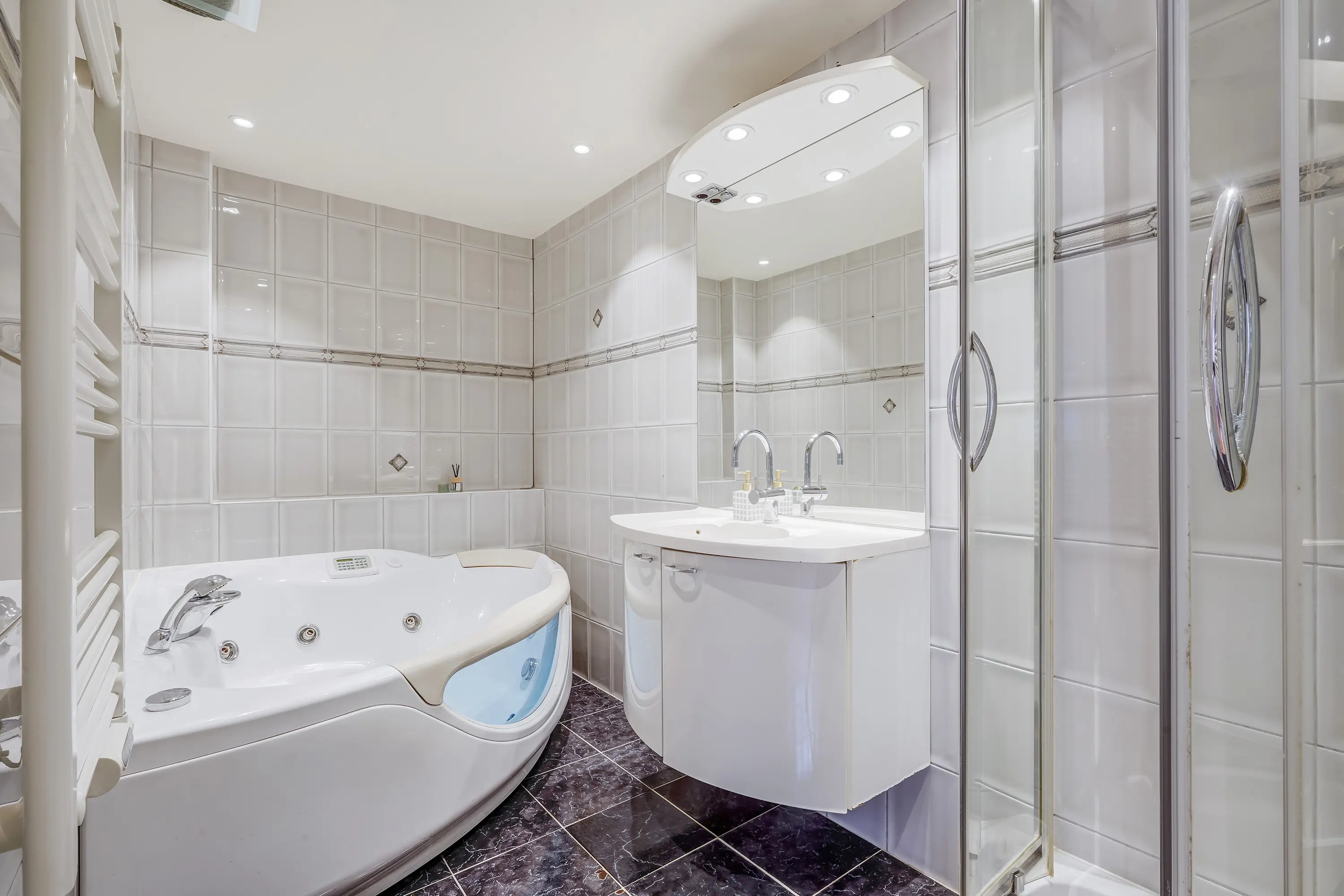 - Royale badkamer voorzien van vloerverwarming, met douche en jacuzzi-ligbad;