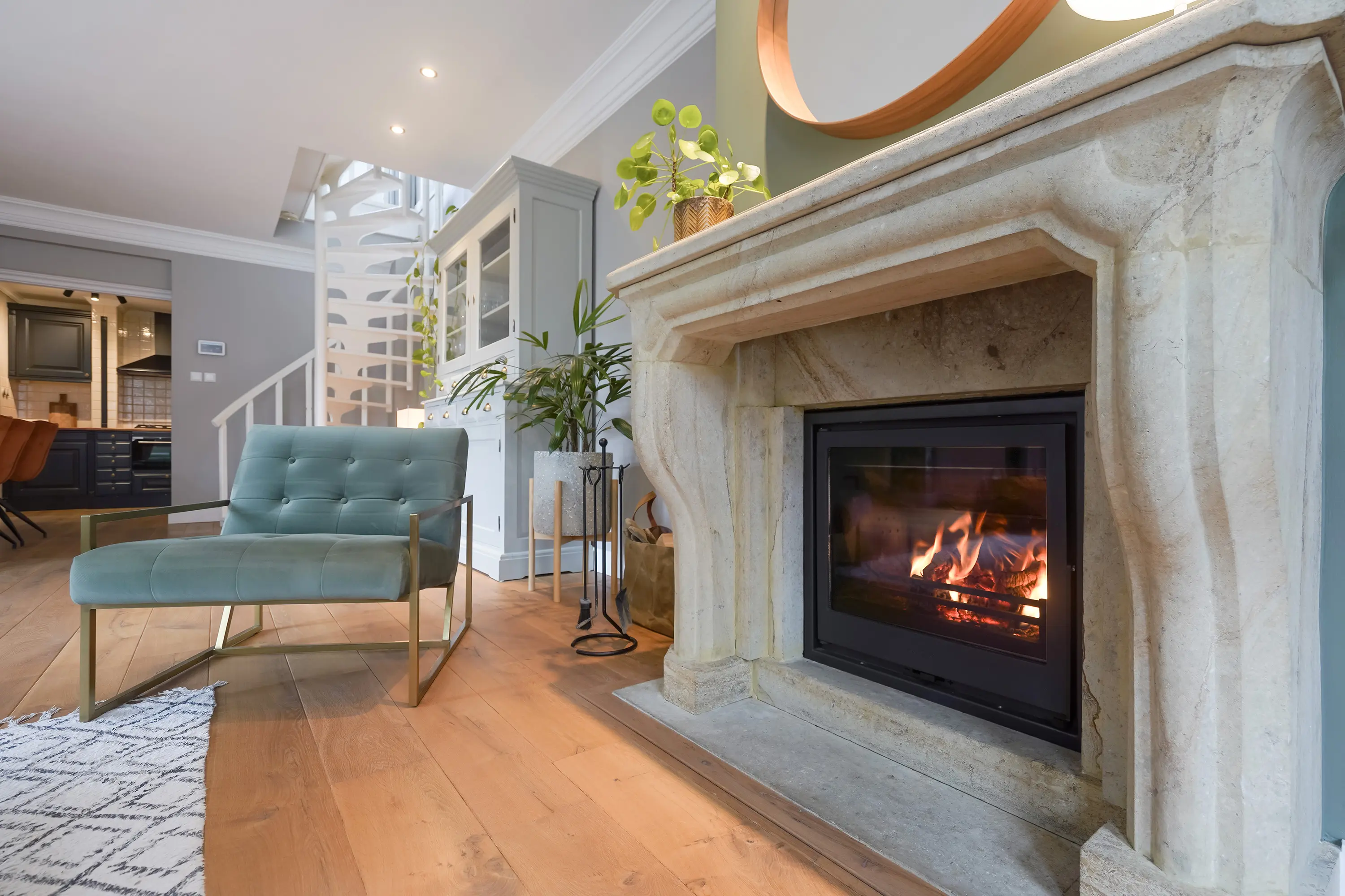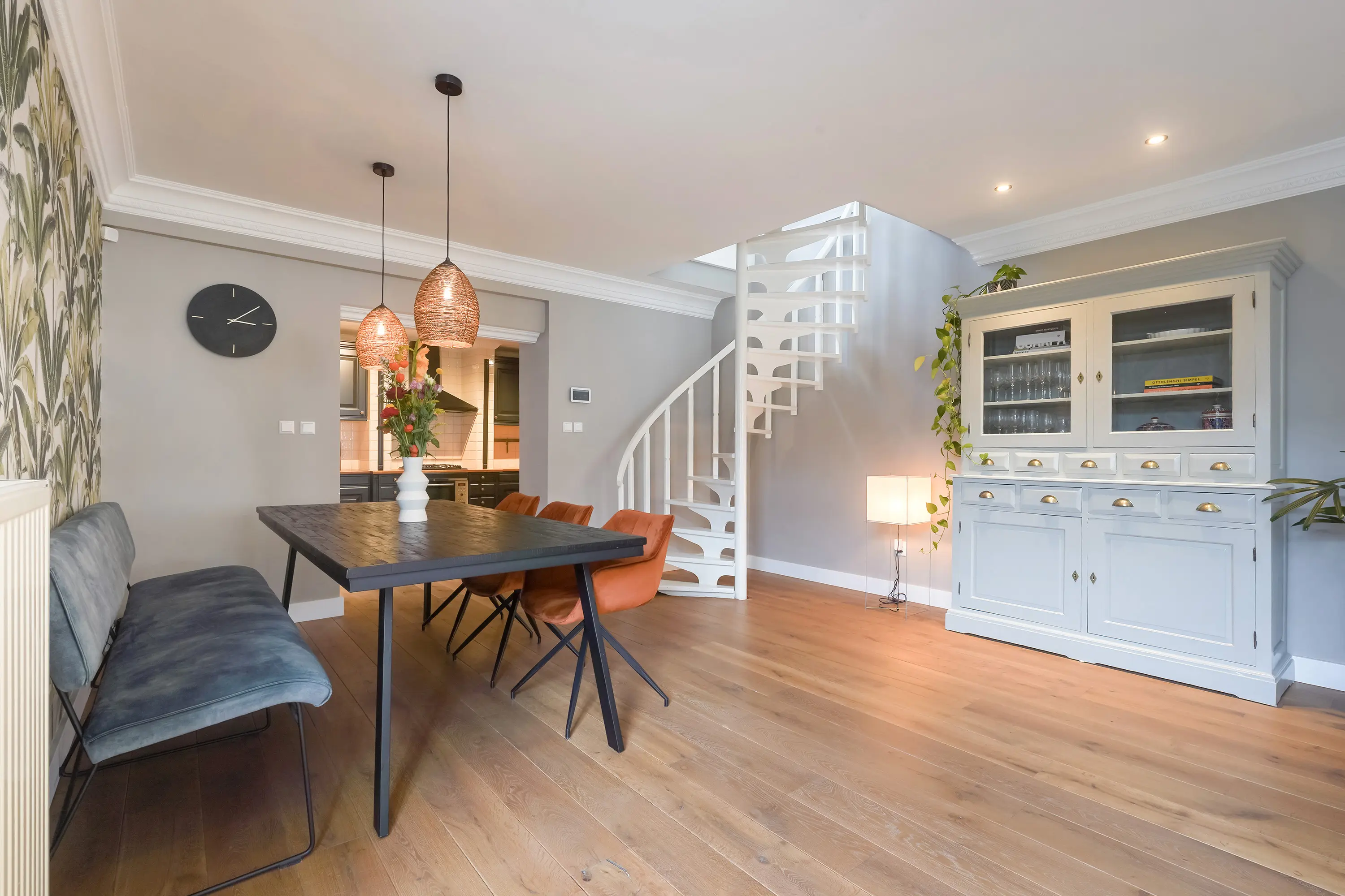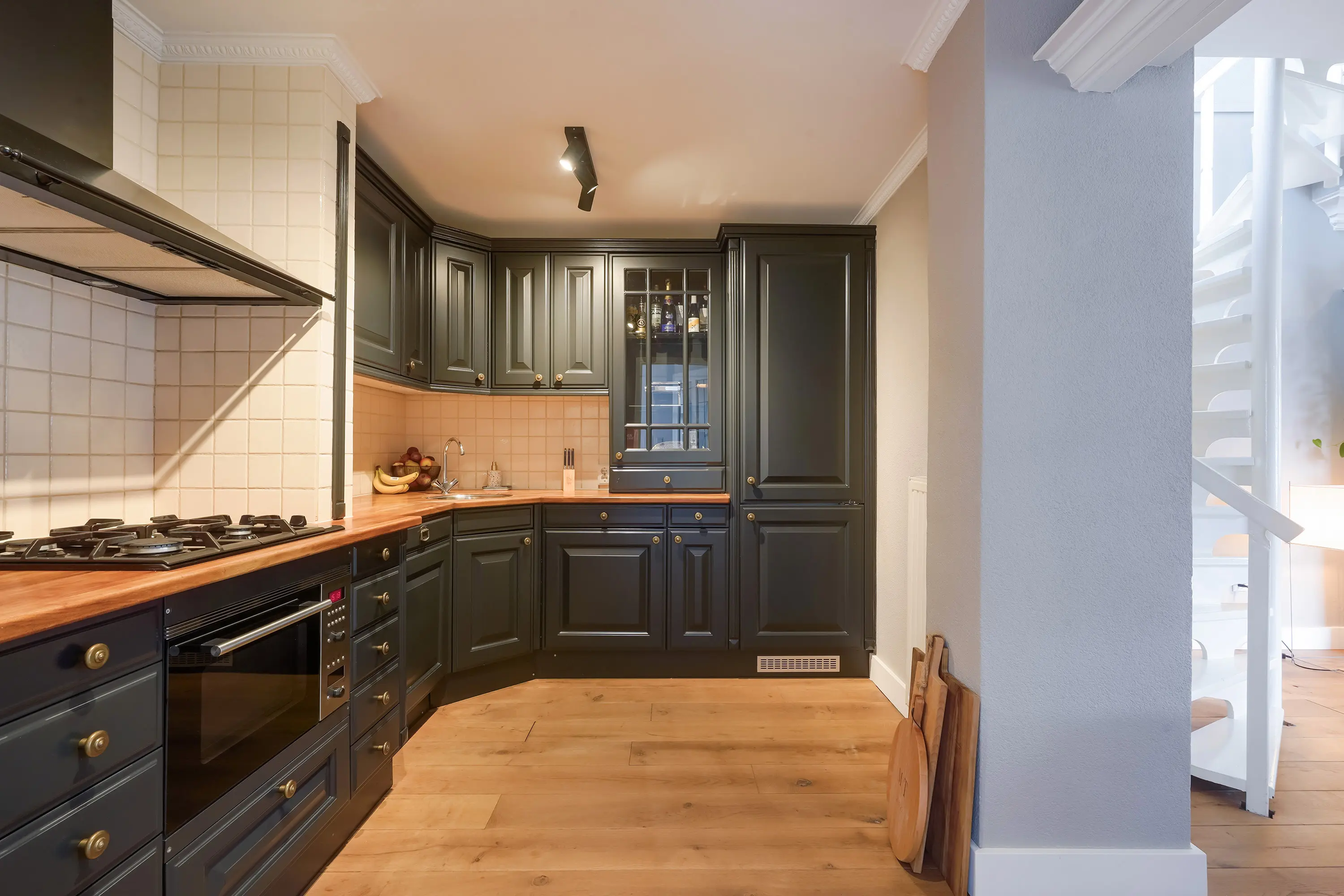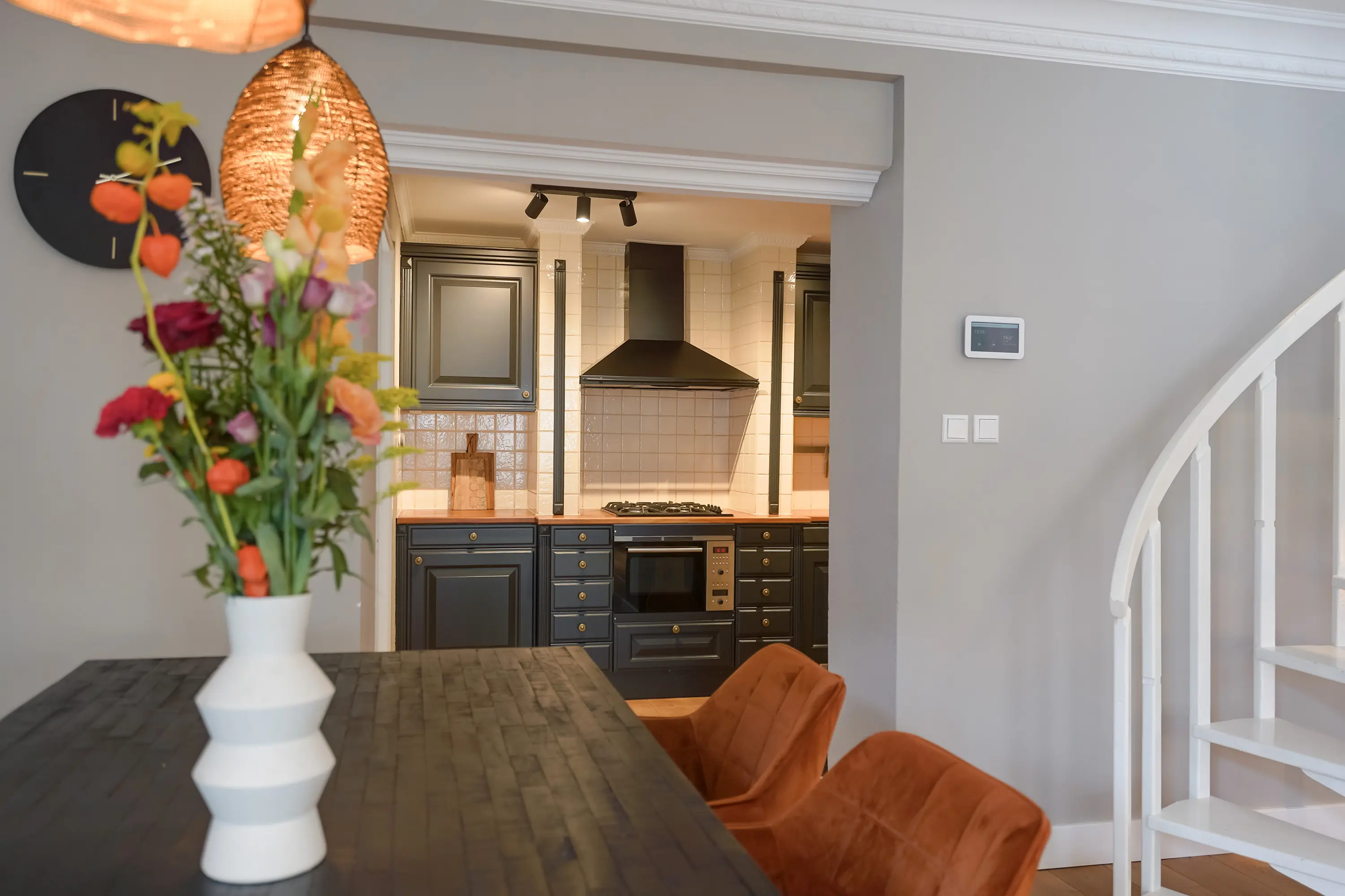 Aan de rechterzijde van de hal bevindt zich de deur naar de keuken. De open keuken is ingericht in een charmante mix van klassieke en moderne stijlelementen en beschikt over diverse inbouwapparatuur. Hoewel het een open keuken betreft, wordt deze subtiel afgescheiden van de woon- en eetkamer door een kleine scheidingswand. Deze wand loopt niet volledig door, maar zorgt voor een optische onderbreking tussen de ruimtes. Achter deze muur bevindt zich de ronde open trap naar de eerste verdieping, die hierdoor vanuit de keuken grotendeels aan het zicht wordt onttrokken.