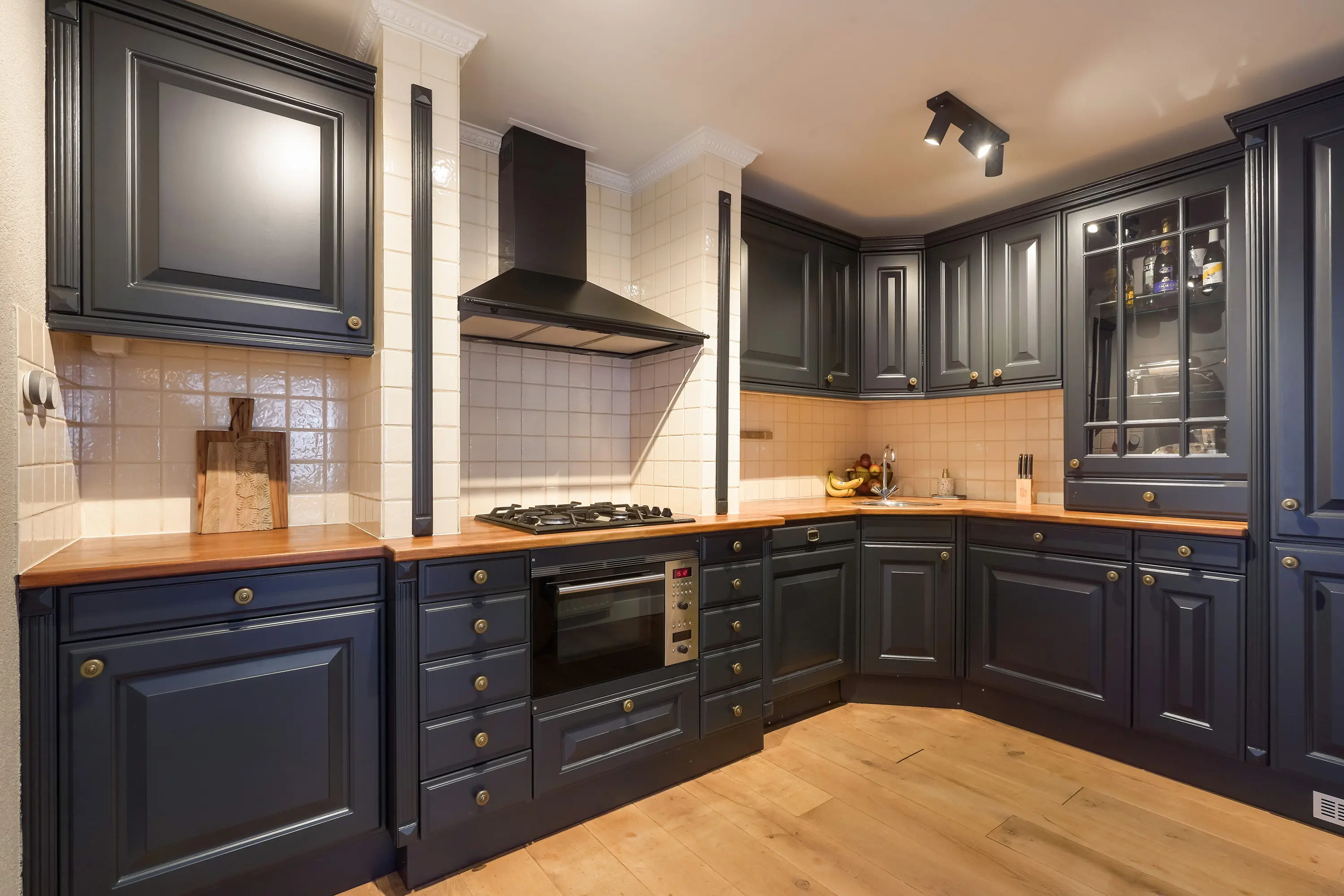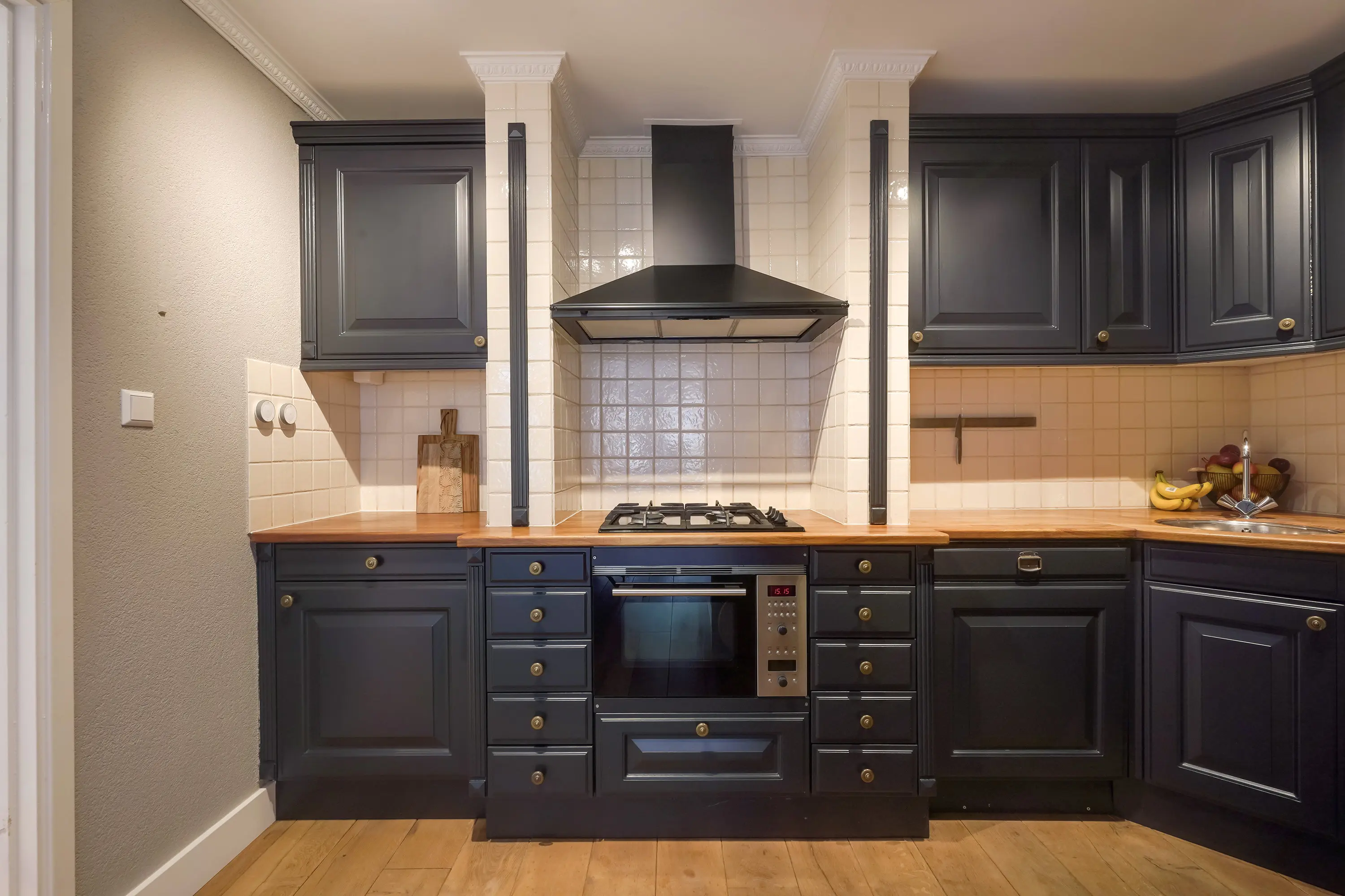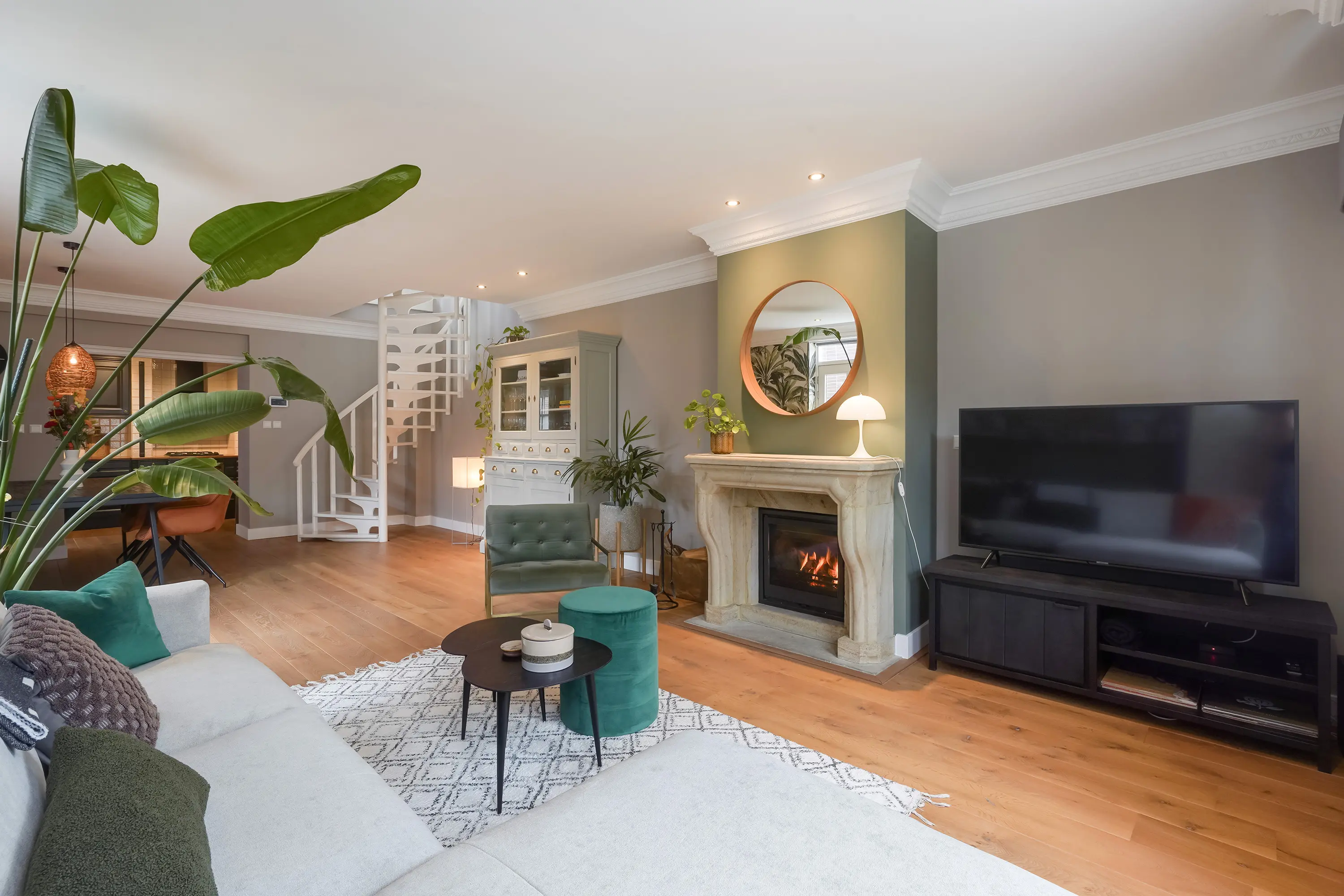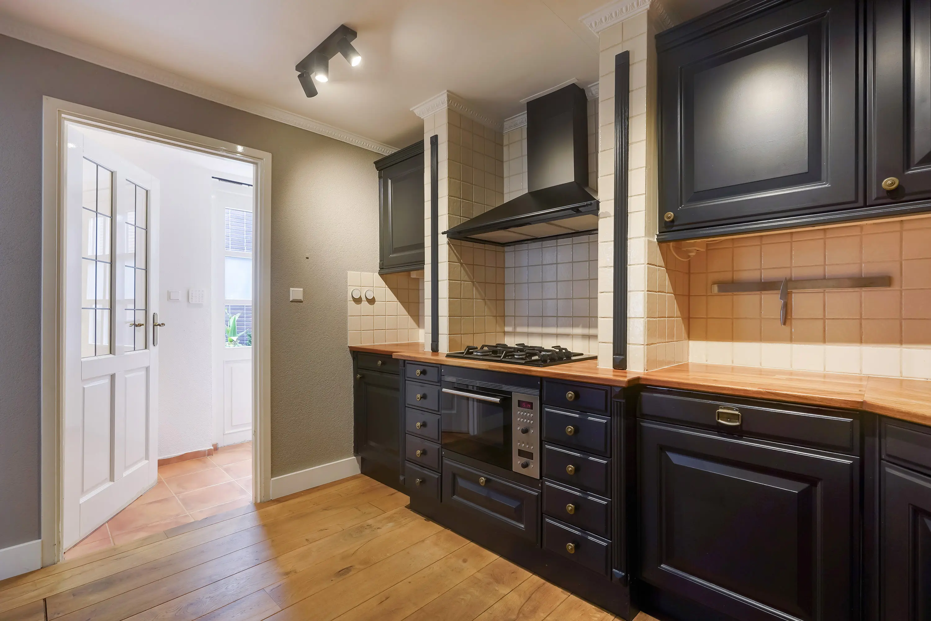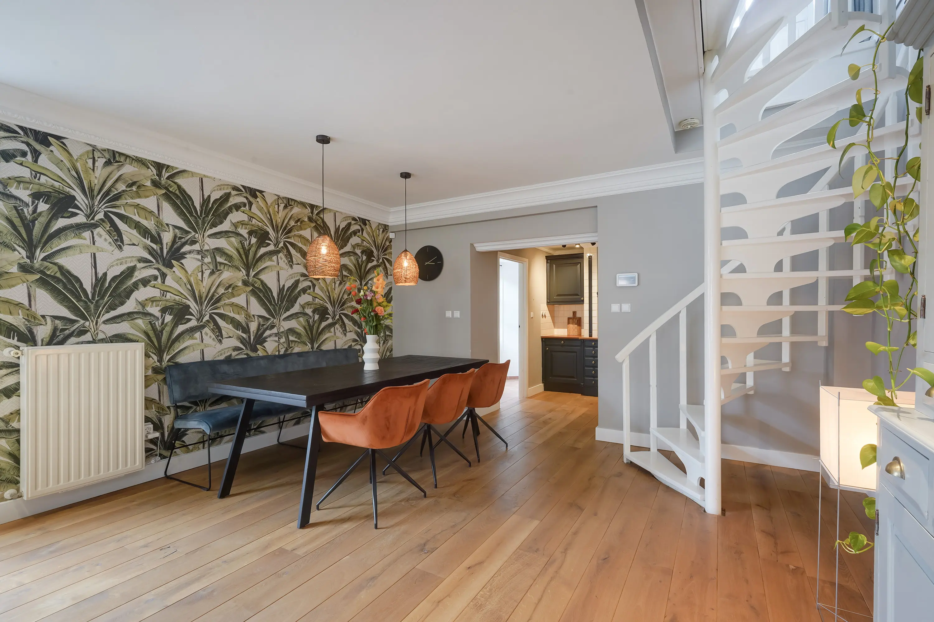 Aan de rechterzijde van de hal bevindt zich de deur naar de keuken. De open keuken is ingericht in een charmante mix van klassieke en moderne stijlelementen en beschikt over diverse inbouwapparatuur. Hoewel het een open keuken betreft, wordt deze subtiel afgescheiden van de woon- en eetkamer door een kleine scheidingswand. Deze wand loopt niet volledig door, maar zorgt voor een optische onderbreking tussen de ruimtes. Achter deze muur bevindt zich de ronde open trap naar de eerste verdieping, die hierdoor vanuit de keuken grotendeels aan het zicht wordt onttrokken.
