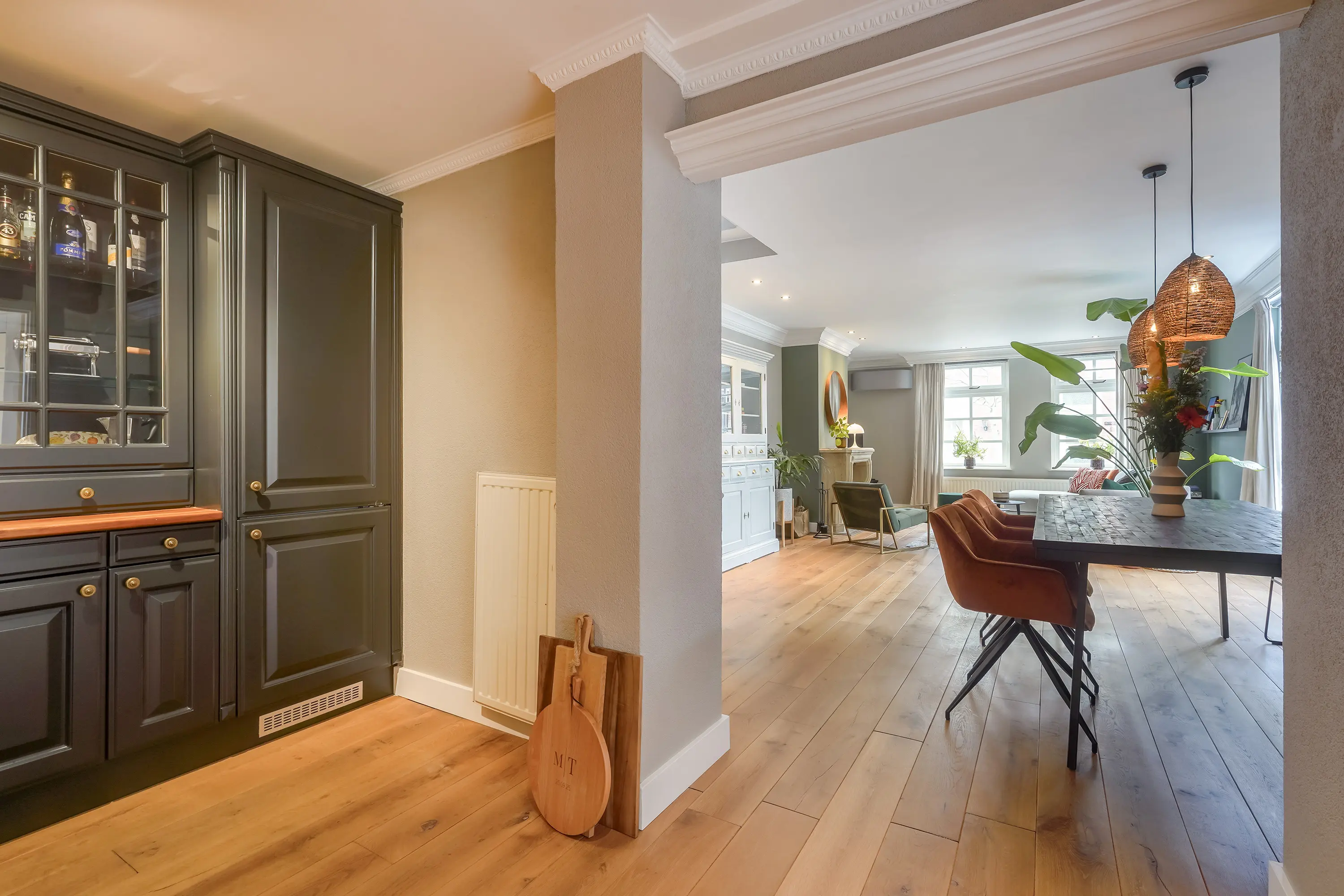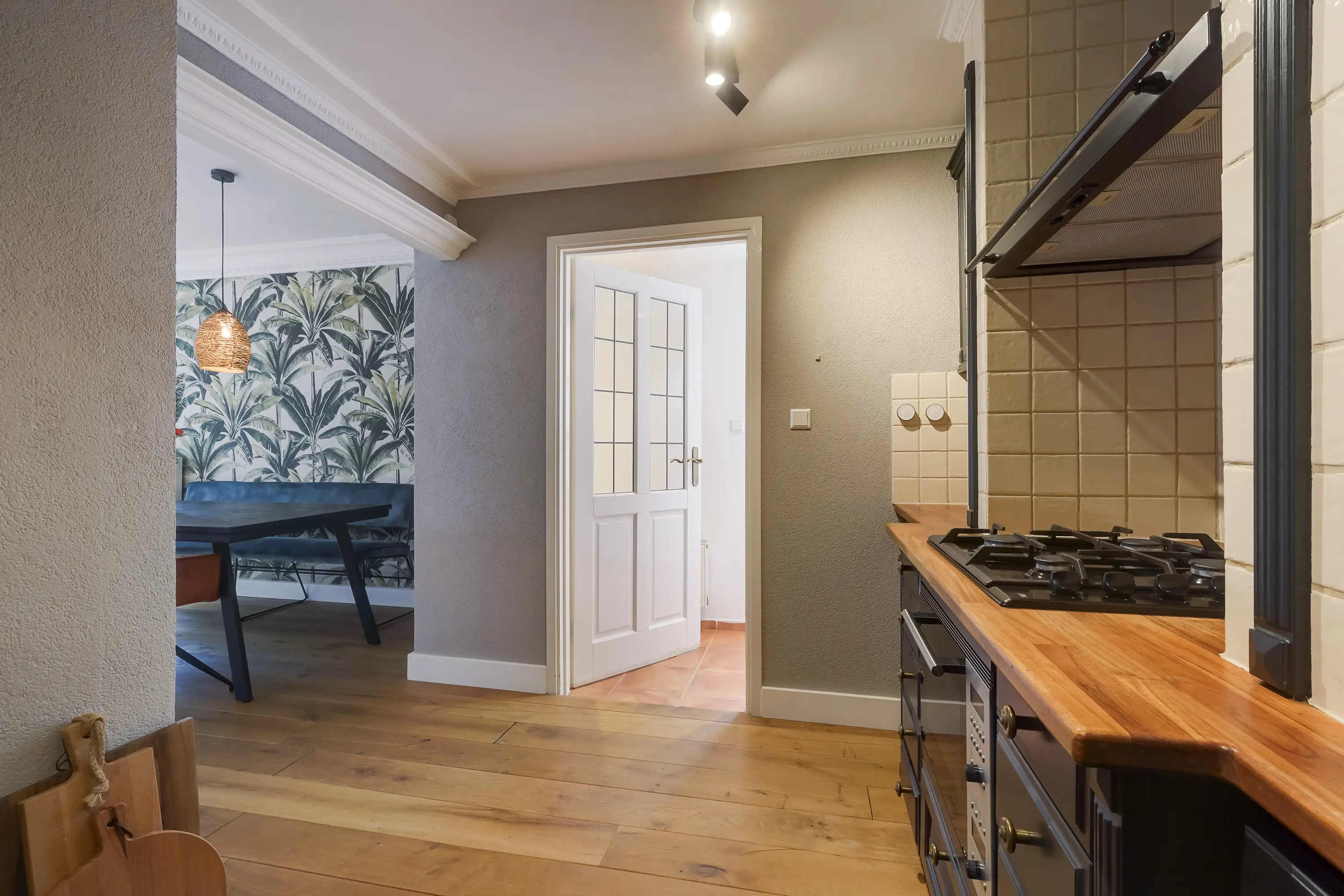- Open keuken met inbouwapparatuur en sfeervolle afscheiding;