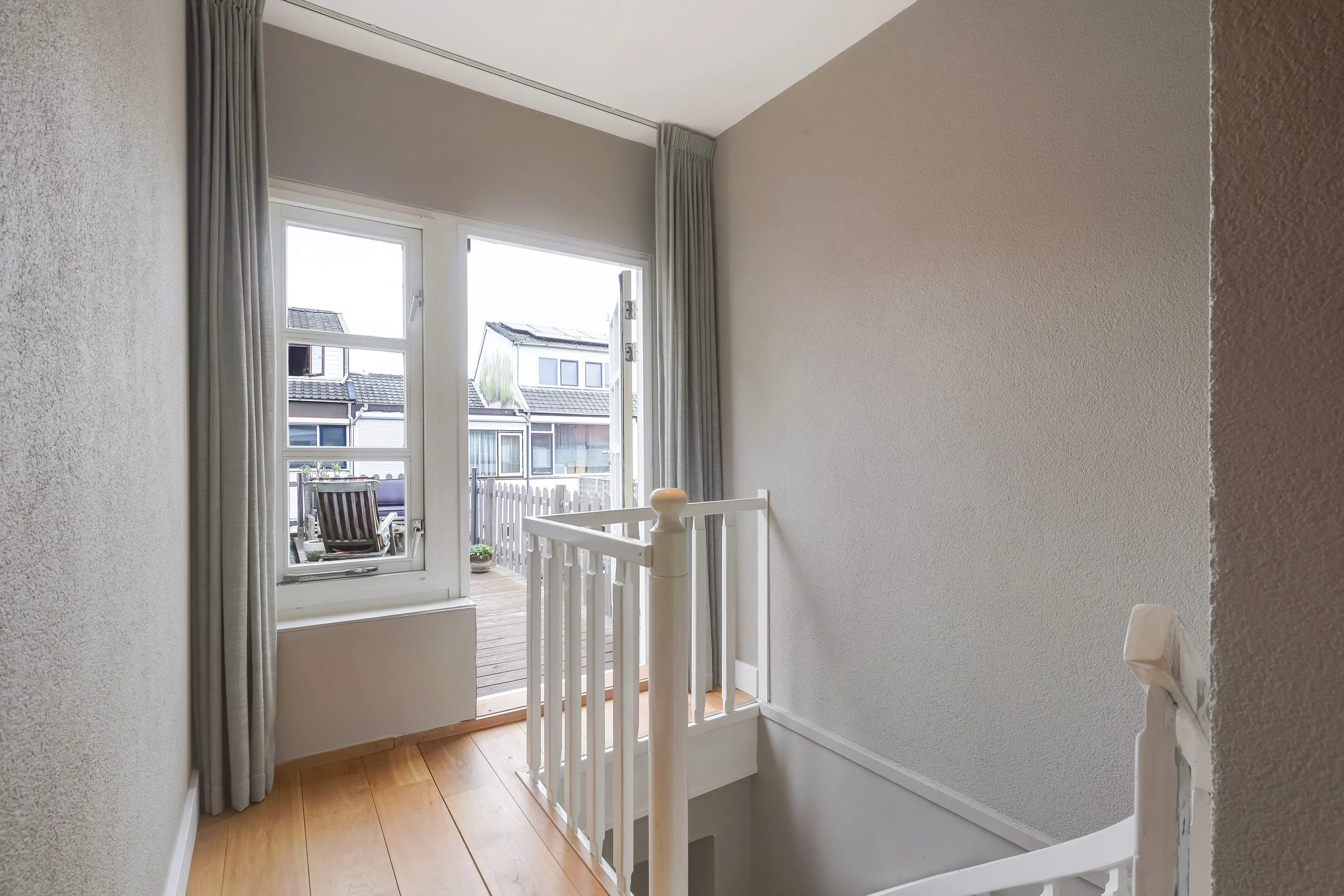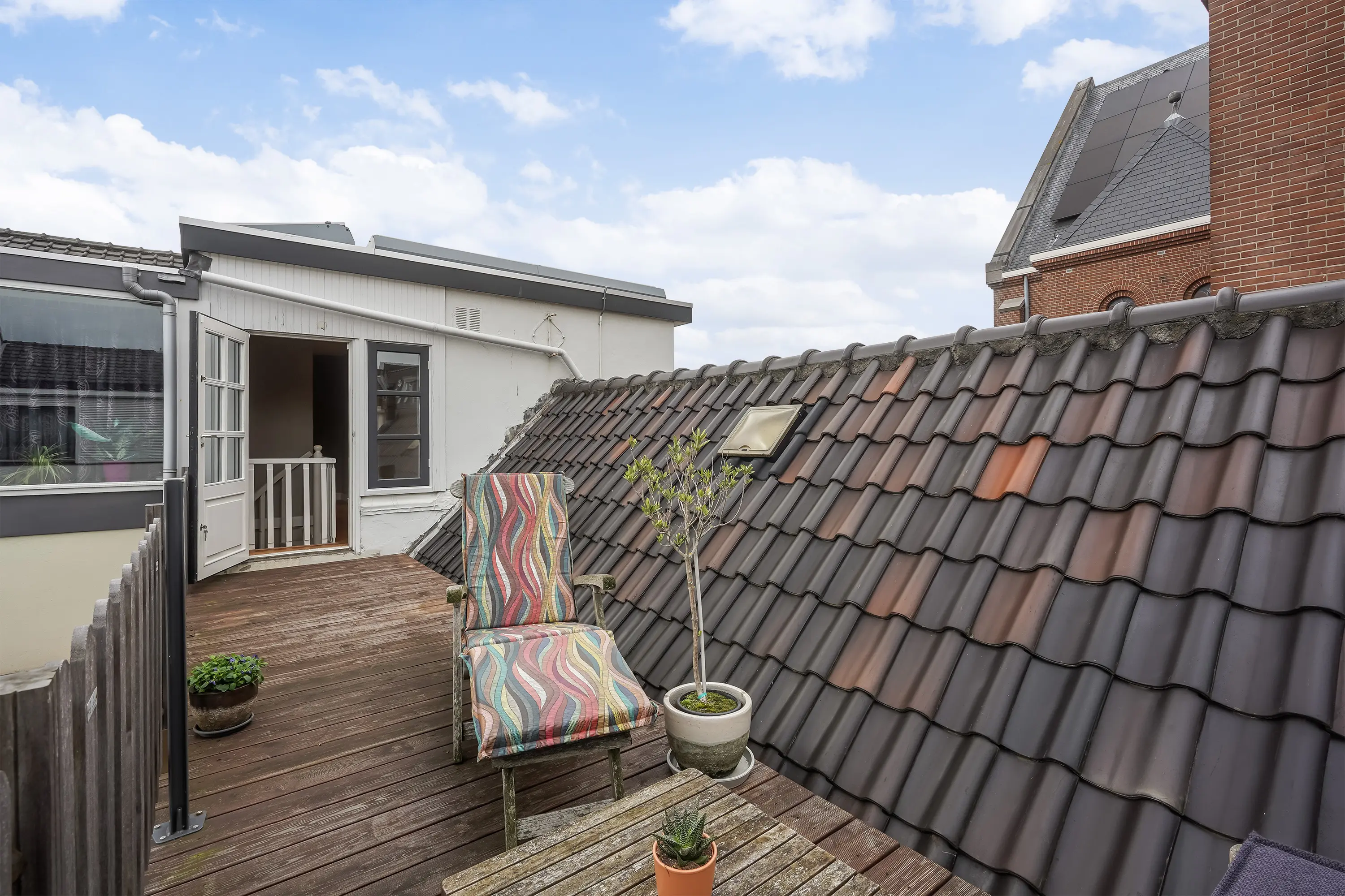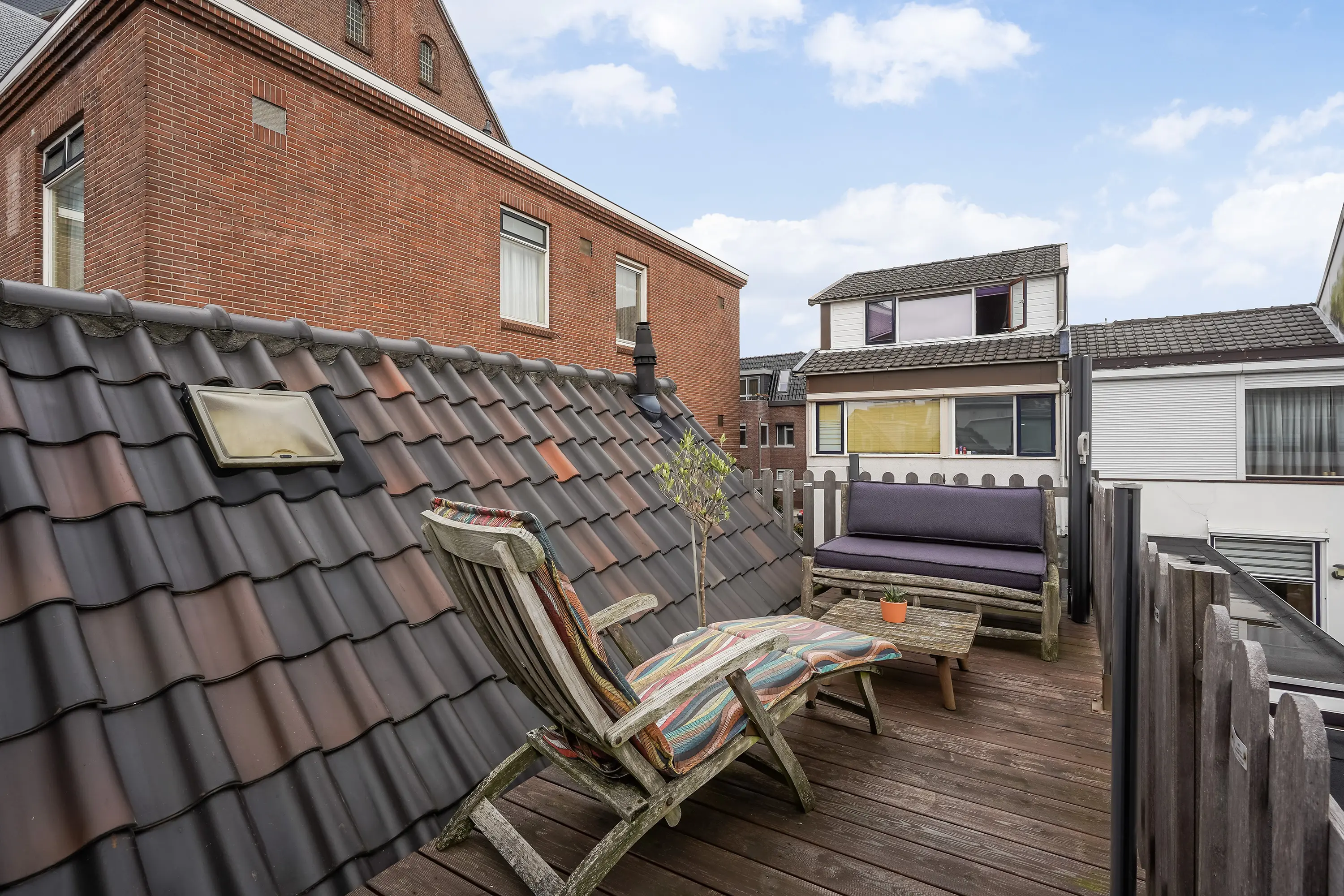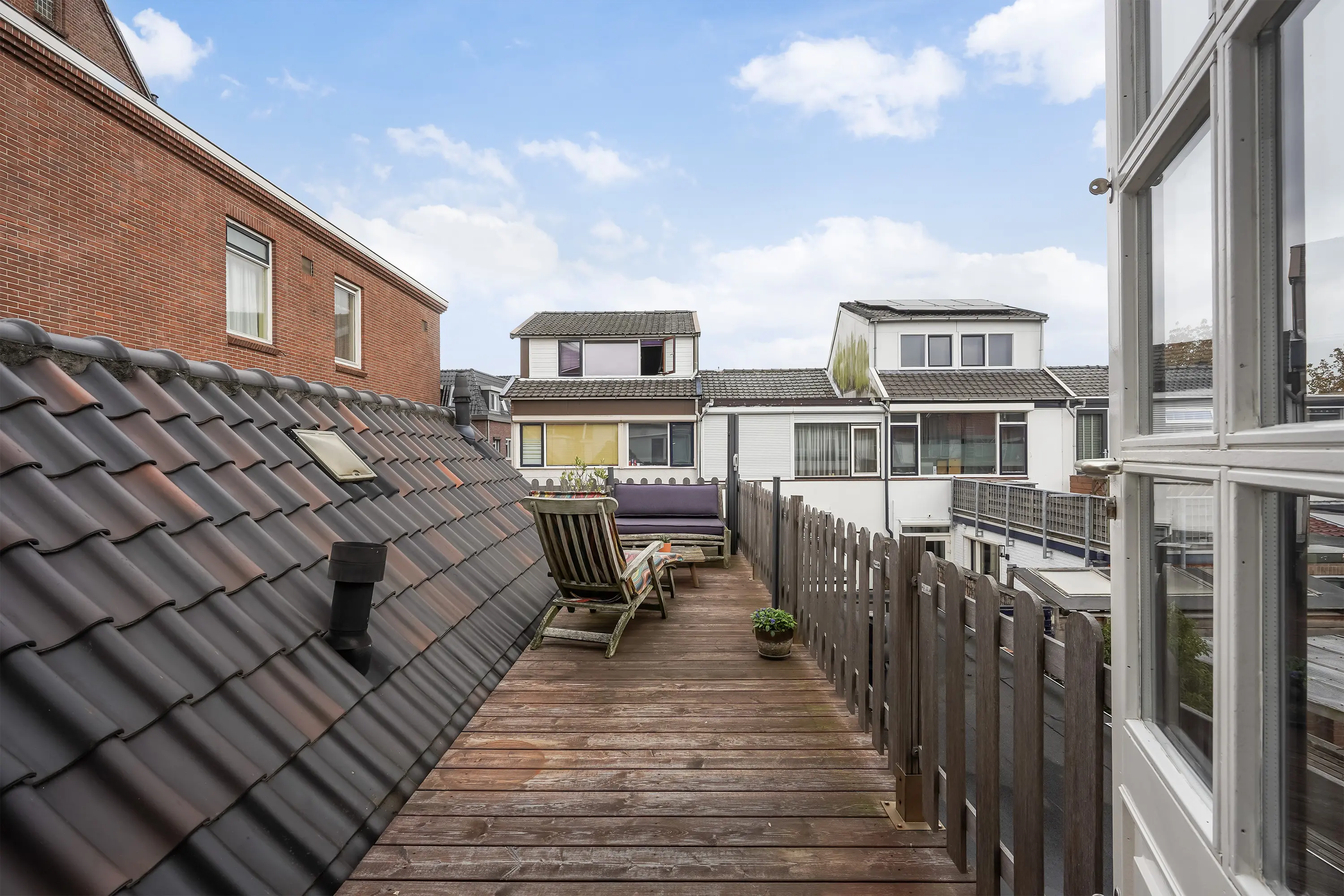 Gaat u vanaf de trap naar rechts, dan komt u direct bij de deur naar het ruime dakterras. Dit langgerekte terras biedt volop mogelijkheden: een fijne plek om samen te komen met vrienden of familie voor een gezellige borrel, of juist een rustige plek om even helemaal tot uzelf te komen.