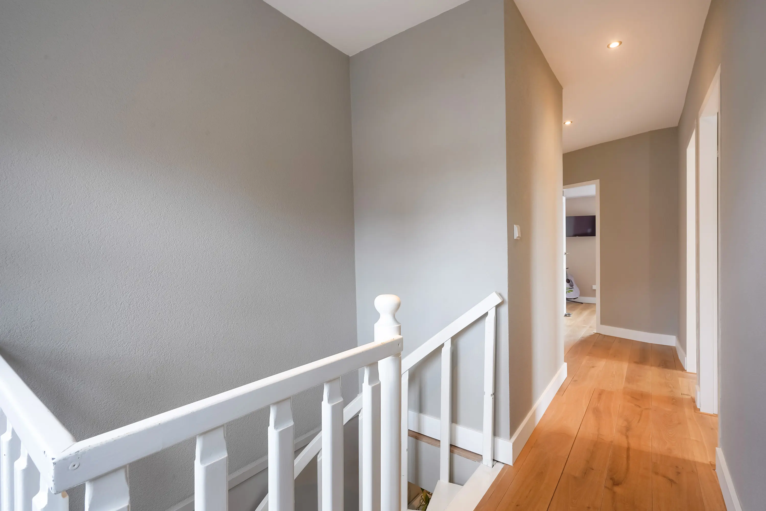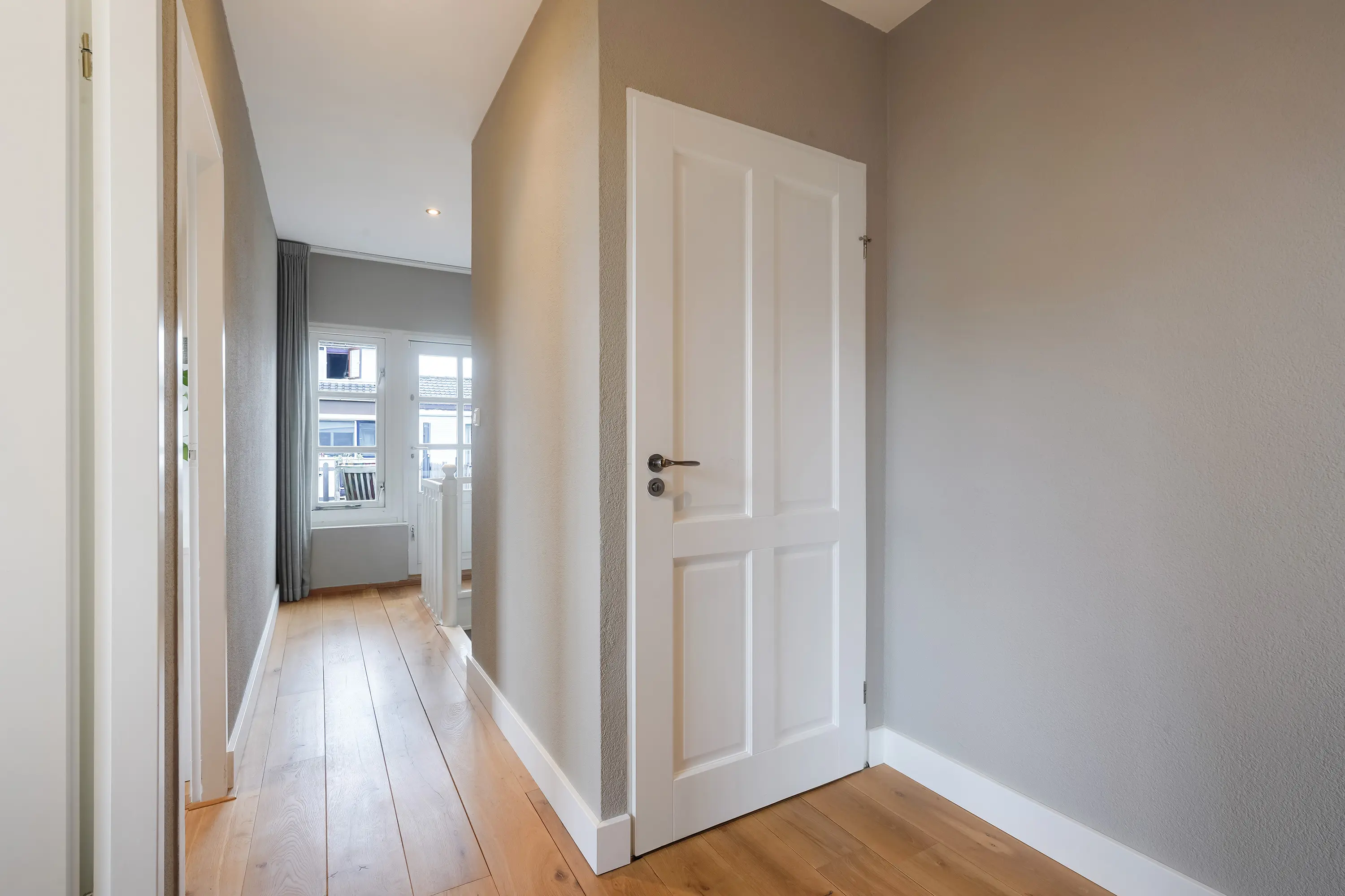Via de ronde trap in de woonkamer bereikt u de eerste verdieping, waar u uitkomt op een ruime overloop.