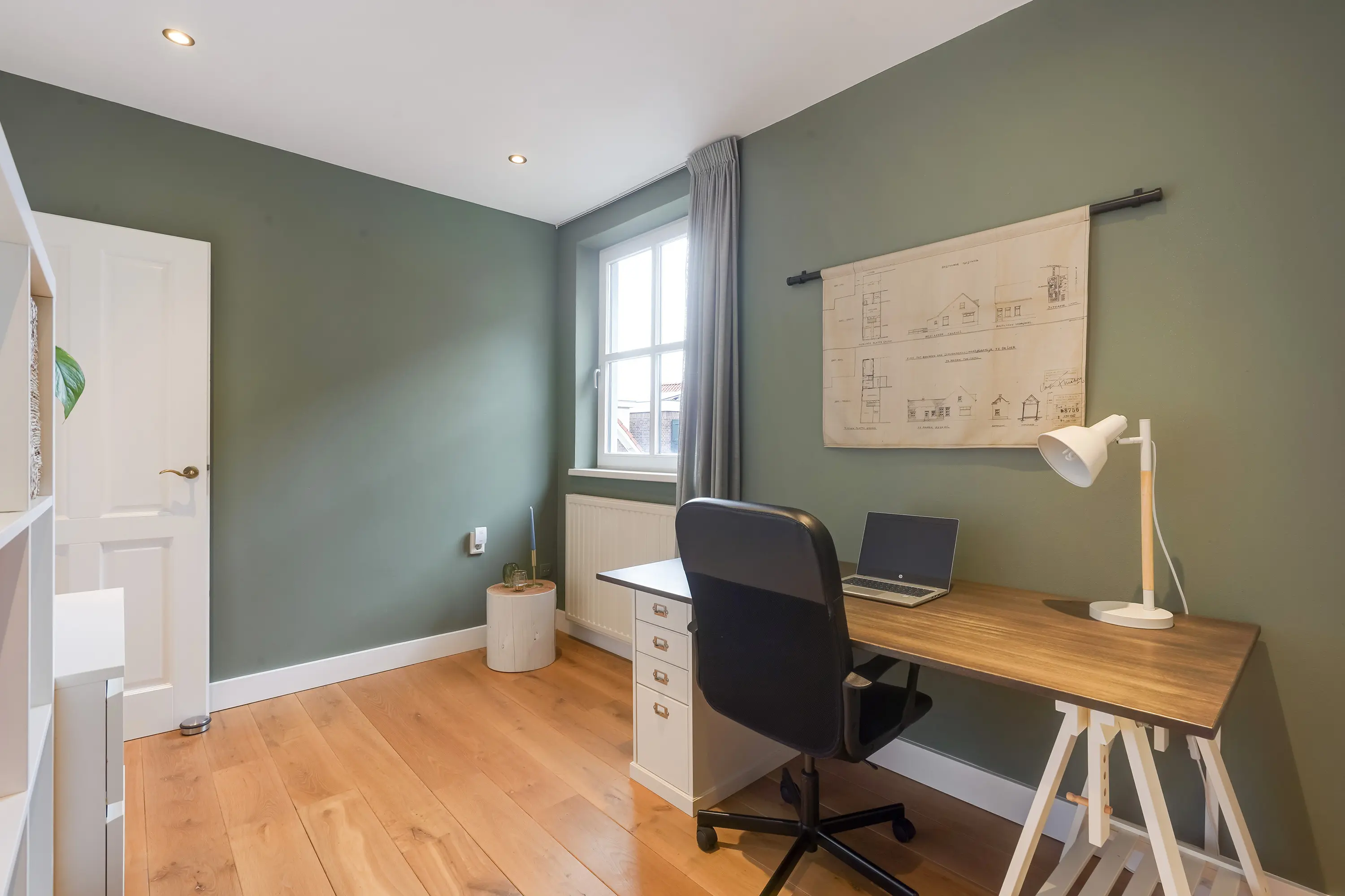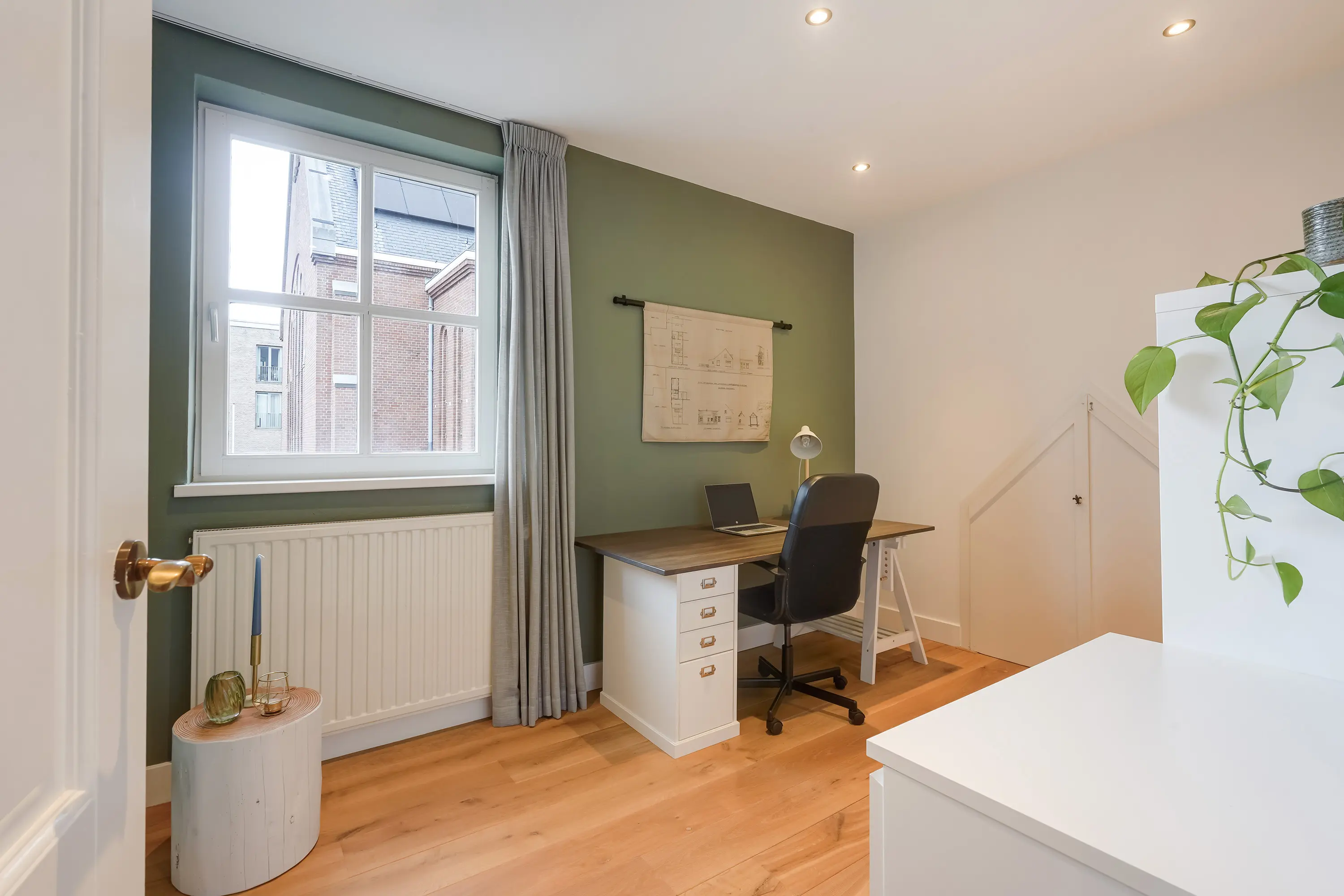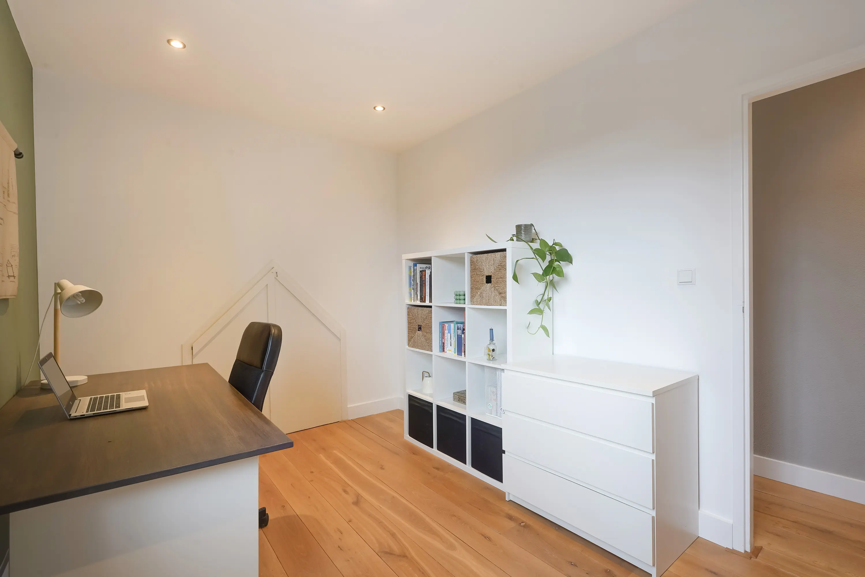 De rechter kamer is iets ruimer en doet nu dienst als kantoor/werkruimte. Dankzij het grote raam valt hier veel natuurlijk licht binnen, ideaal voor een fijne thuiswerkplek. In deze werkkamer vindt u bovendien twee kleine openslaande deuren die toegang geven tot een zeer praktische berging van ca. 21 m². Deze ruimte is ideaal voor het opbergen van seizoensgebonden spullen of zaken die u niet dagelijks nodig heeft.