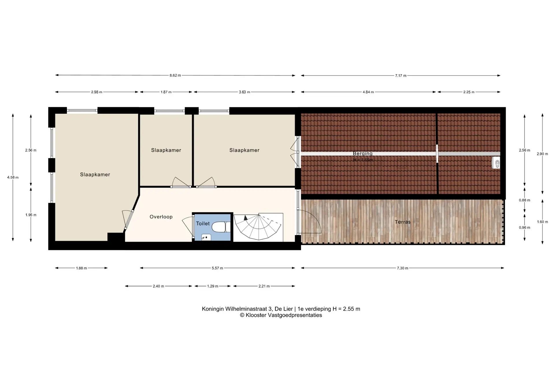 - Drie (slaap)kamers + extra berging van ca. 21 m²;
