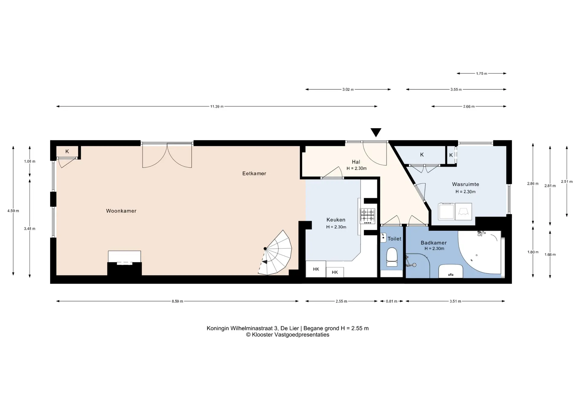 Bij binnenkomst betreedt u een royale hal die toegang biedt tot diverse vertrekken. Vanuit de hal bereikt u onder andere de wasruimte, de badkamer, het separate toilet met fontein en de leefkeuken, die in open verbinding staat met de woonkamer en eetkamer.