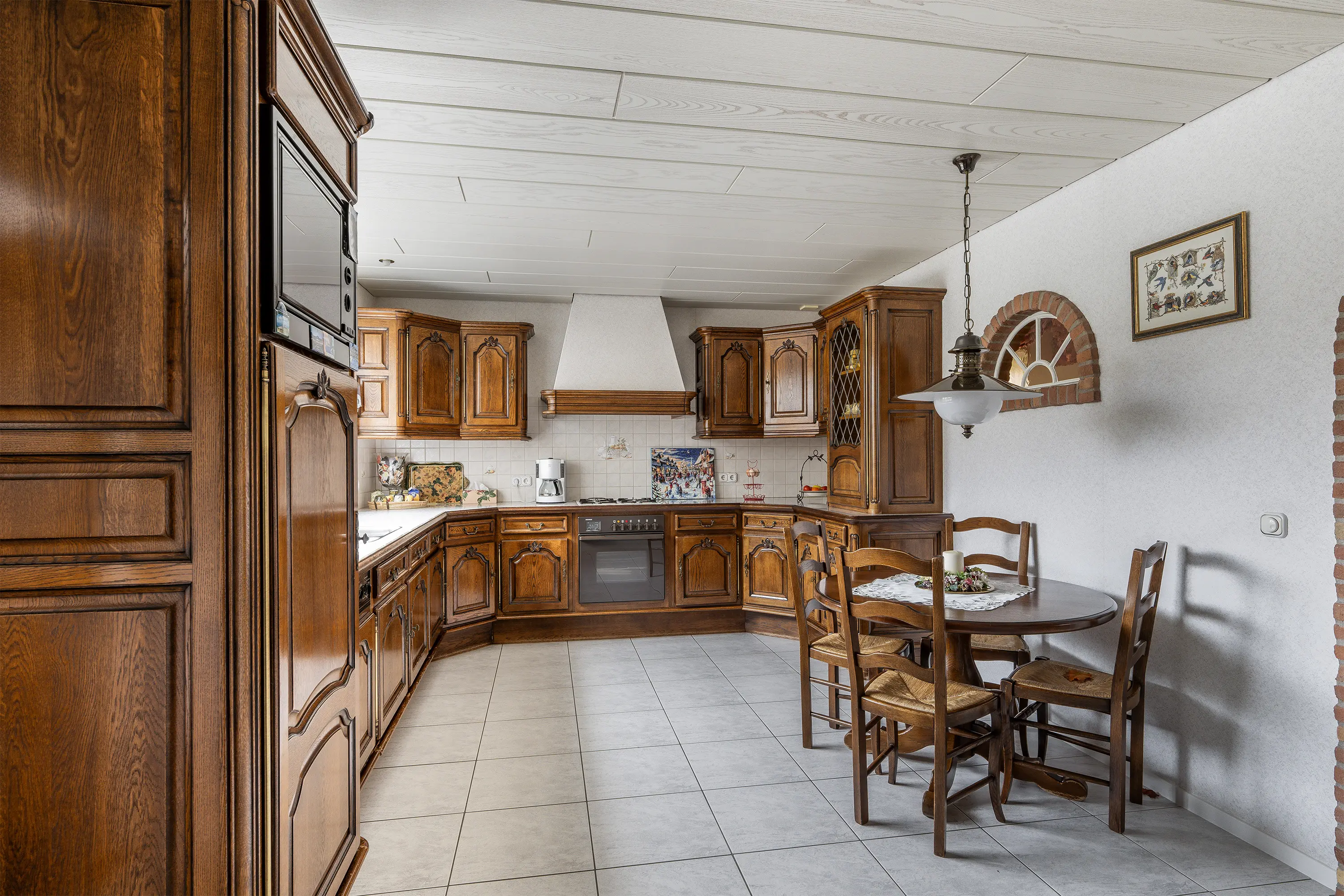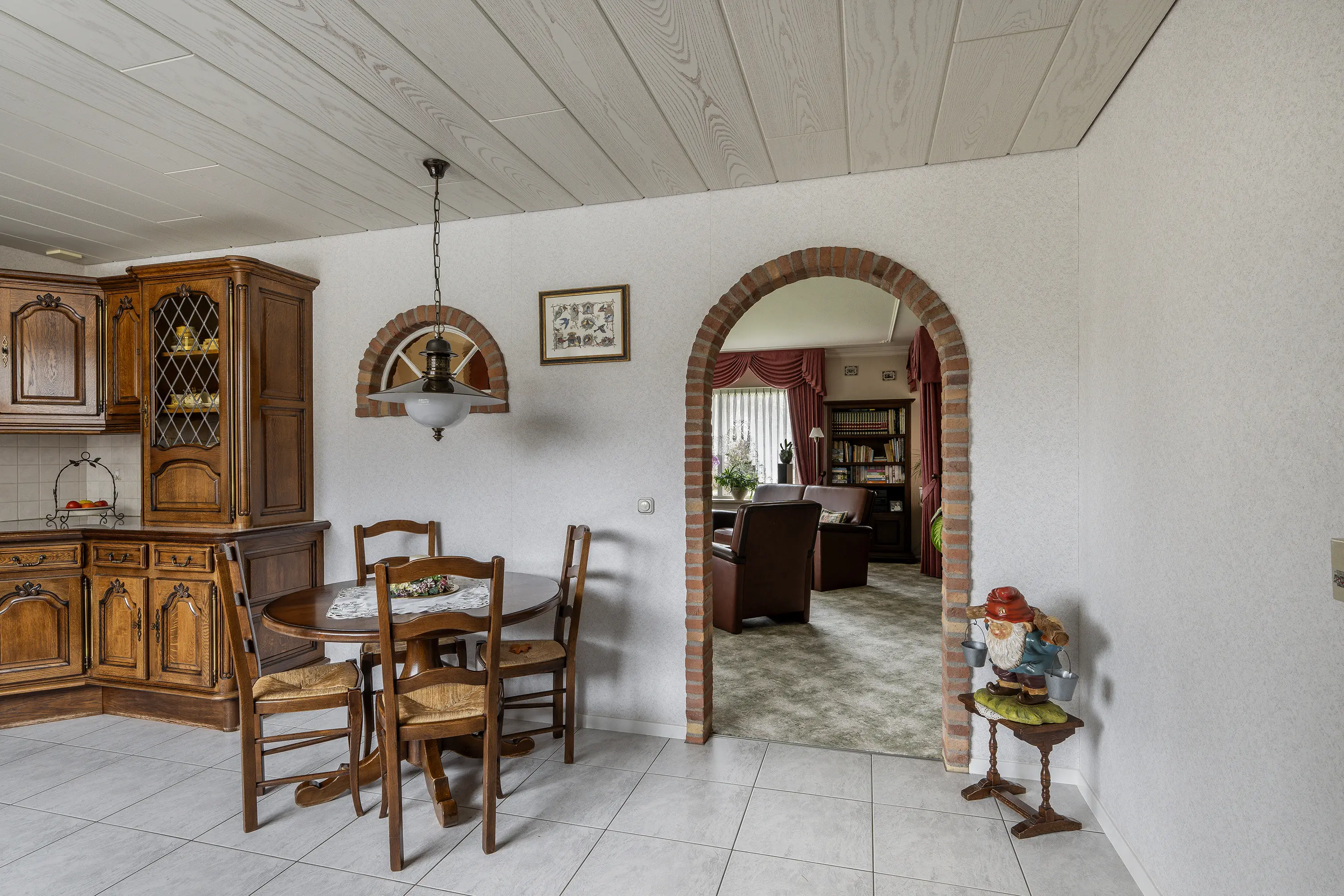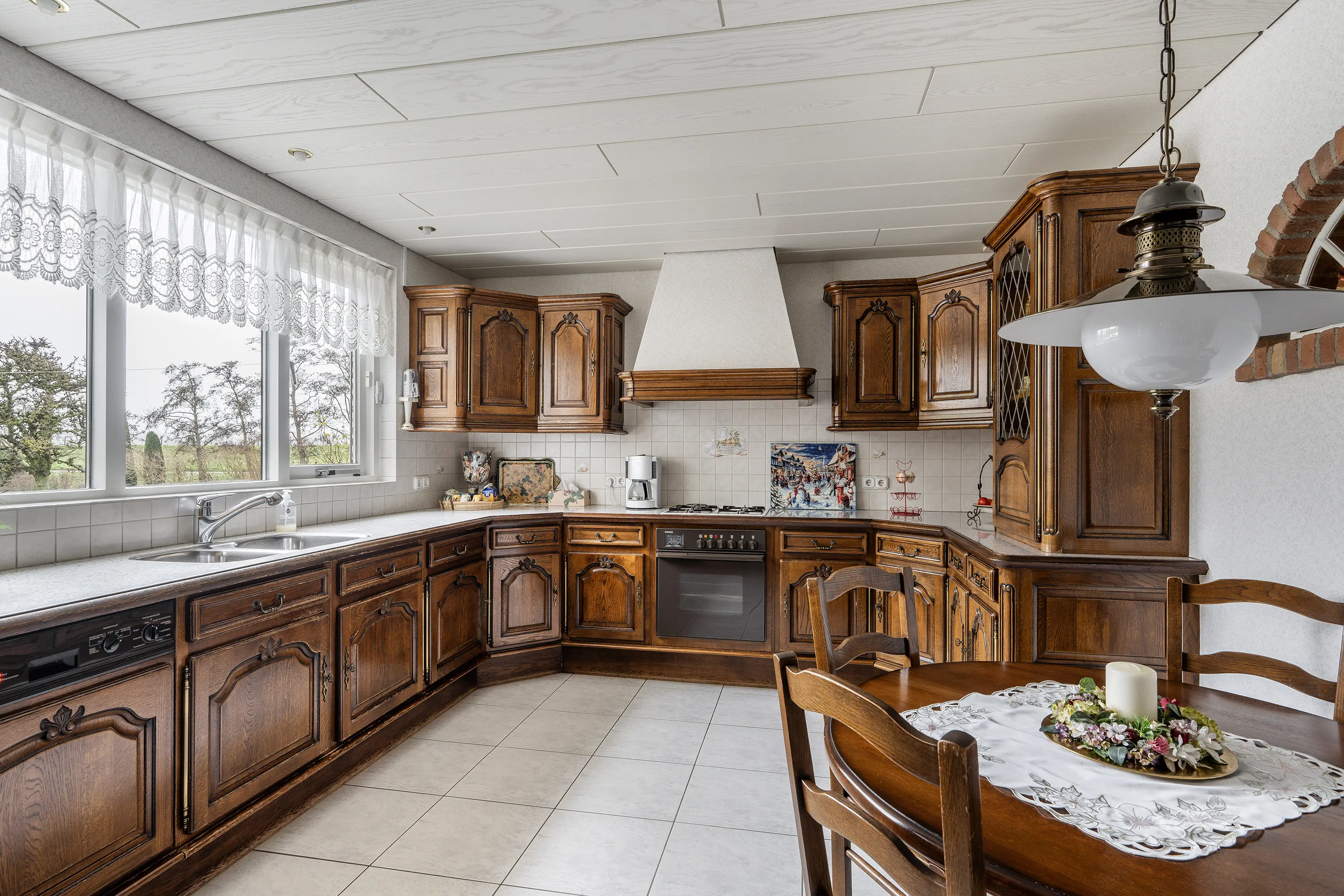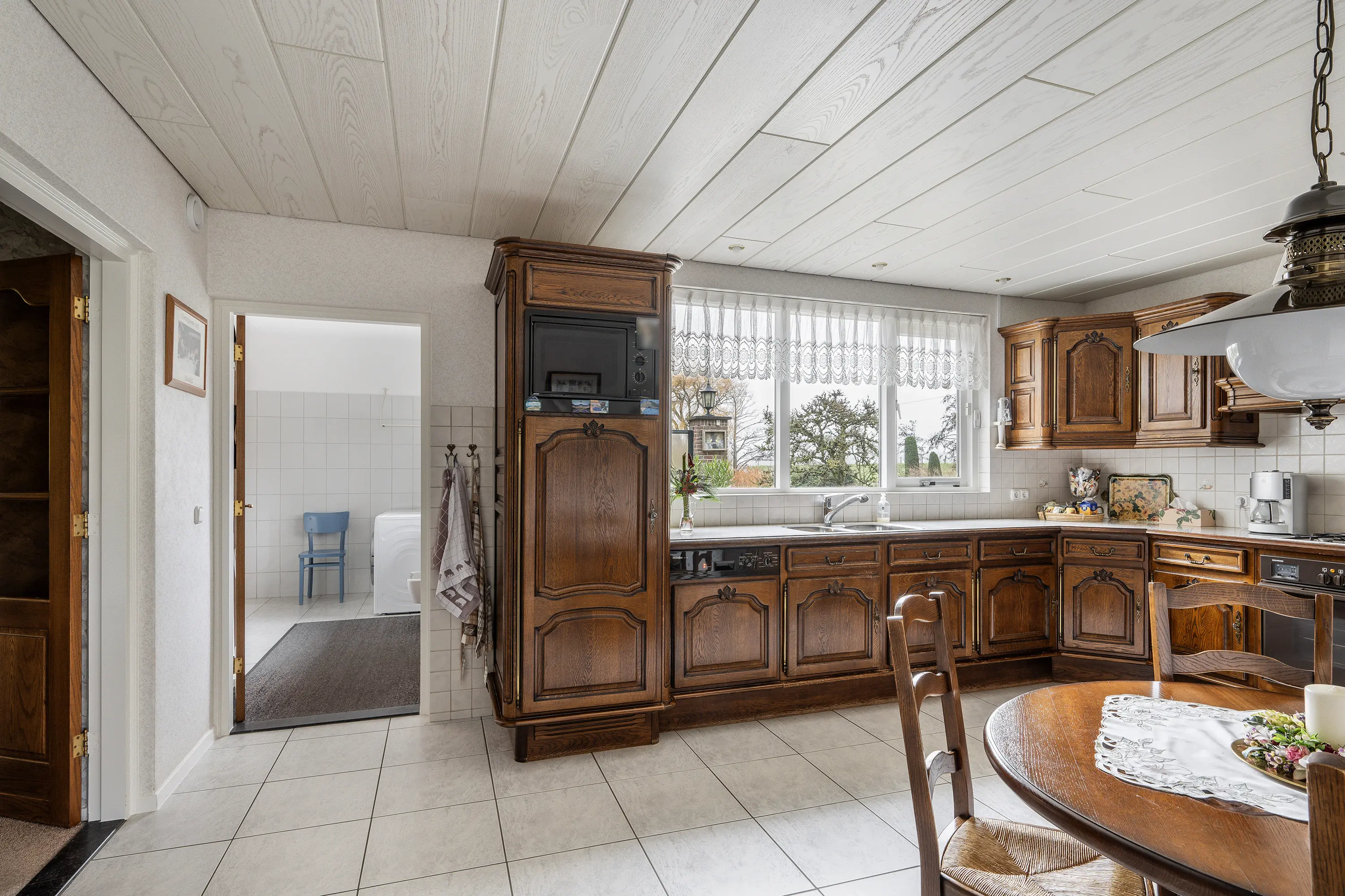 Aangrenzend bevindt zich de ruime keuken, die eveneens is gericht op de tuin. De keuken beschikt over voldoende werk- en bergruimte en biedt directe toegang tot de bijkeuken. De bijkeuken is praktisch ingericht en voorzien van aansluitingen voor wasapparatuur en extra kastruimte.
