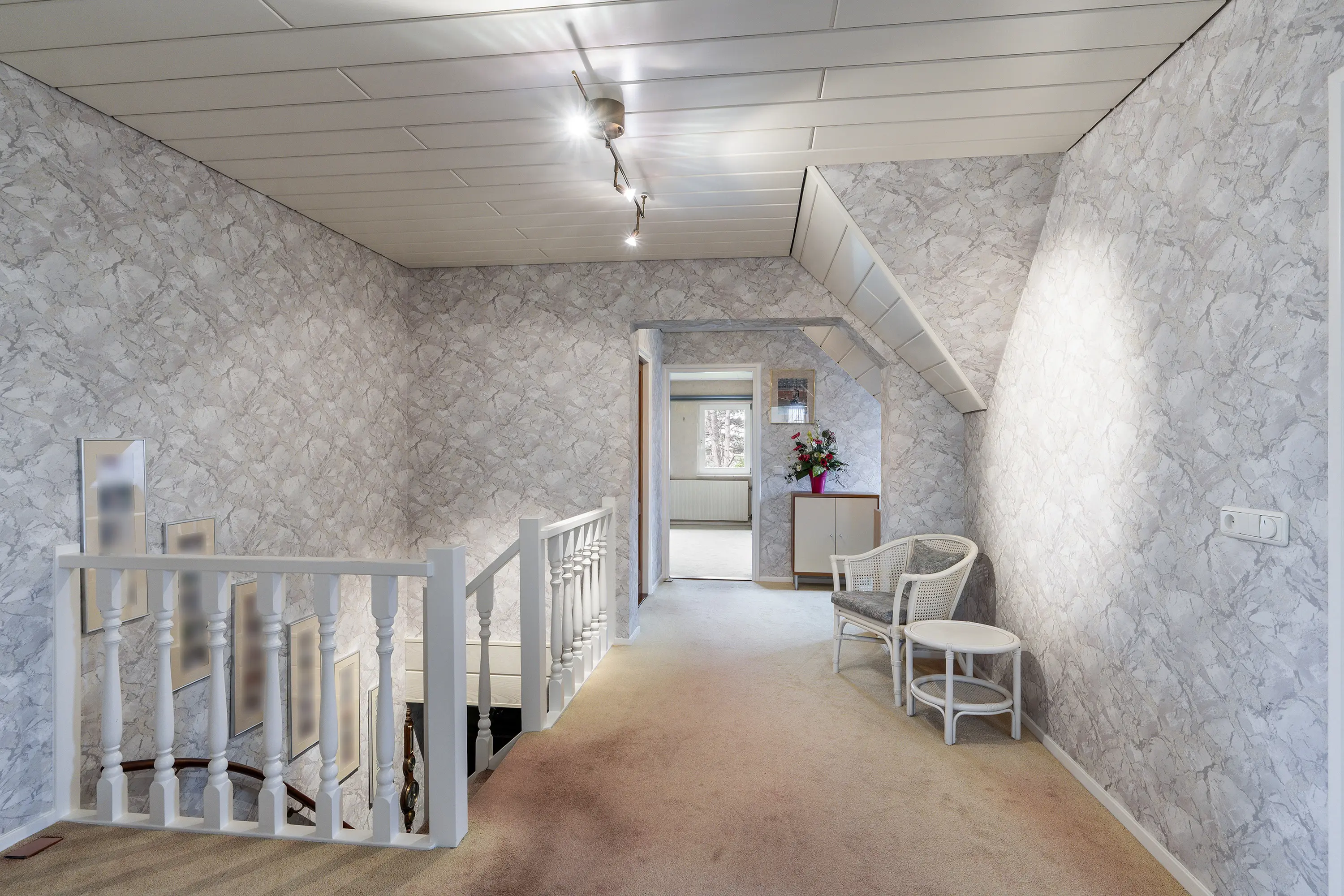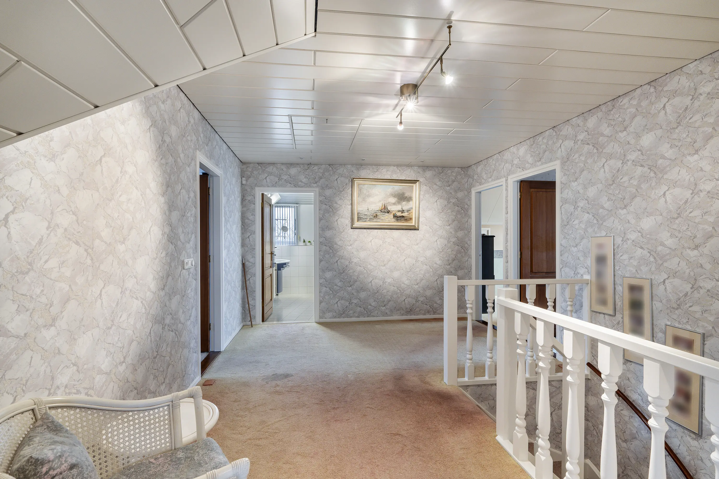 Via de vaste trap bereikt u de ruime overloop, welke toegang biedt tot vier goed bemeten slaapkamers, een tweede badkamer, een extra bergruimte en de opbergzolder.