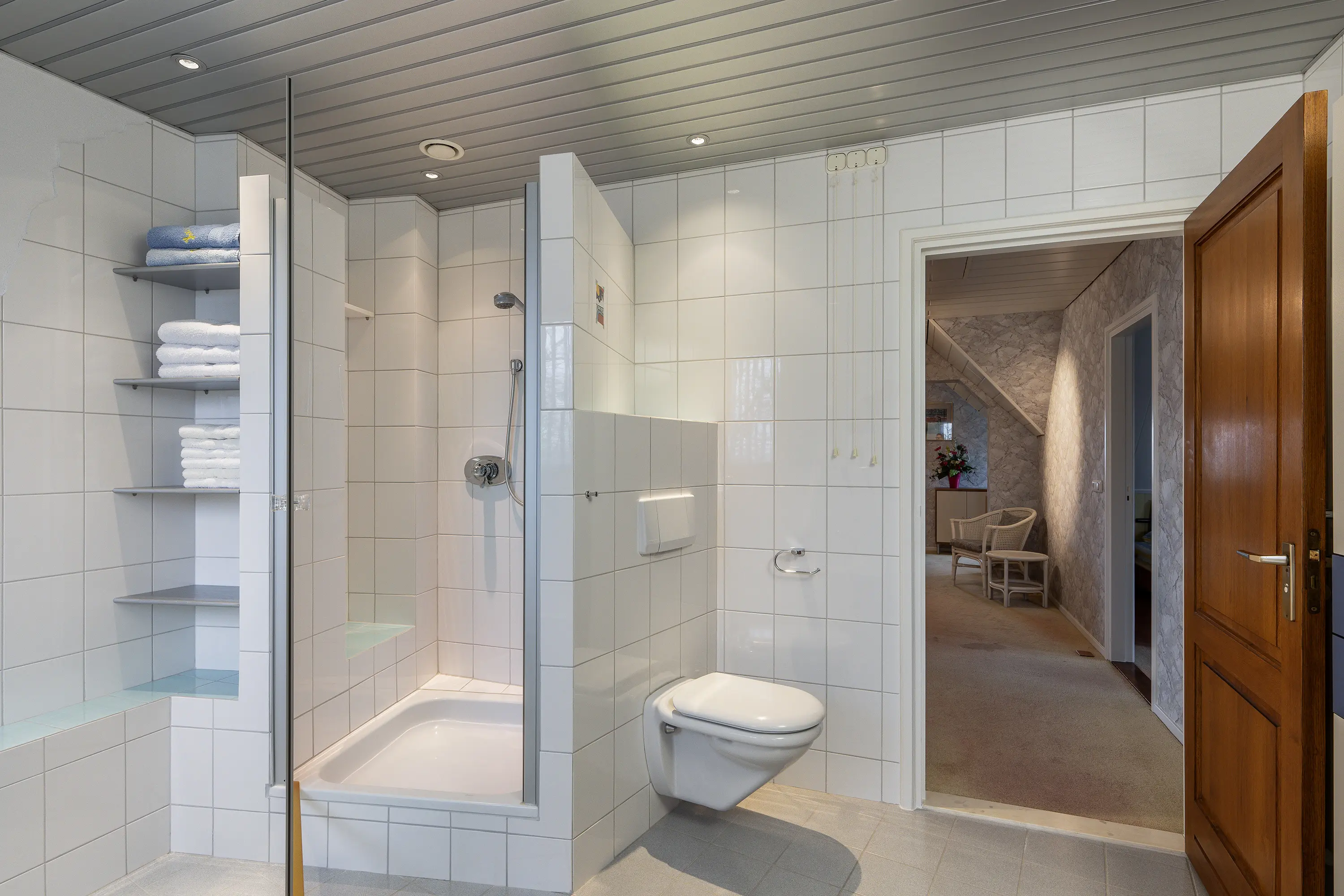 De tweede badkamer op deze verdieping is praktisch en compleet ingericht en voorzien van een douche, bad, wastafelmeubel en toilet. Vanaf de overloop is tevens de ruime opbergzolder bereikbaar middels een vlizotrap. Deze zolder biedt, met een nokhoogte van 2,13m, volop bergruimte voor seizoensspullen en overige opslag.