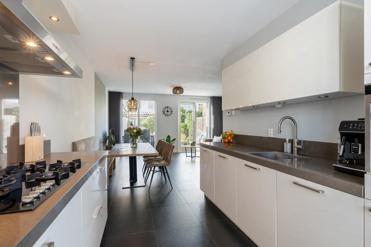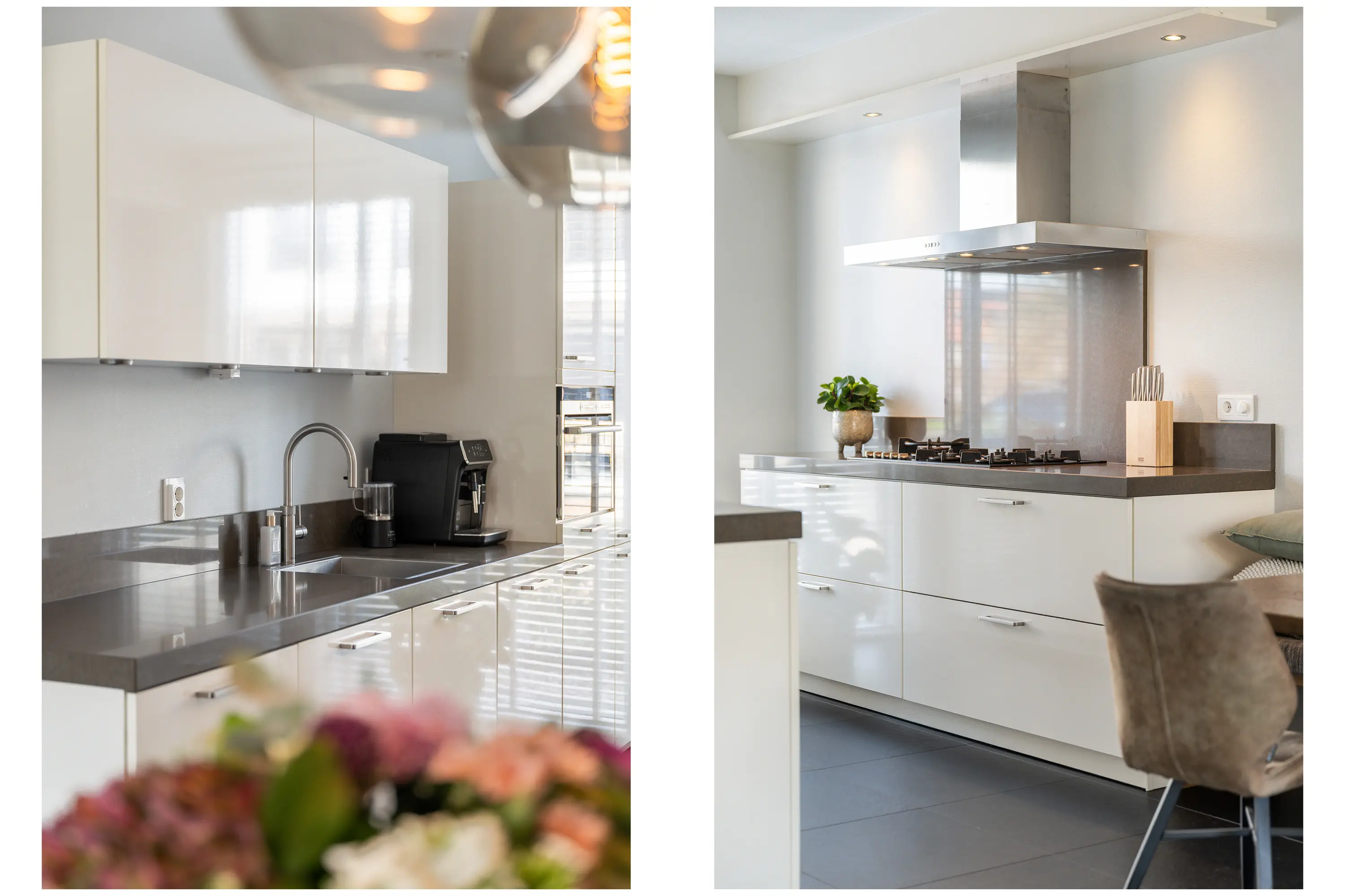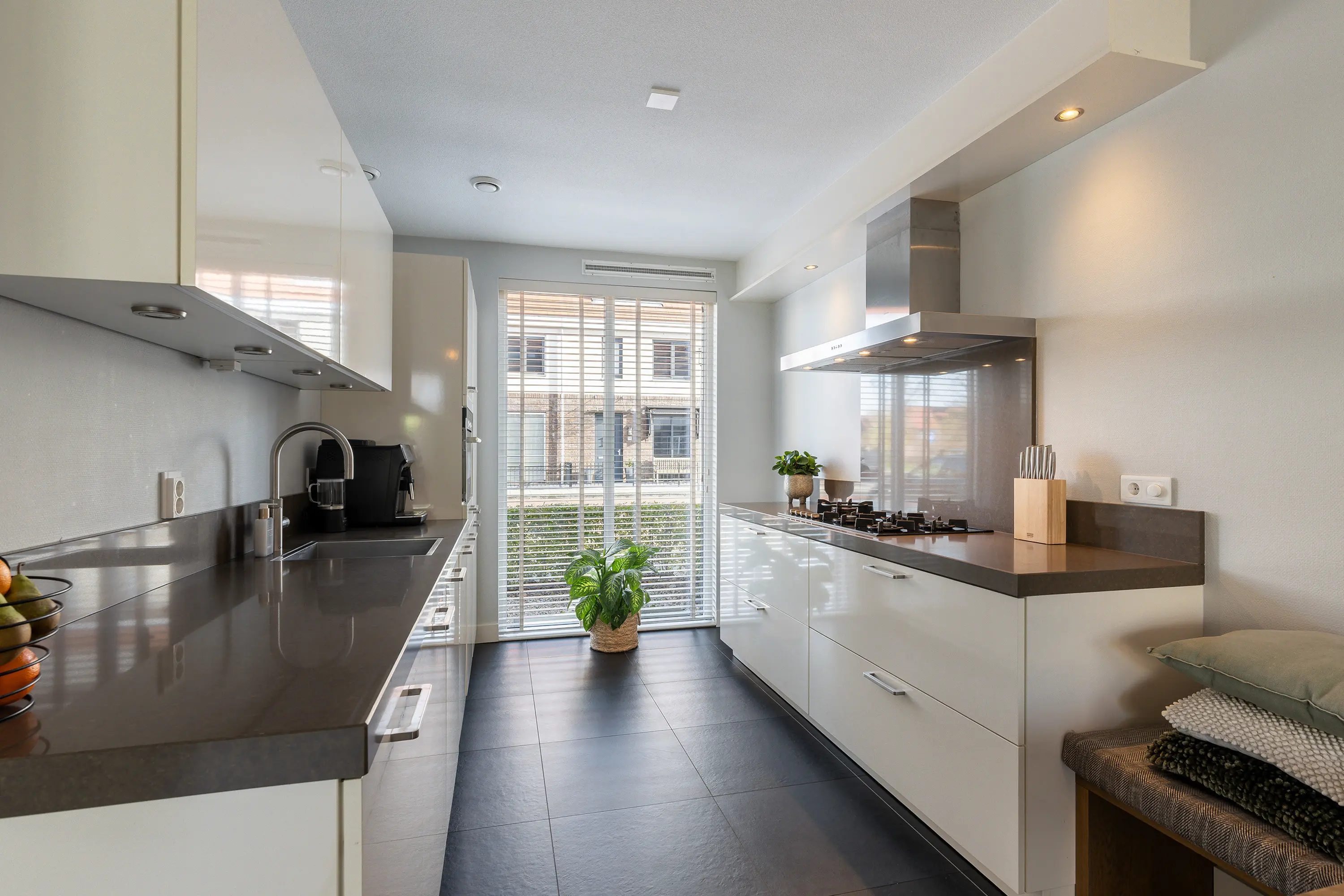 De keuken is strak vormgegeven, uitgevoerd met witte kasten en een grijs stenen werkblad. De keuken is uitgerust met diverse inbouwapparatuur, waaronder een 5-pits gasfornuis, koelkast, vriezer, Quooker-kraan, afzuigkap en vaatwasser.