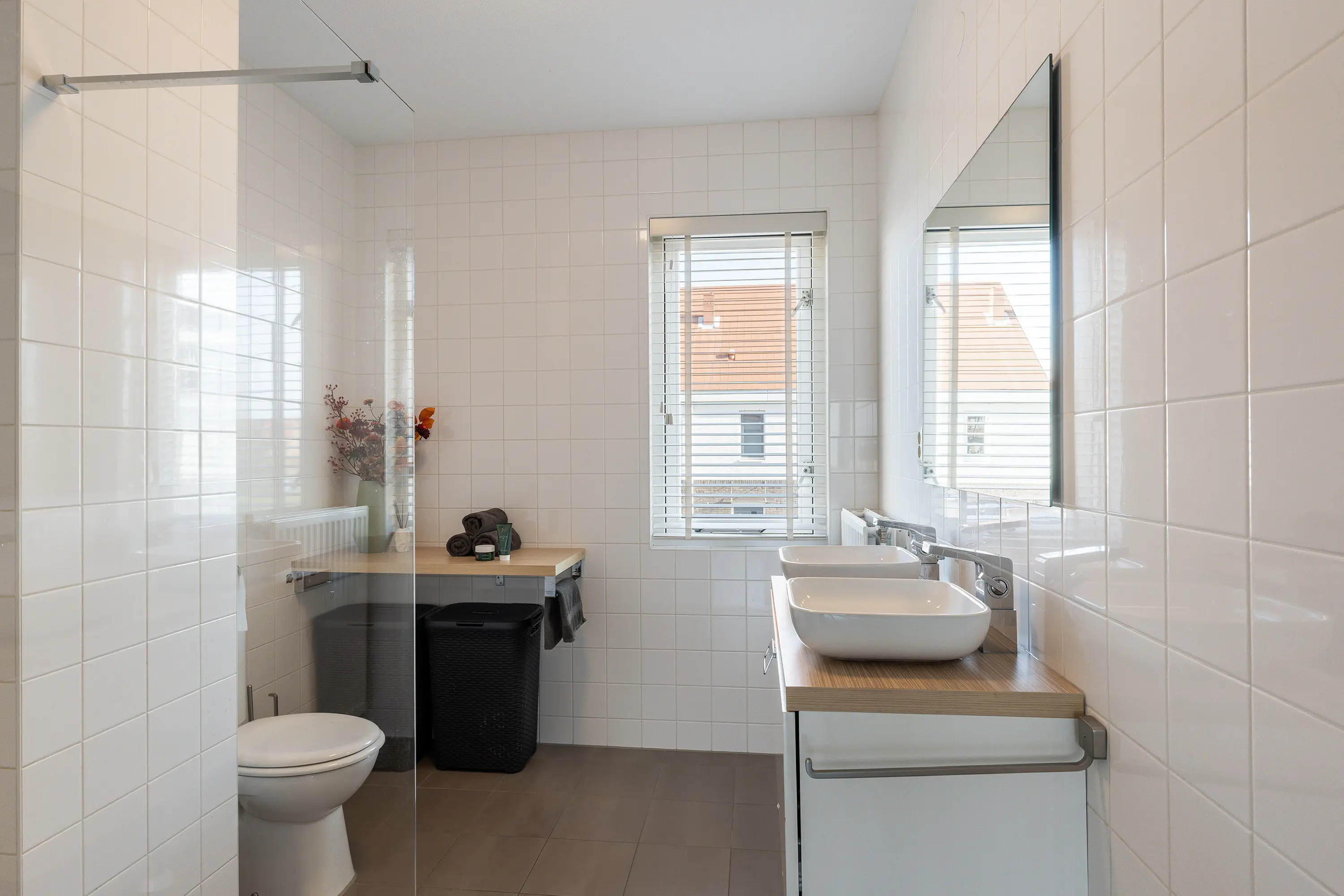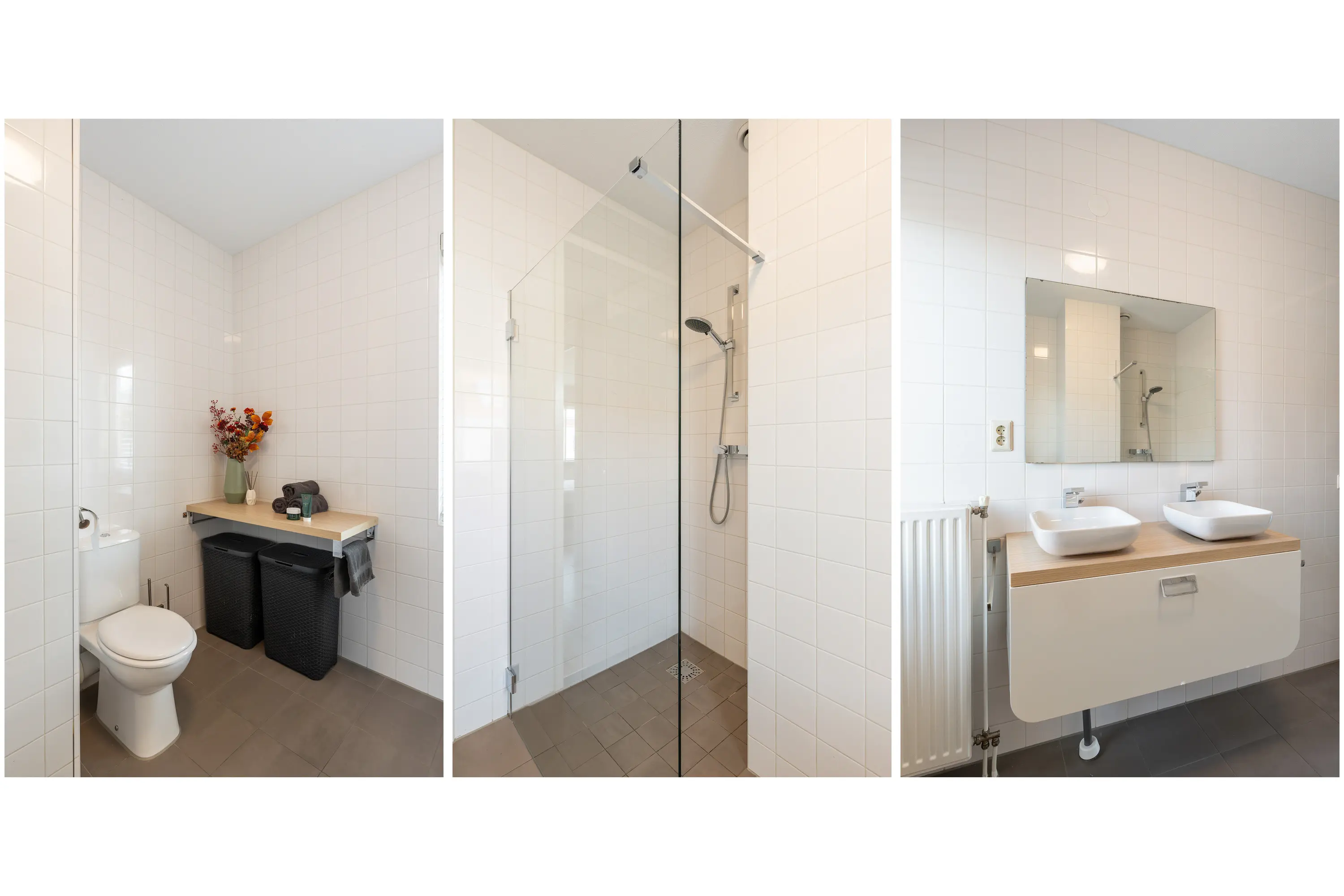 Aan de voorzijde van de woning bevindt zich tevens de badkamer, uitgerust met een inloopdouche, tweede toilet en een dubbel wastafelmeubel.