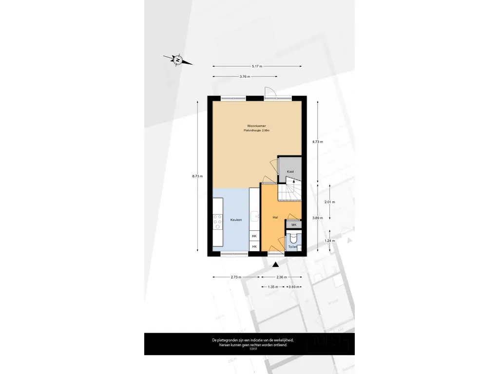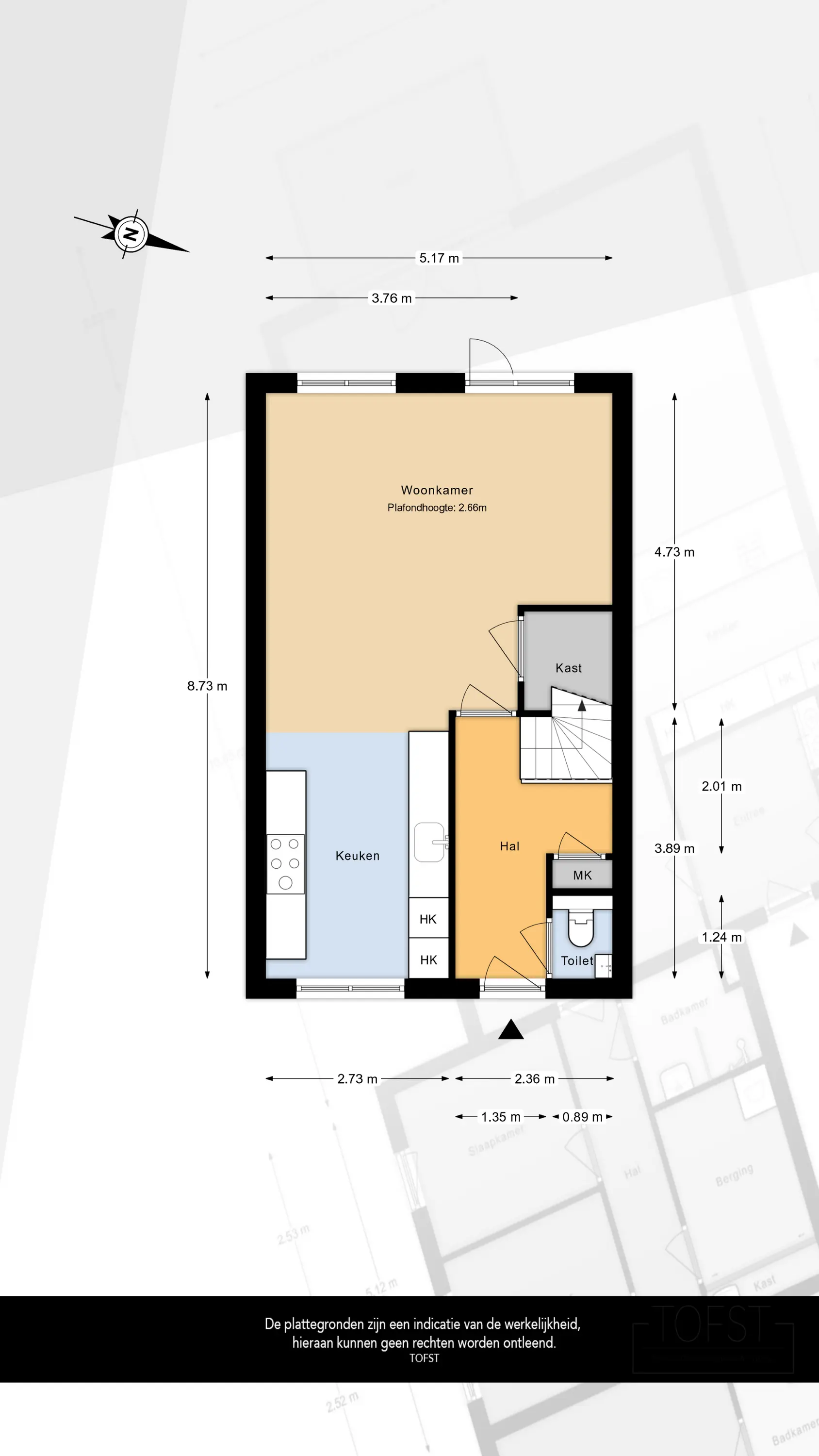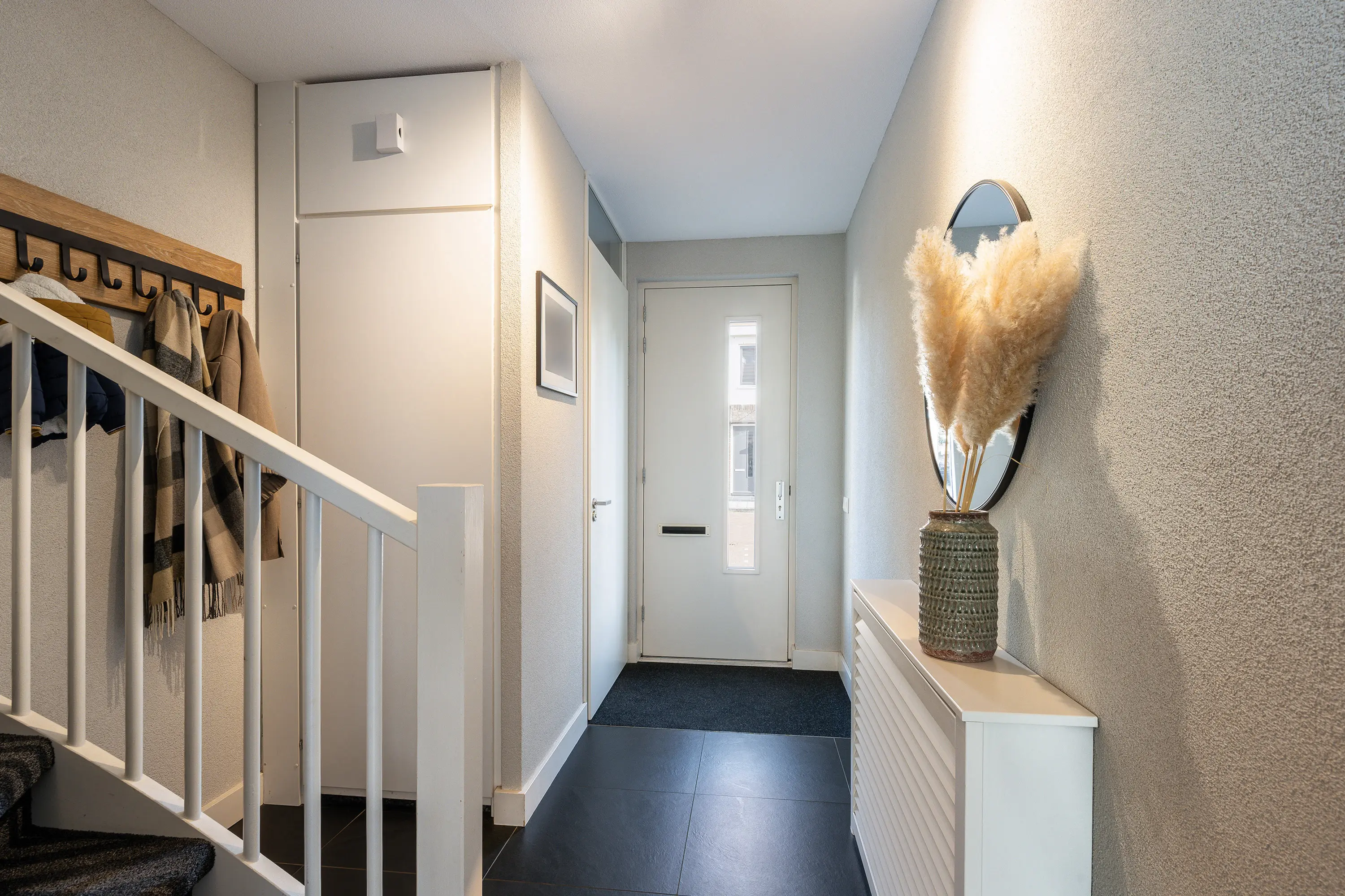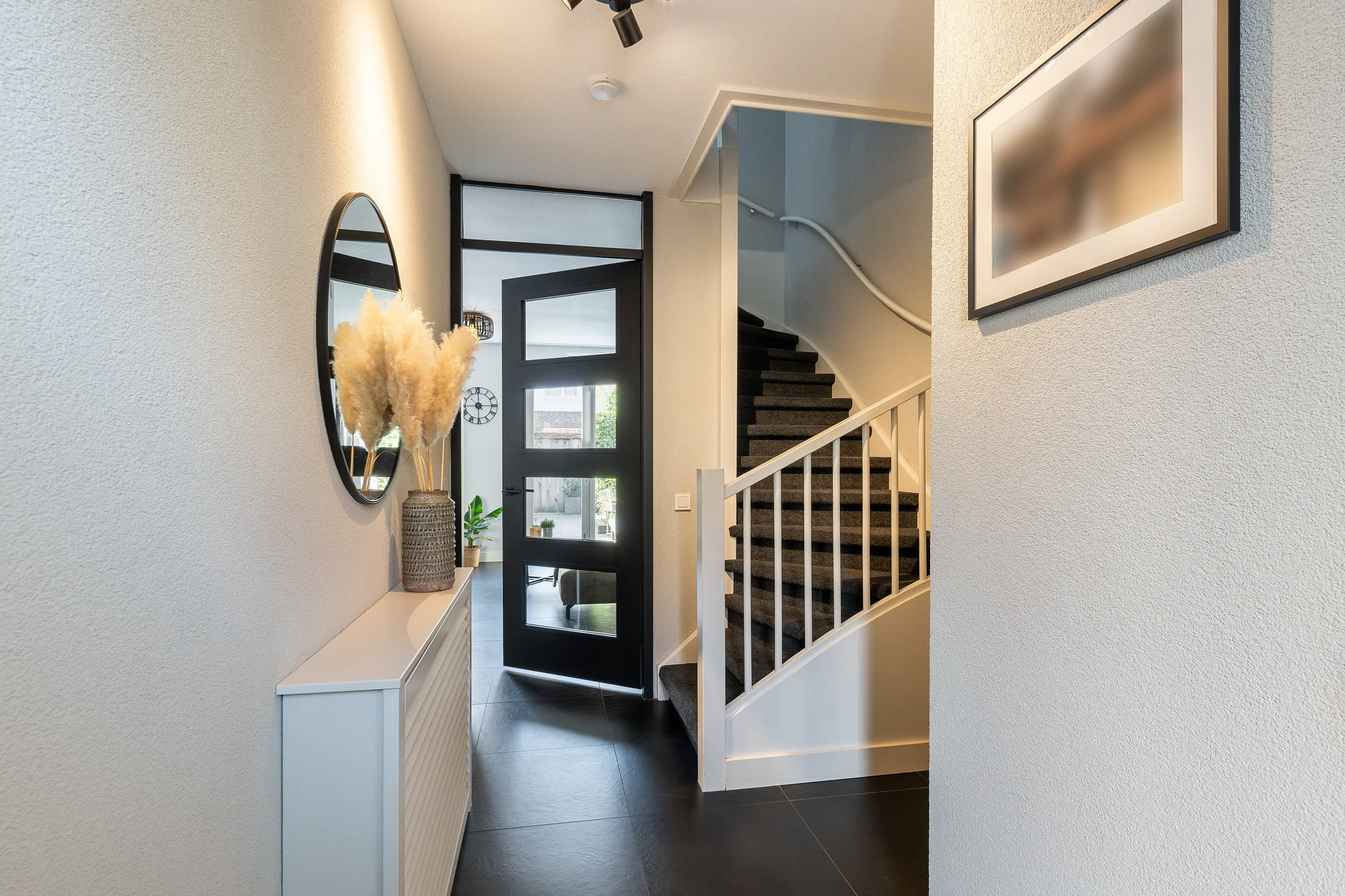 U komt binnen in een ruime hal met toegang tot het toilet en de trap naar boven. Via een stijlvolle zwarte deur met glazen panelen betreedt u de lichte woonkamer.