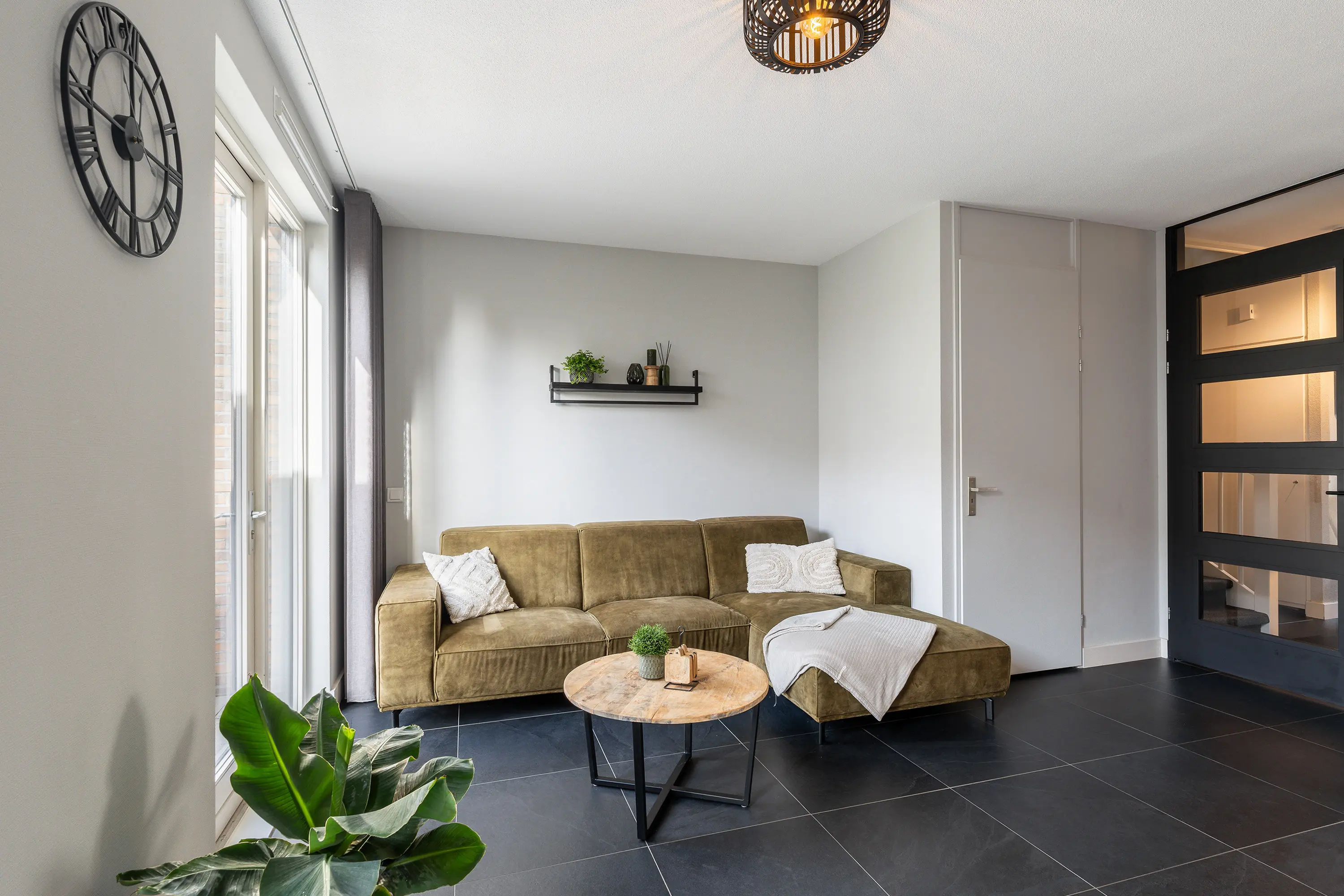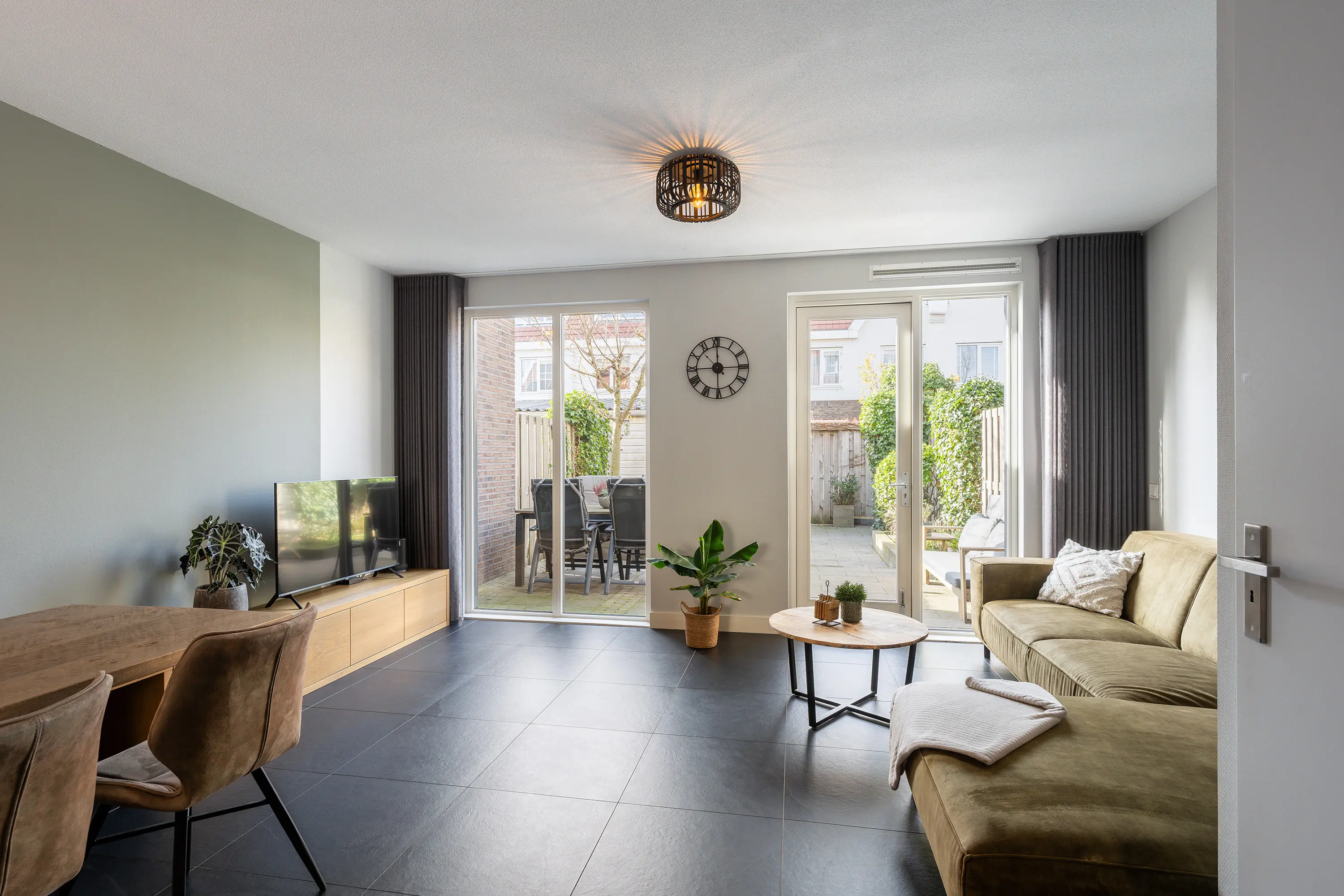 Dankzij de gunstige (zon)ligging en de grote ramen geniet de woonkamer van veel natuurlijk licht en een prettig uitzicht op de tuin.