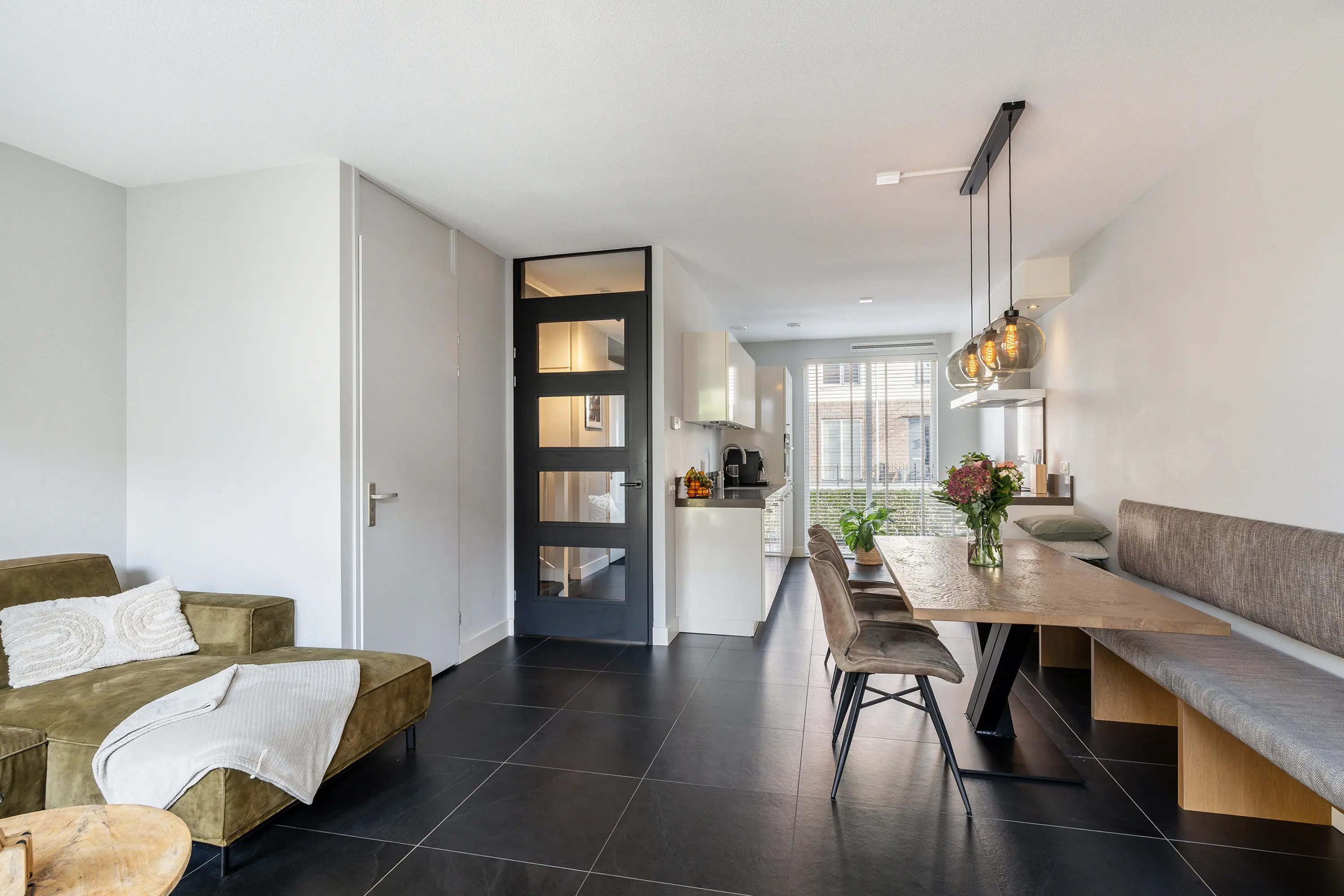 De woonkamer beschikt over een plavuizen vloer met vloerverwarming. Aan de achterzijde van de woning bevindt zich de zithoek, met twee grote raampartijen en een deur naar de goed bemeten achtertuin.