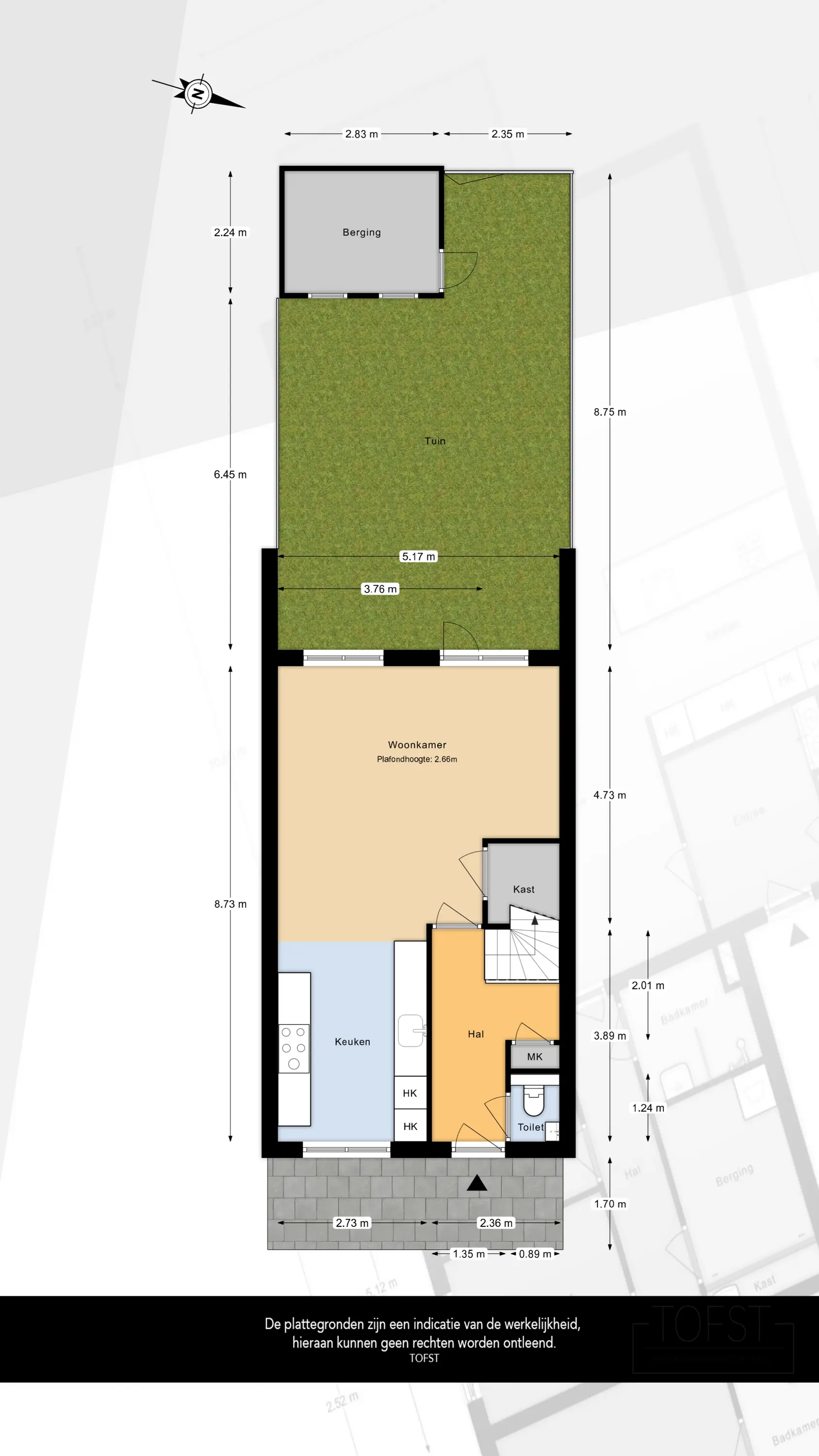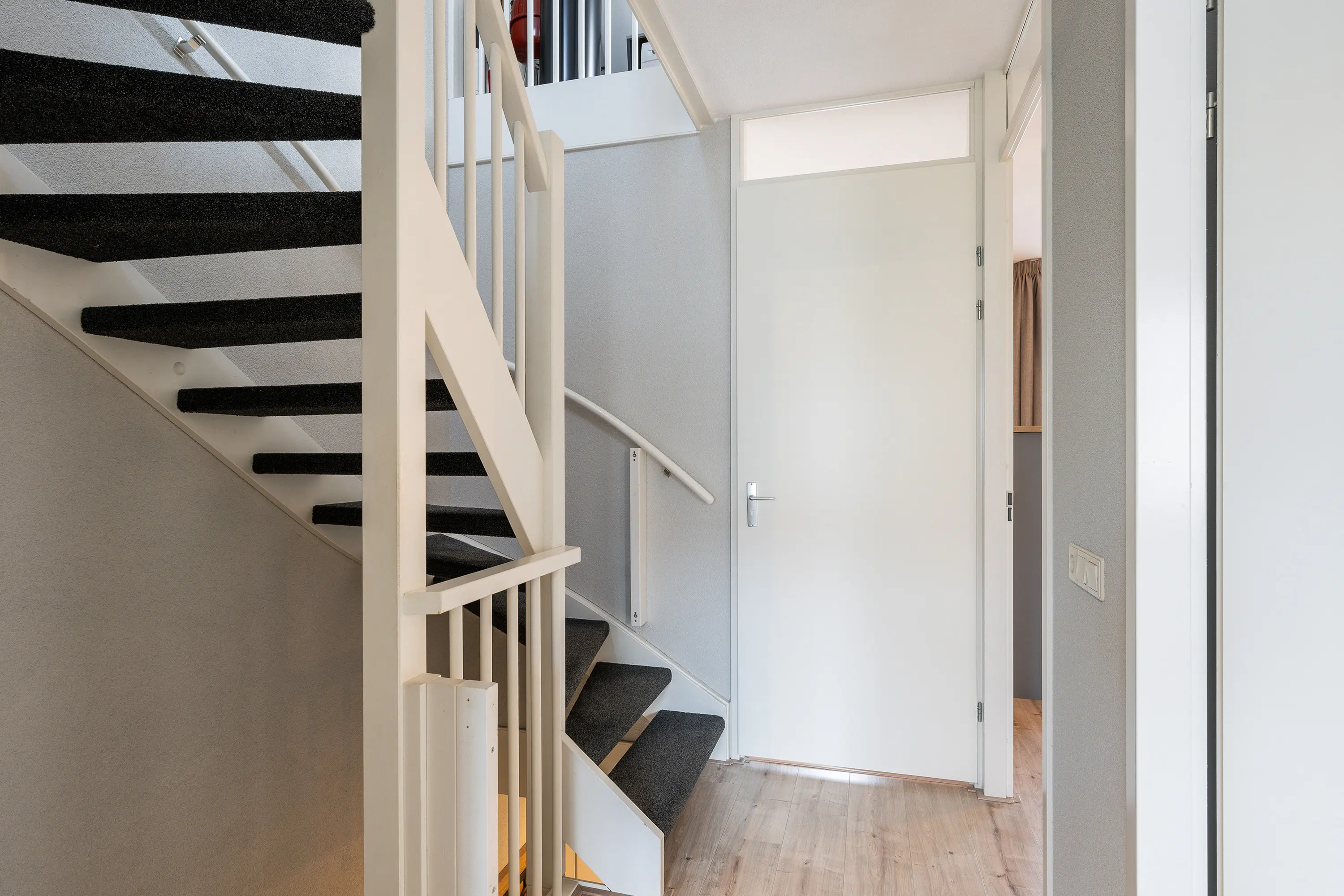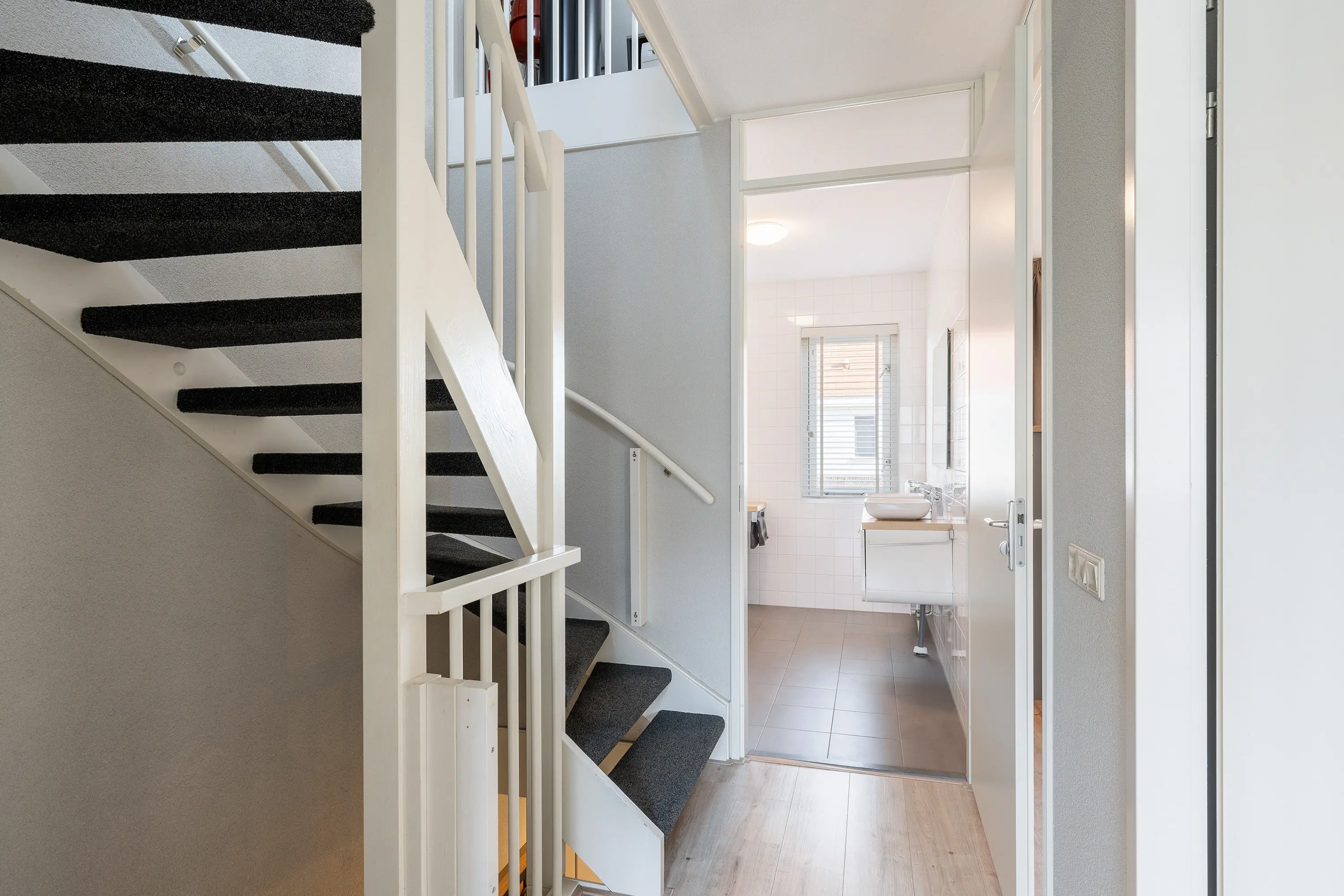 Terug in de hal vindt u de trap naar de eerste verdieping. Tegenover de trap bevindt zich de toiletruimte en tevens de meterkast.