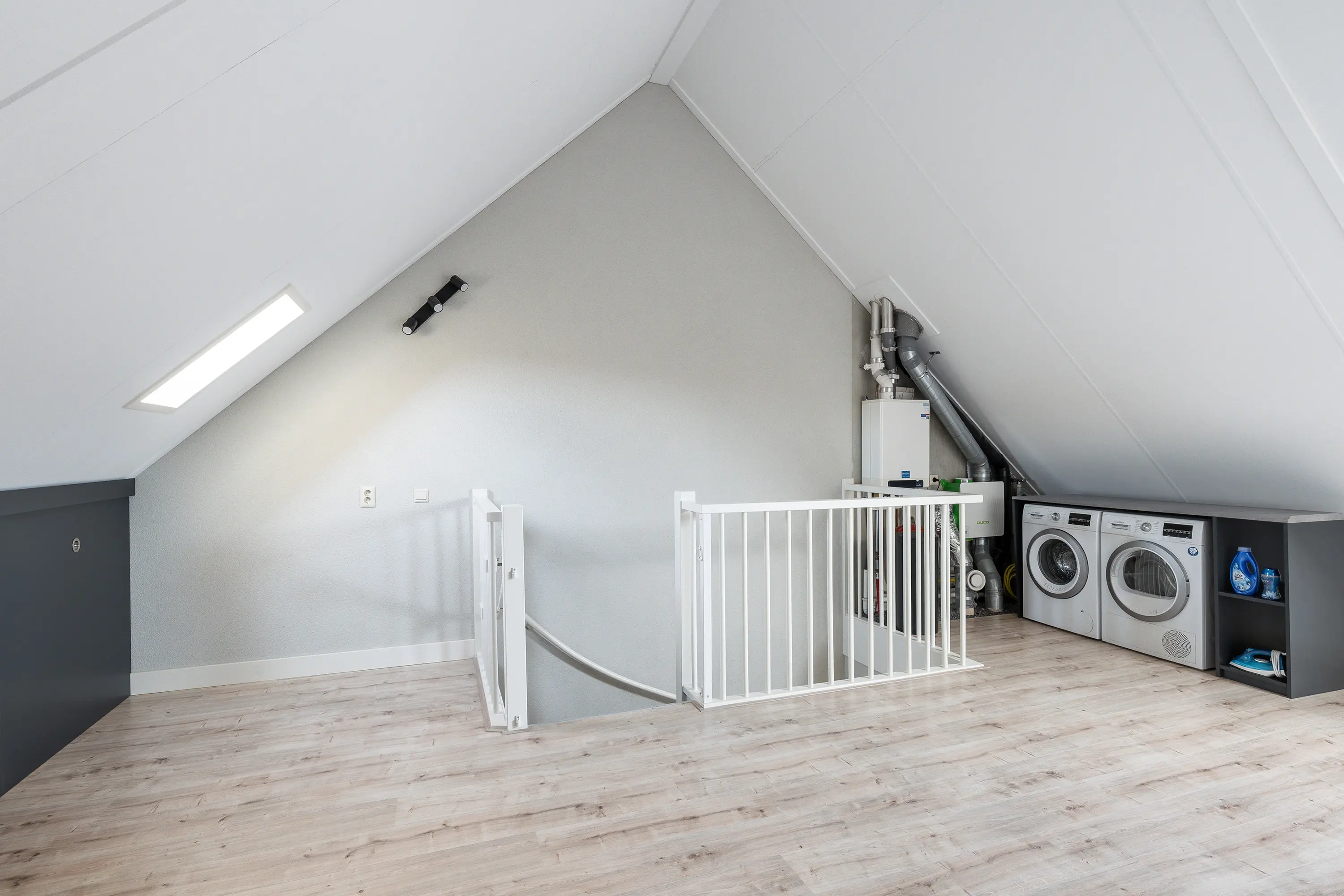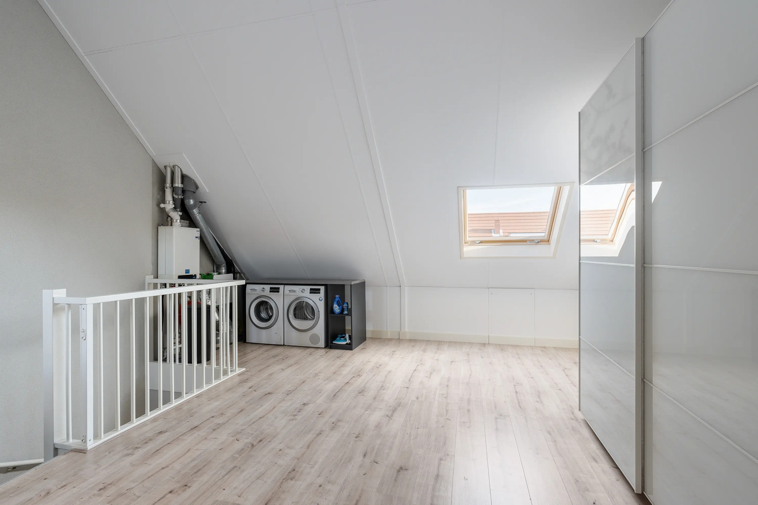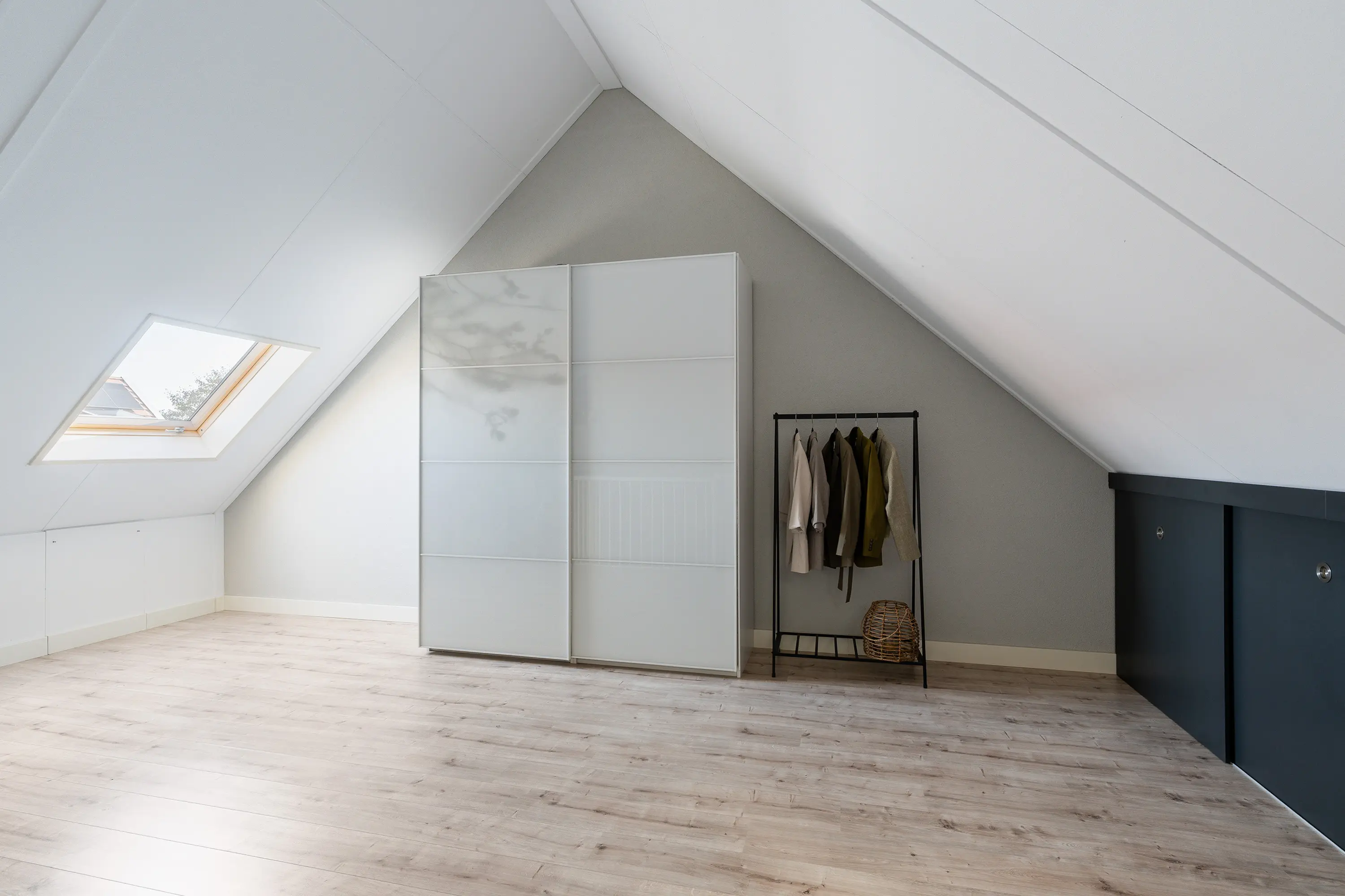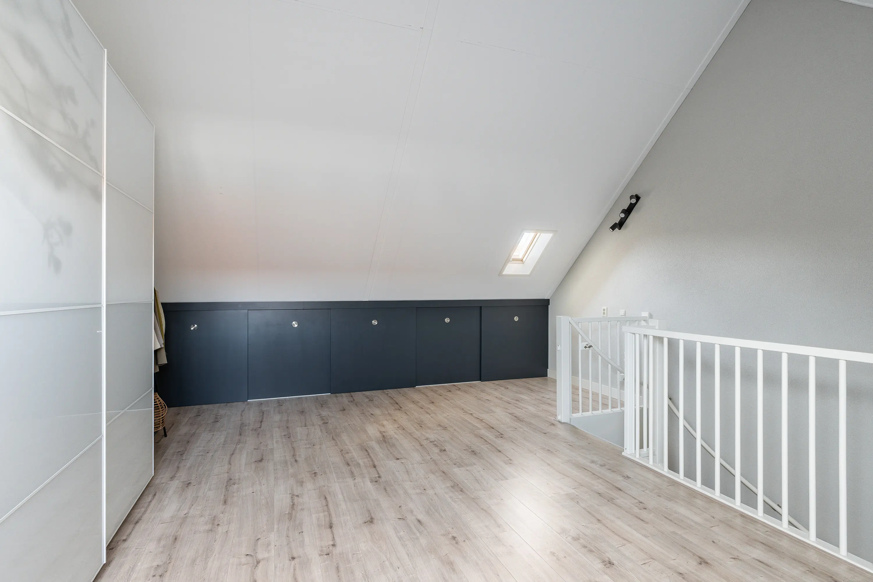 Aan beide zijden bevinden zich praktische opbergkasten onder het schuine dak, waardoor de ruimte efficiënt wordt benut.