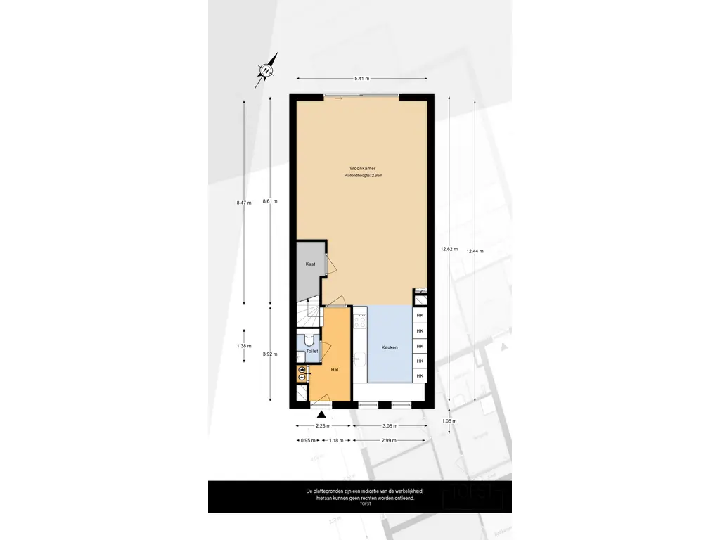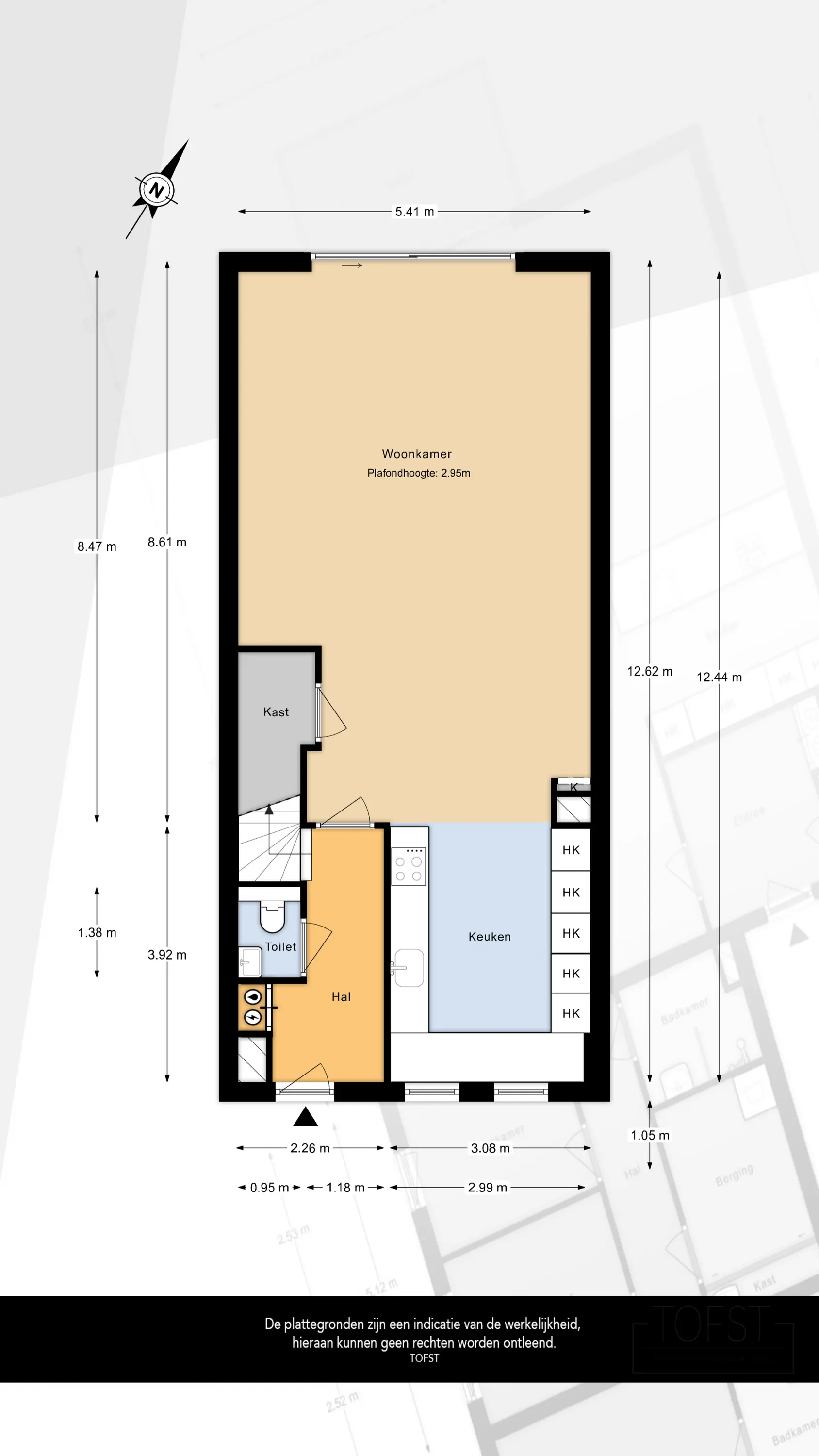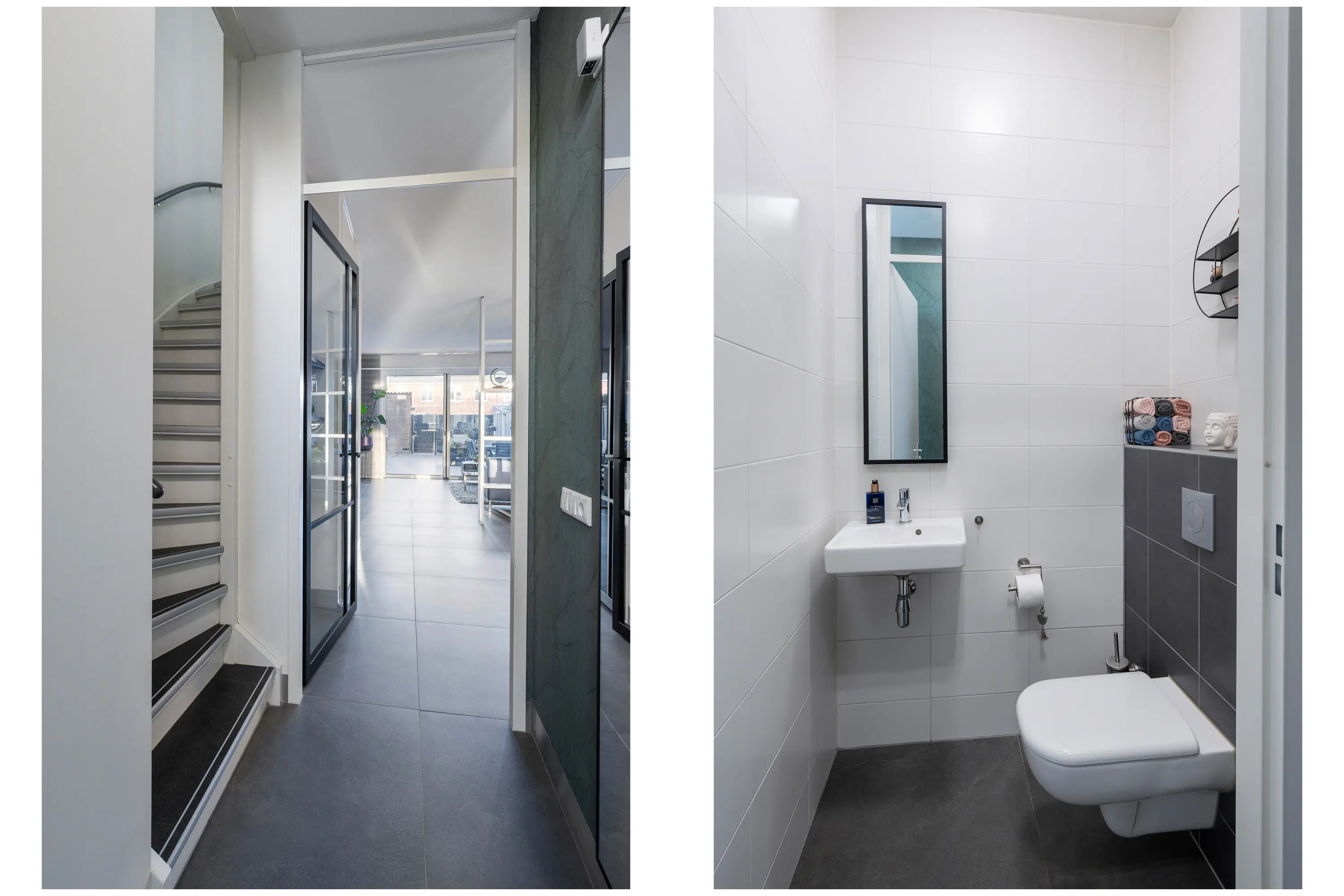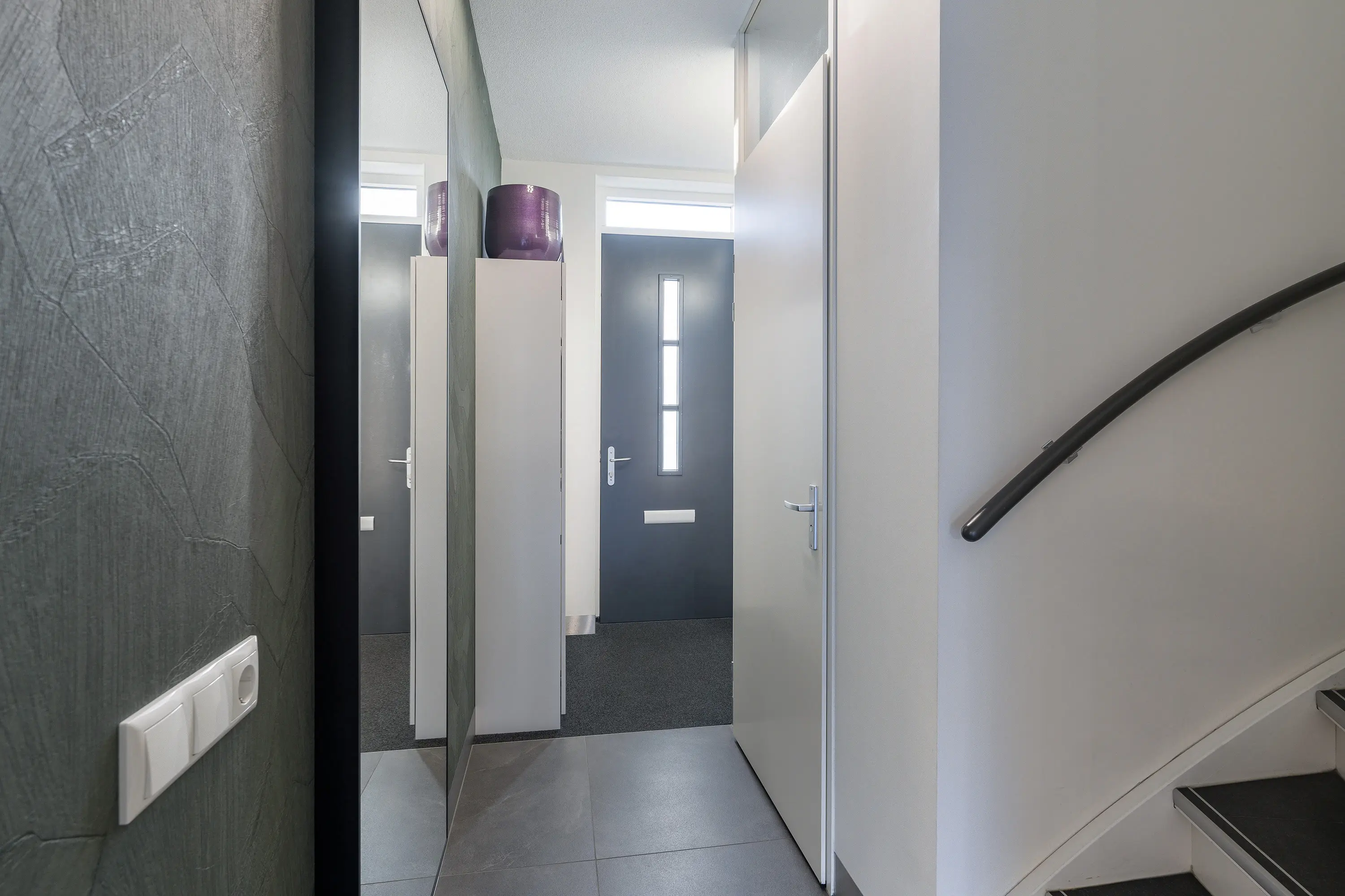 Entree in hal met meterkast (12 groepen), toiletruimte, vaste trapopgang en houten toegangsdeur met stalen look naar de royale woonkamer.