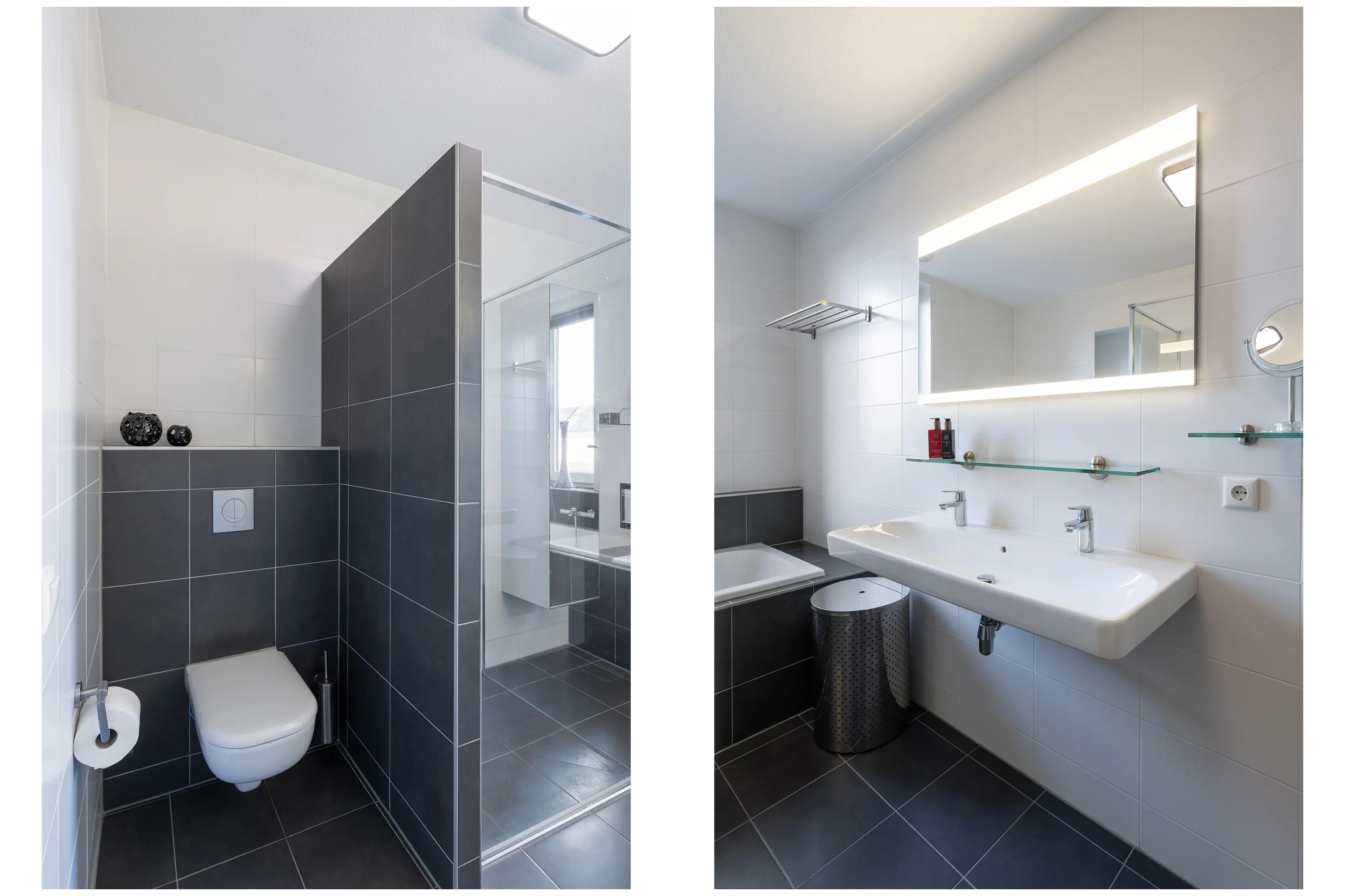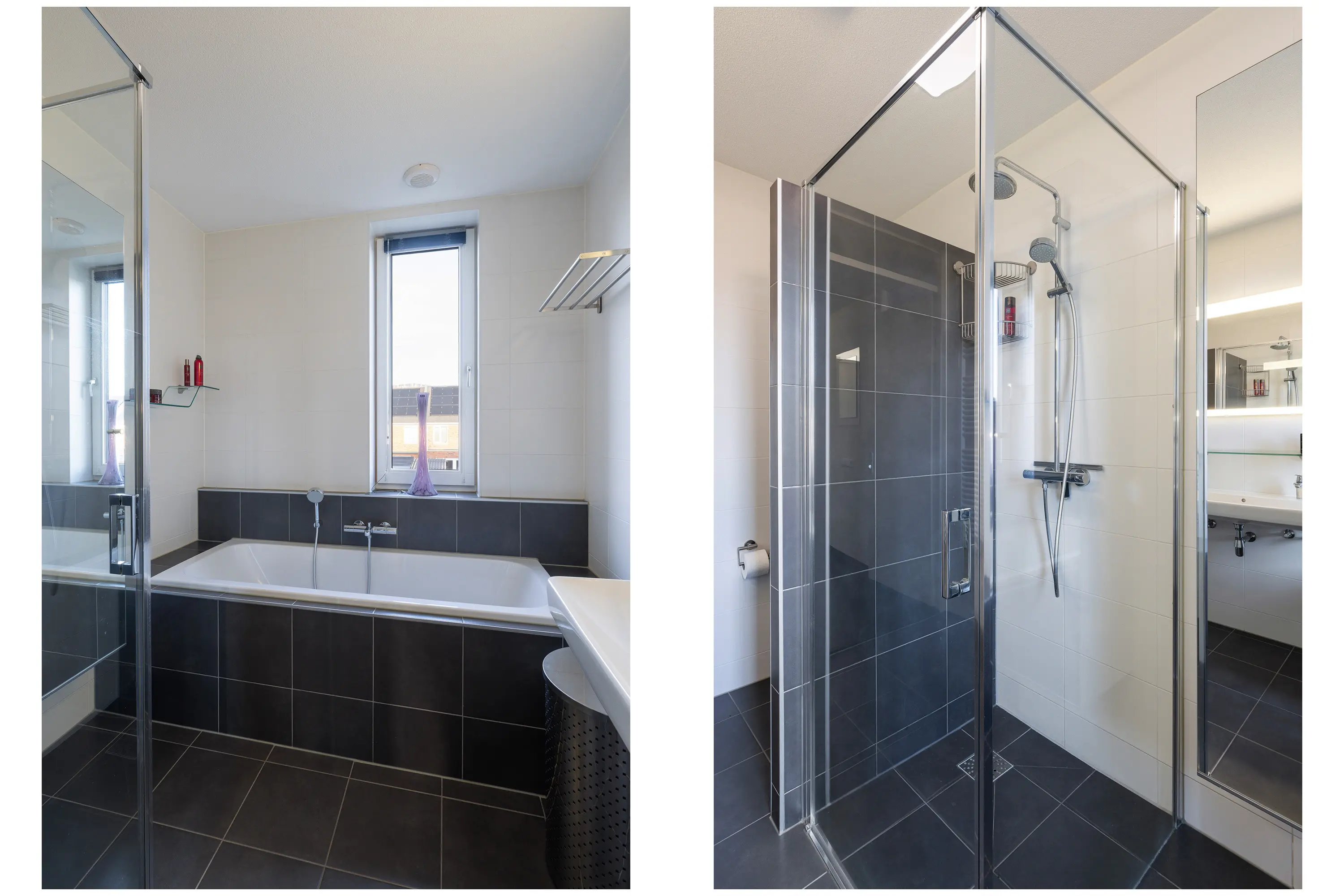Aan de voorzijde van de woning is de volledig betegelde badkamer van alle gemakken voorzien; een ligbad onder het raam, inloopdouche met glazen deur, dubbele wastafel met wandspiegel en tweede toilet.