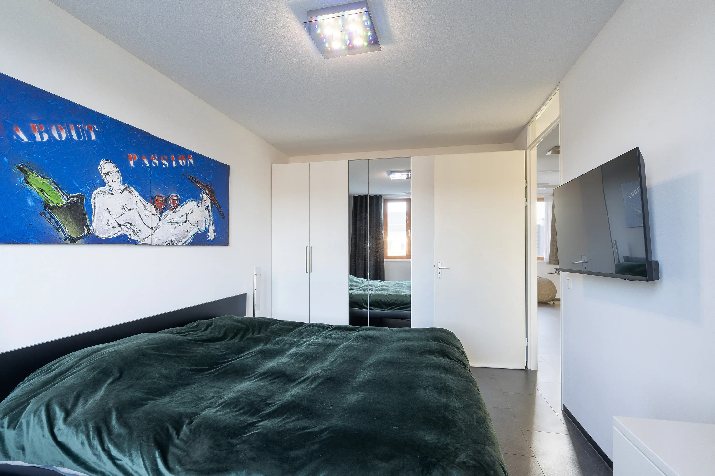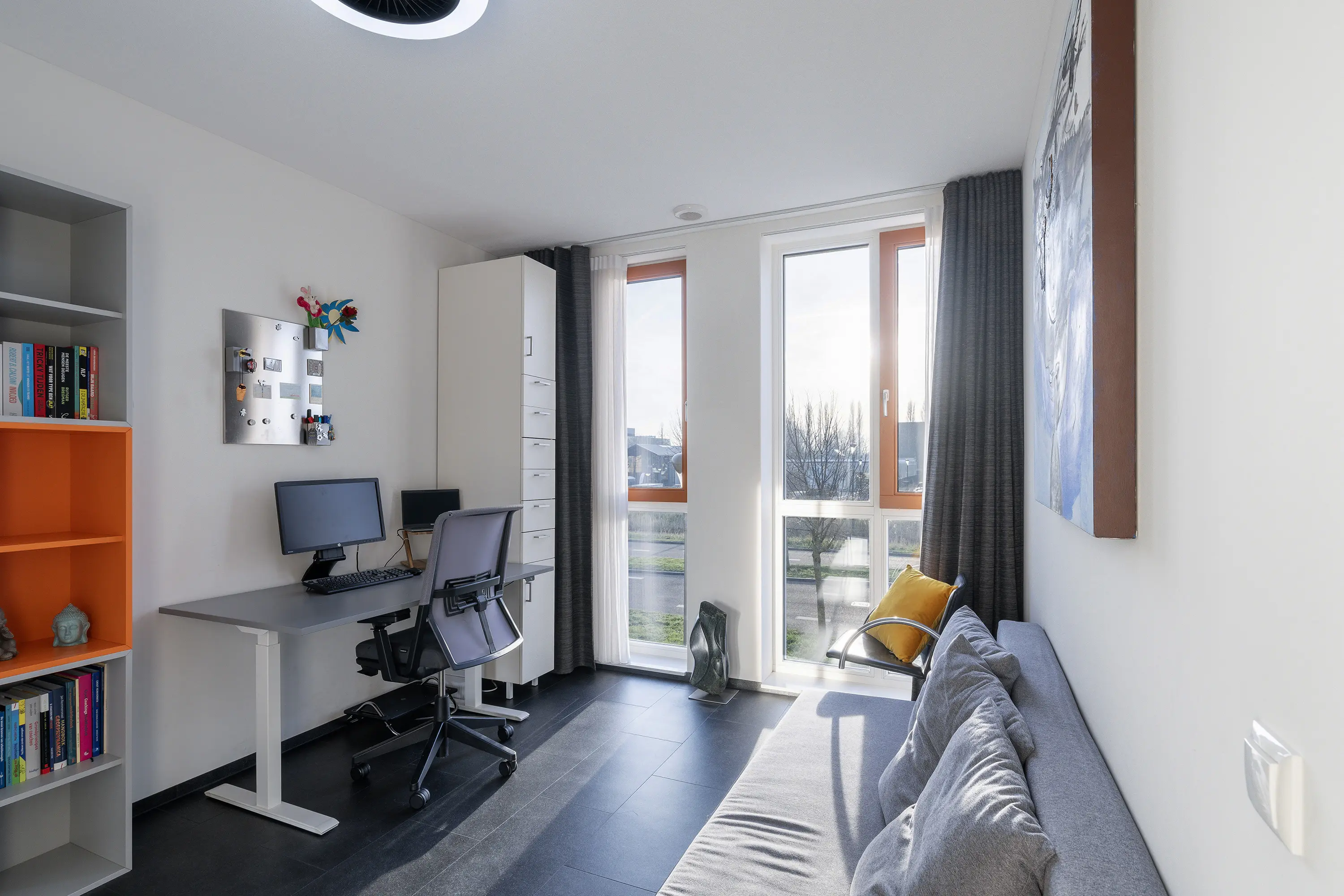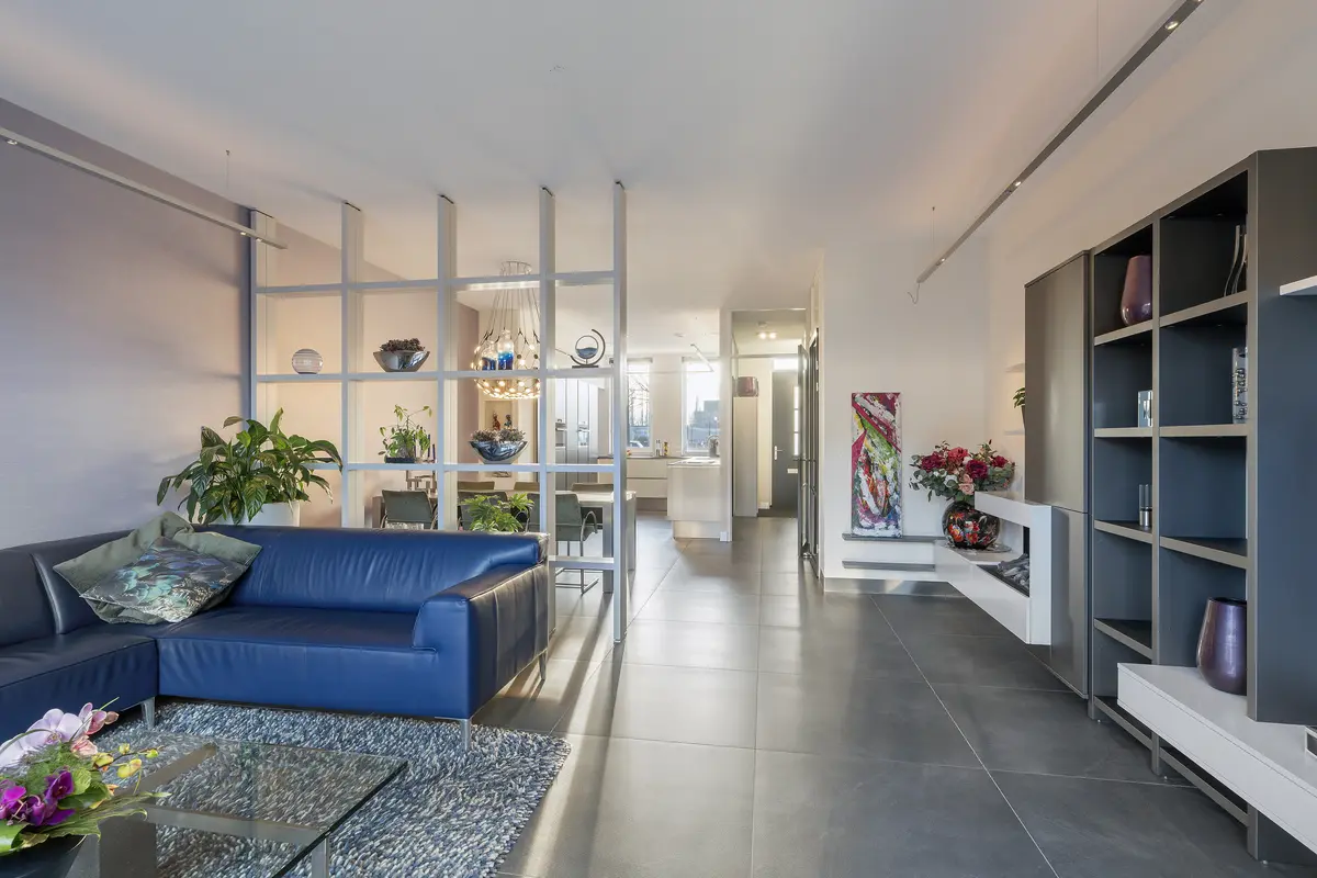 Wat hier direct opvalt is het hoge plafond, wat de kamer nog ruimtelijker maakt dan dat deze al is met een oppervlakte van ca. 45 m2.